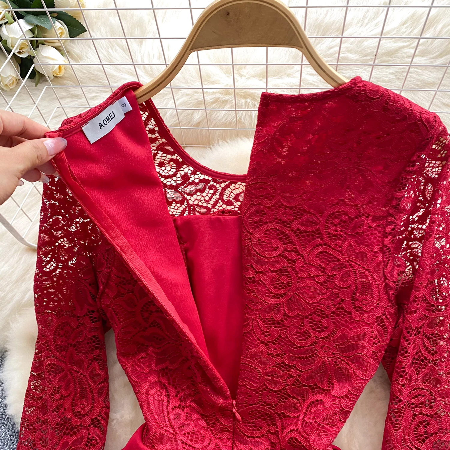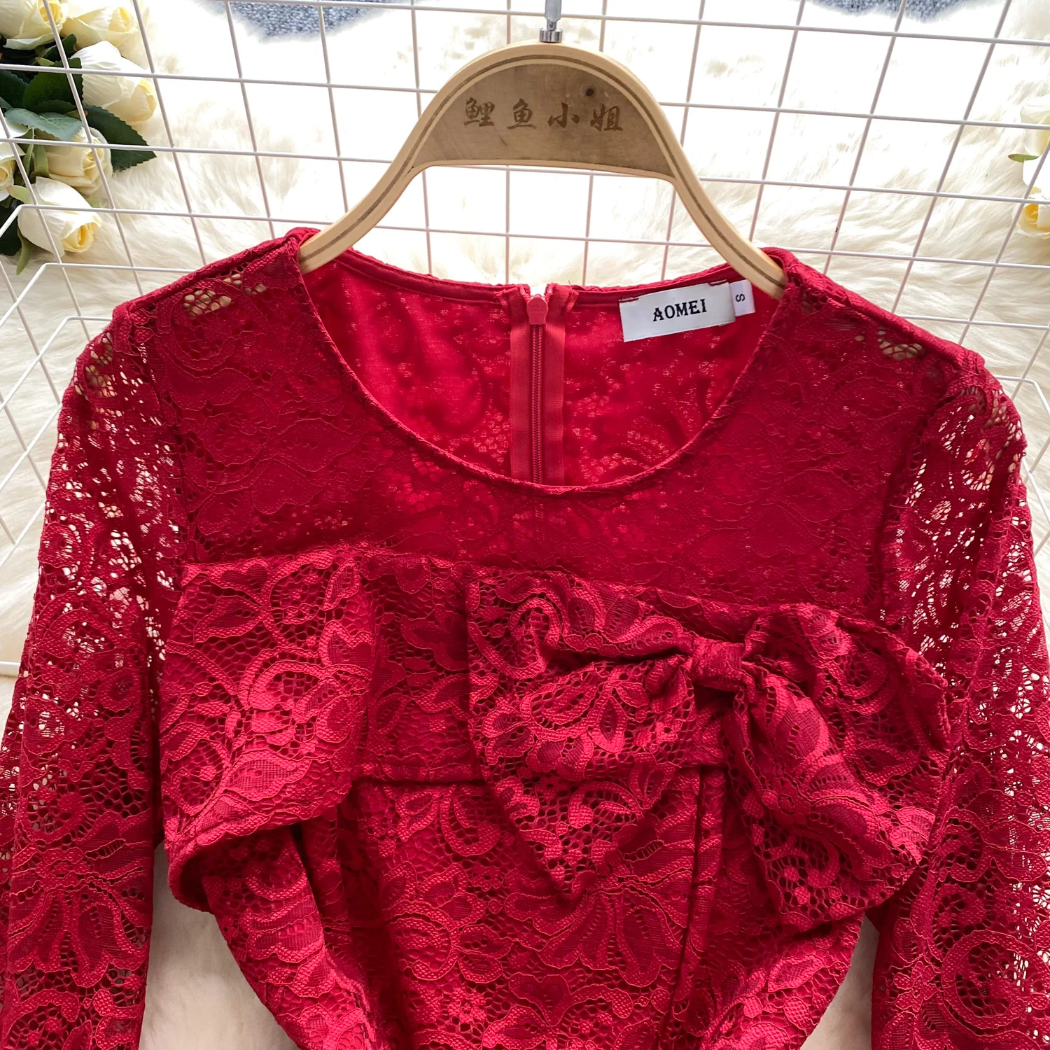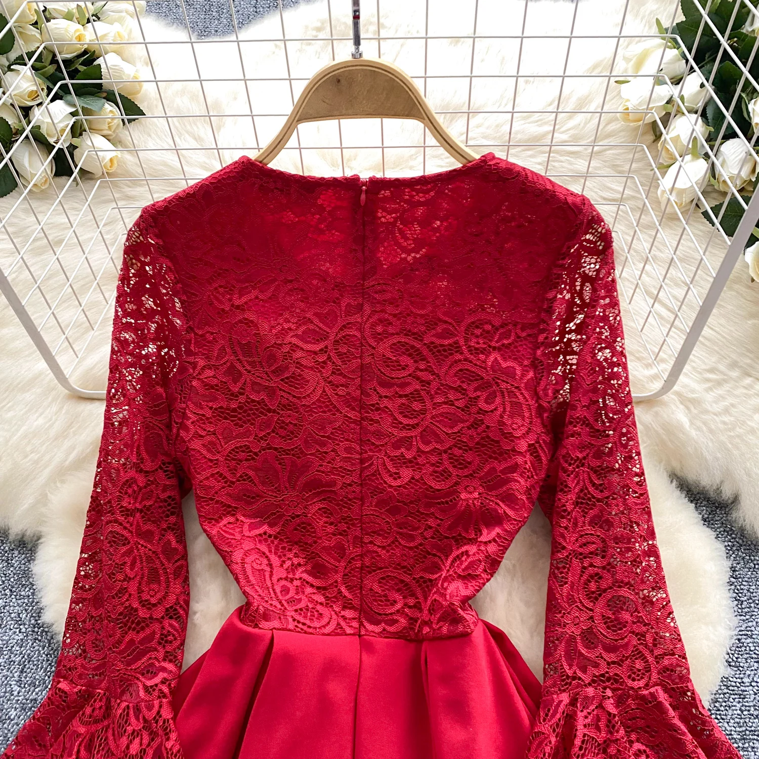 French Women Red Patchwork Lace Birthday Evening Party Dresses Autumn Round Neck Elegant Festival Long Sleeved Bow Pleated Dress