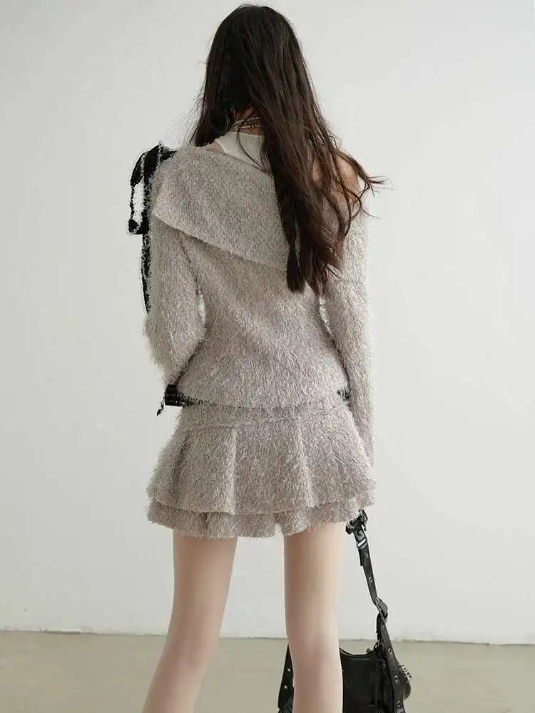 Gray Ribbons Sweater Mini Skirt Two Pieces Suit New Slash Neck Long Sleeve Women Fashion Tide Spring Autumn 2025 1DH9340