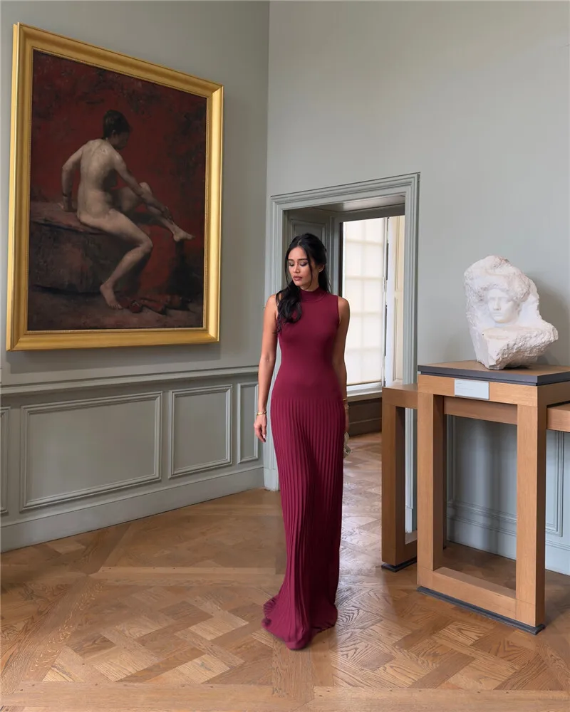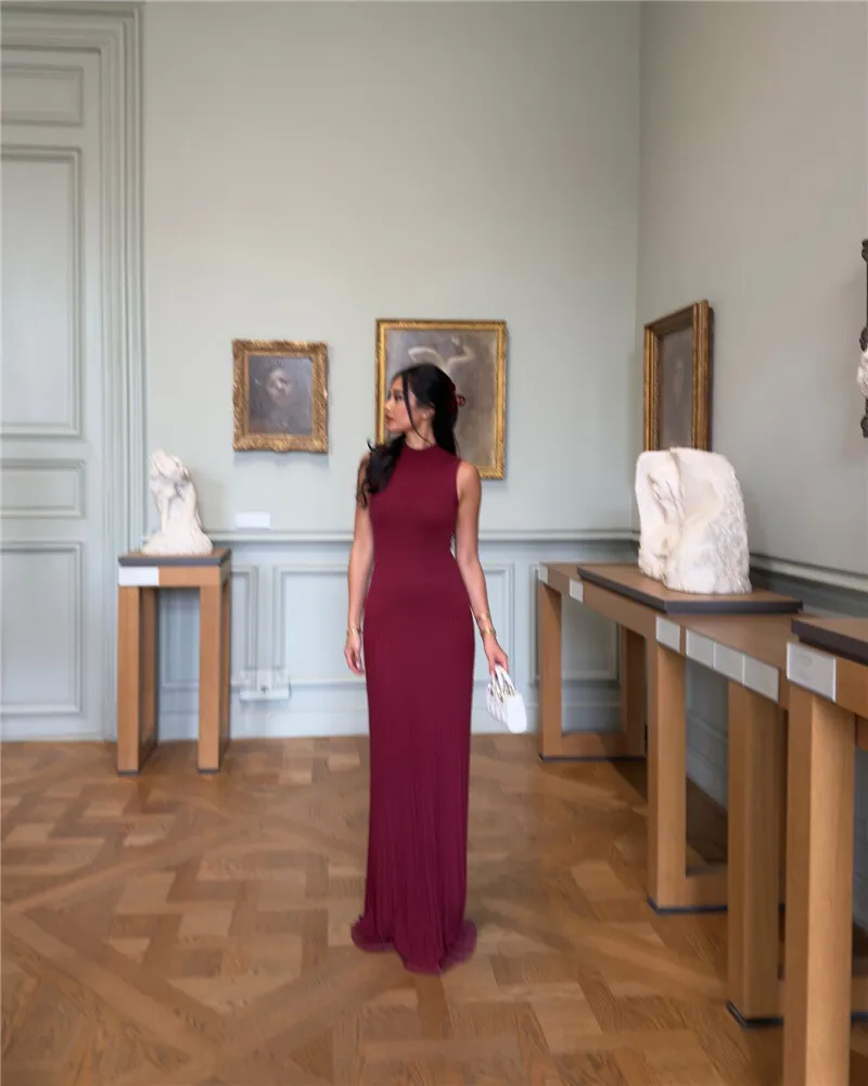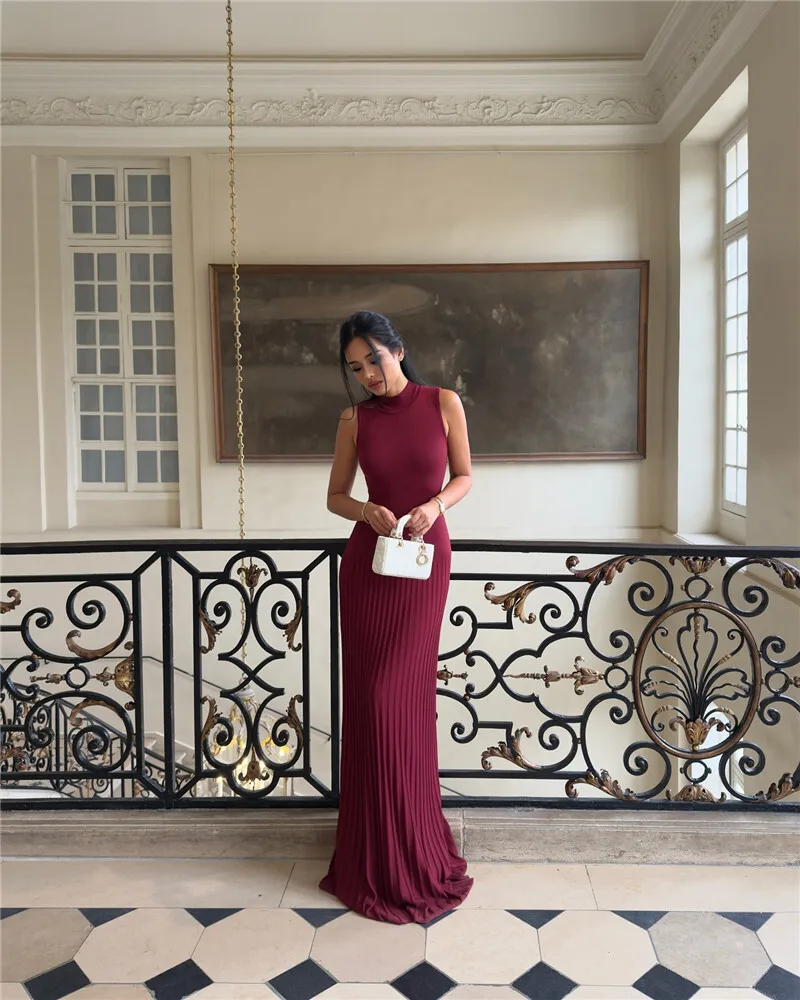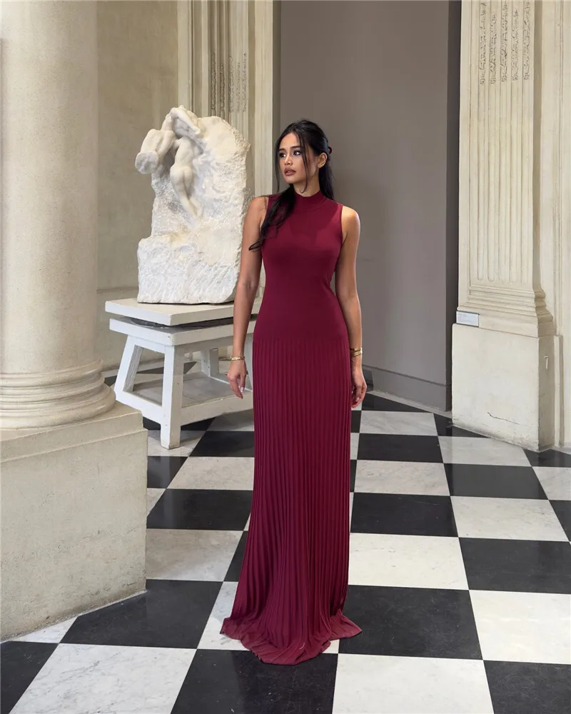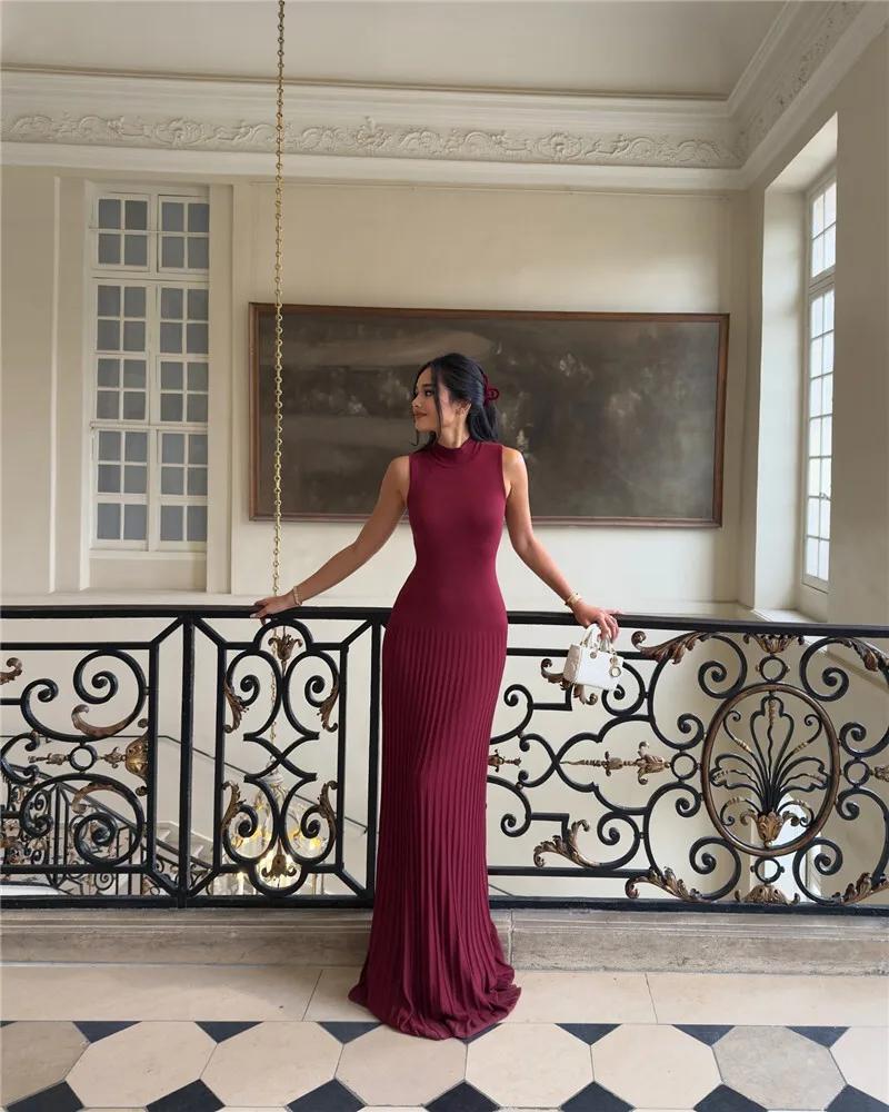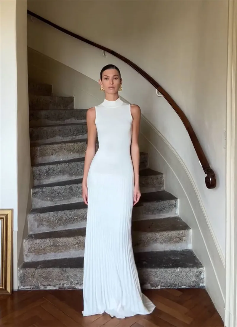 Half High Collar Sleeveless Knit Maxi Dress For Women Fashion Solid Bodycon Sexy Pleated Long Knitted Sweater Dress