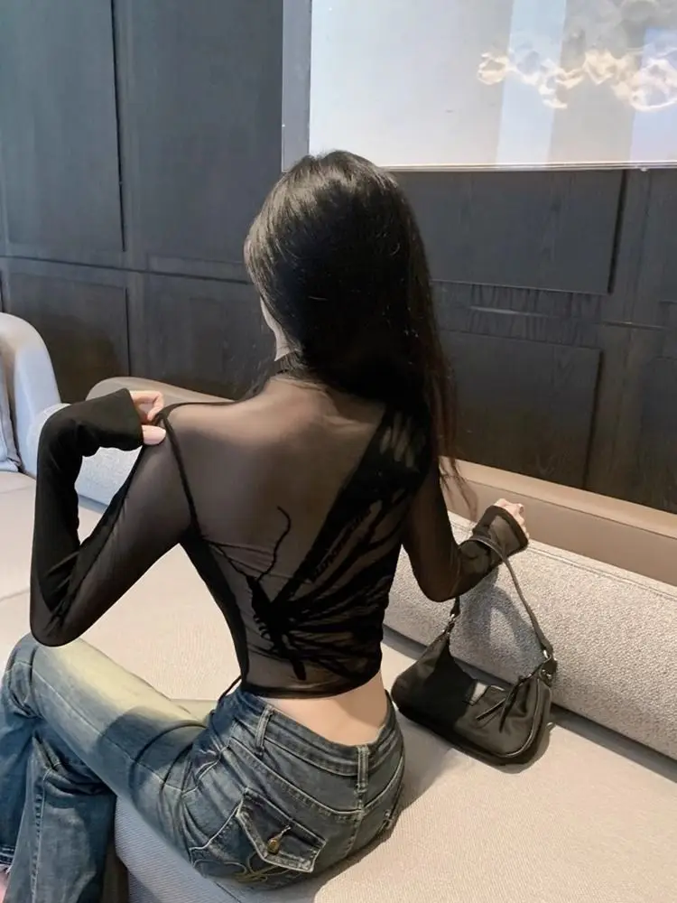 Half Turtleneck Sweet Y2k Aesthetic T-shirt Harajuku Gauze Butterfly Design Women Crop Top New Vintage Sexy Streetwear Slim Tees