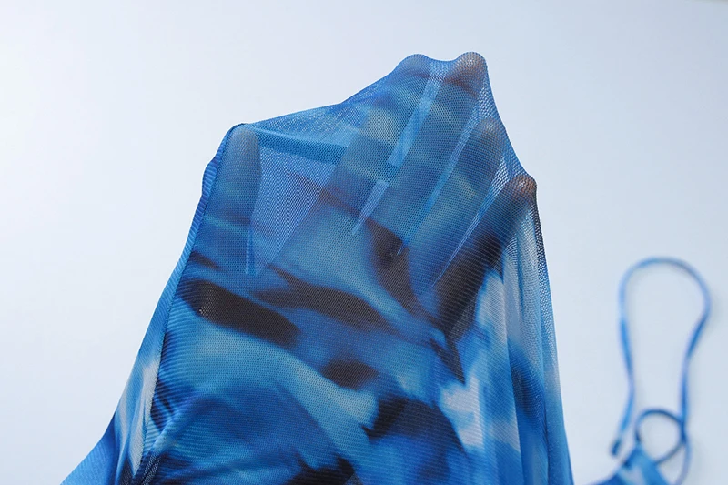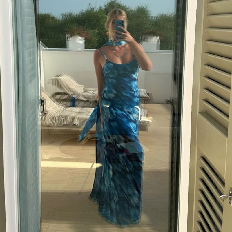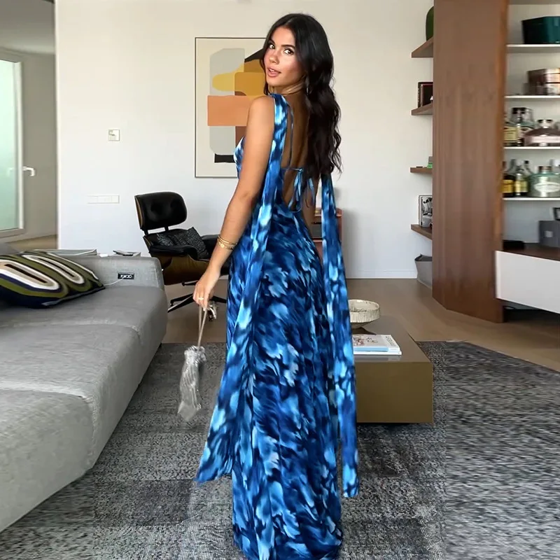 Halter Backless Print Sexy Maxi Dress For Women Gown Elegant Blue Printed Lace-up Sleeveless Evening Long Dress