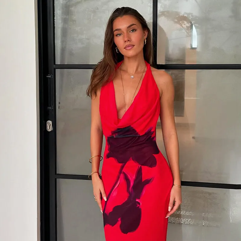Halter Deep V Neck Printed Maxi Dress For Women Gown Red Off-shoulder Sleeveless Backless Fashion Bodycon Long Dress