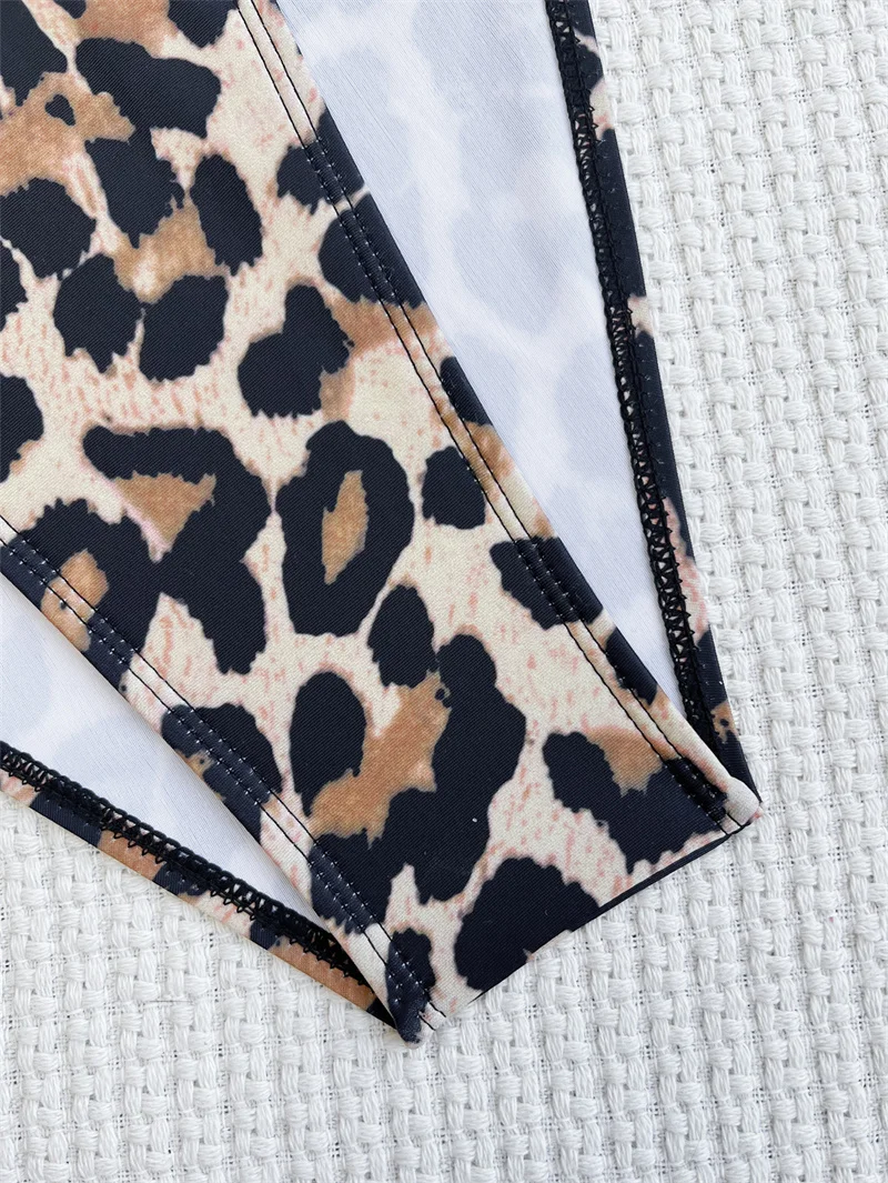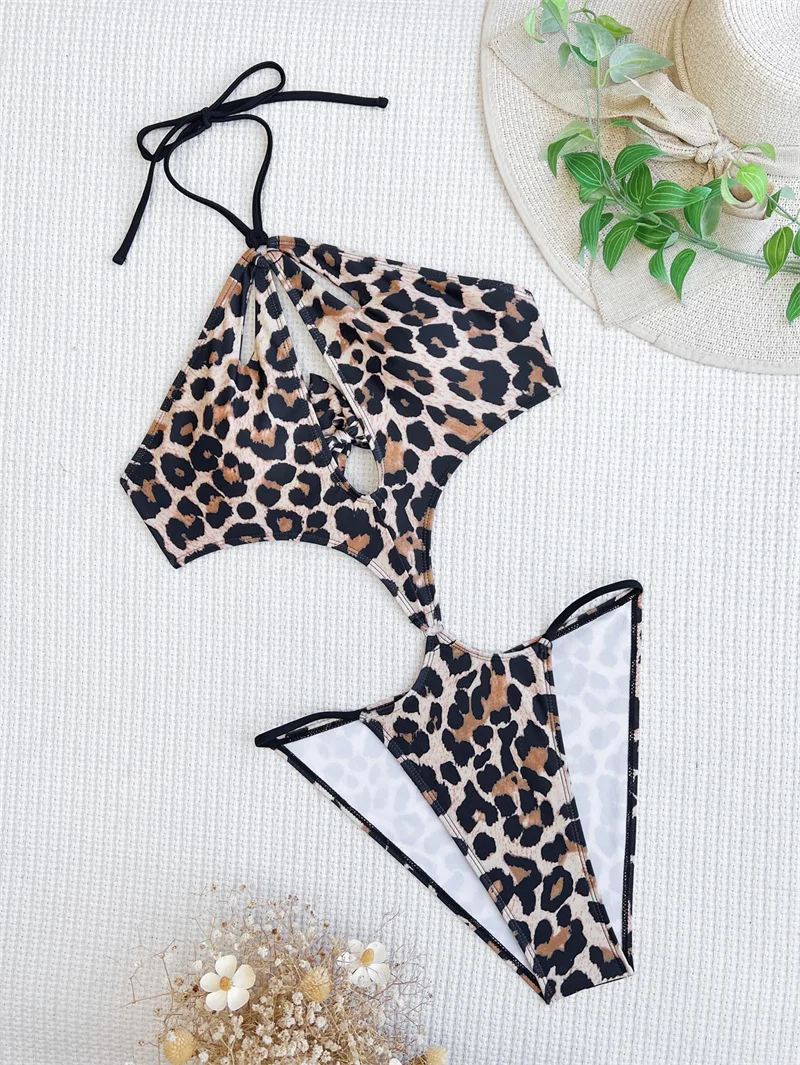 Halter One Piece Swimsuit Leopard Swimwear for Women Sexy Bathing Suit Hollow Out Swimwear Bodysuit