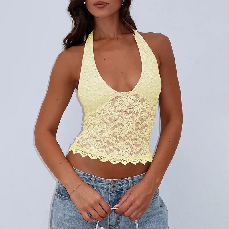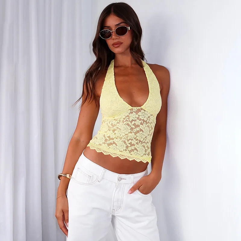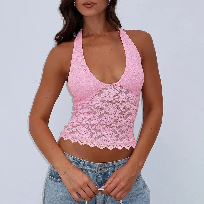 Halter Sleeveless Sexy Crop Tops Women Fashion Deep V Neck Backless Tank Tops Female Elegant Club Skinny Lace Top