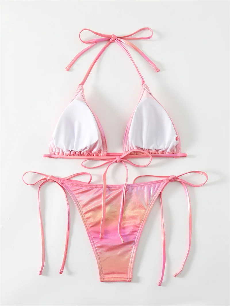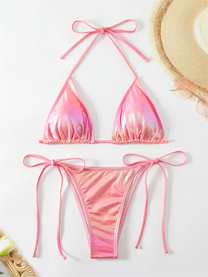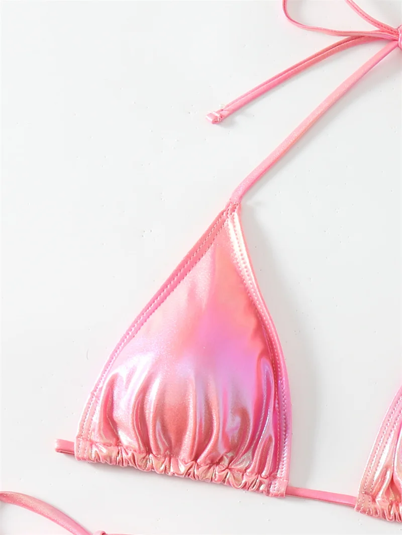 Halter Swimwear Shiny Pink Bikini Sets 2024 Sexy Bandage Women Swimsuit Brazilian Biquini Thong Bathing Suit