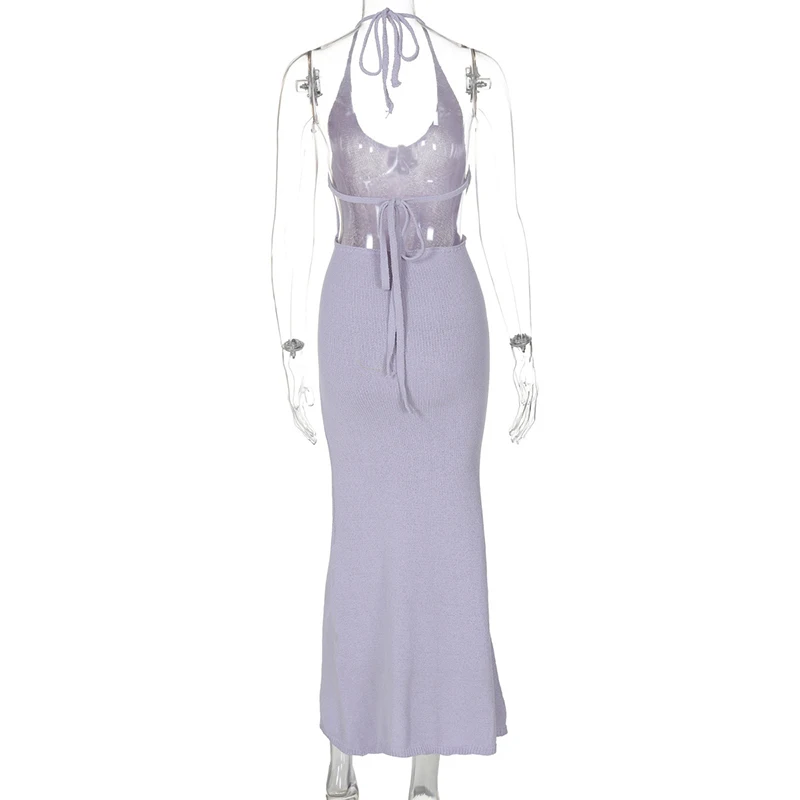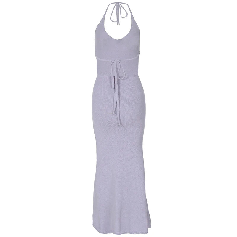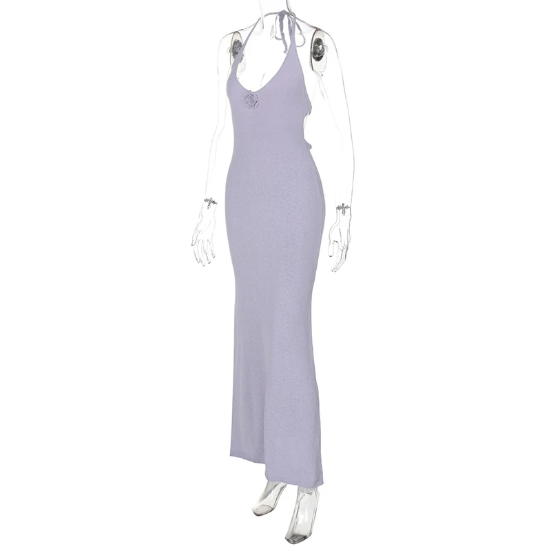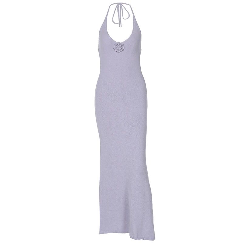 Halter V Neck Floral Sexy Maxi Dress For Women Elegant Spaghetti Strap Sleeveless Backless Bodycon Long Knit Dress