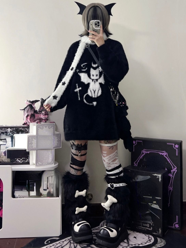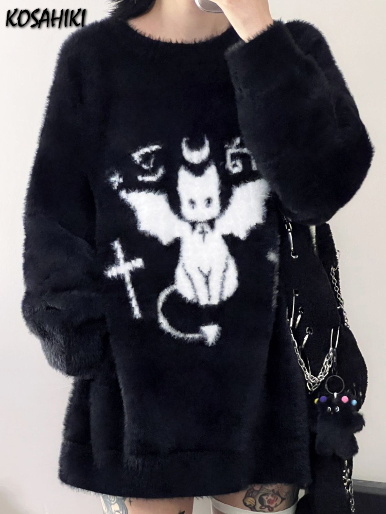 Harajuku Gothic Casual Oversized Knitted Jumpers Grunge Cartoon Sweater Fashion Knitwear Y2k Aesthetic Balack Loose Pullover