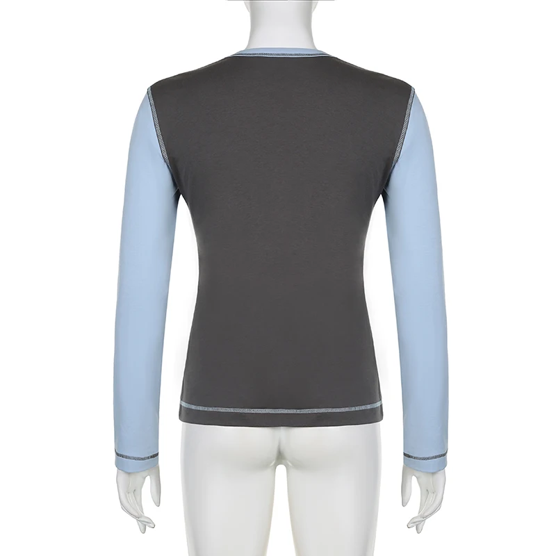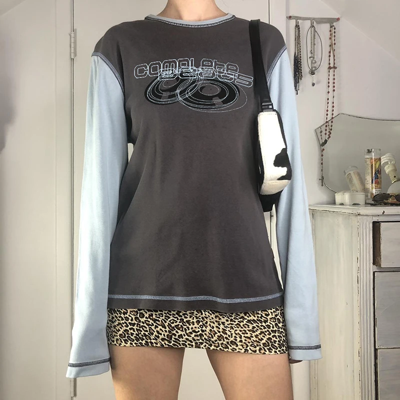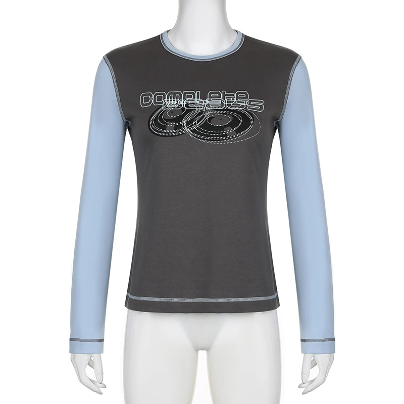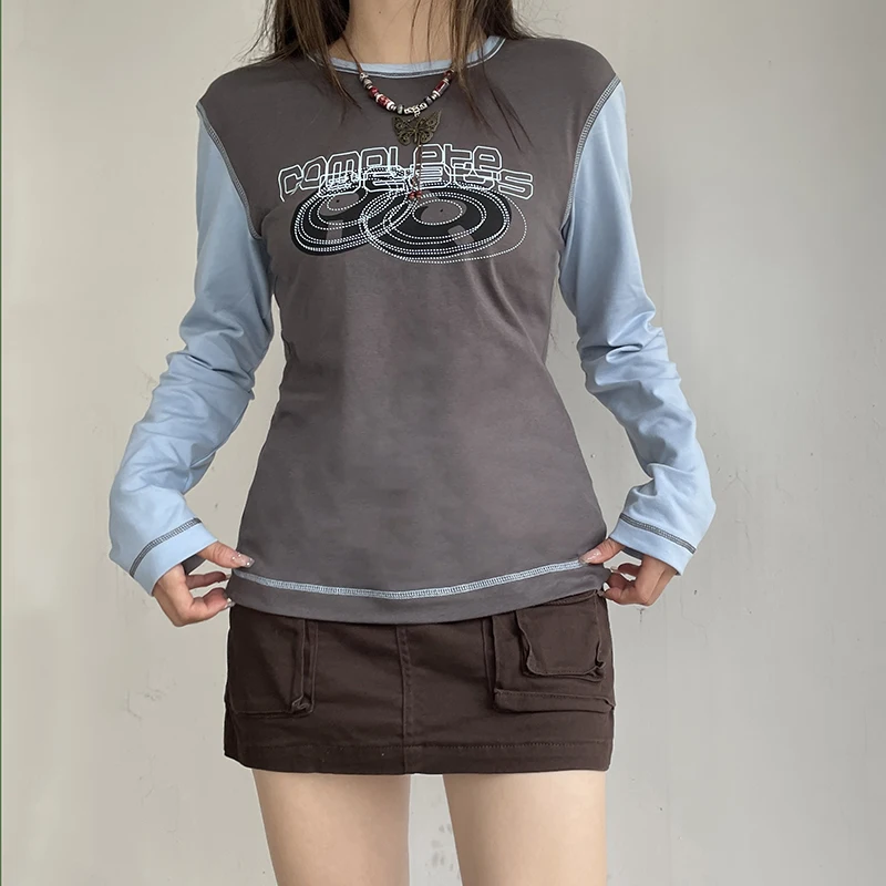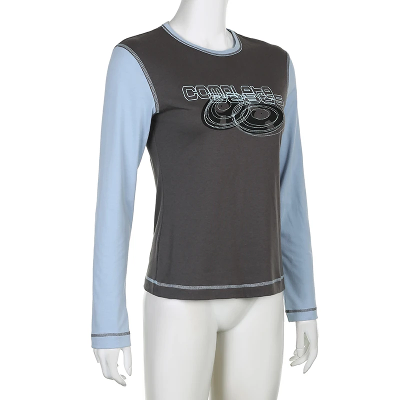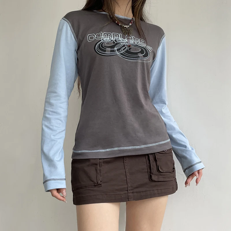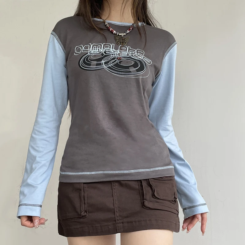 Harajuku Letter Printed Autumn T Shirt Women Line Stitching Casual Pullover Top Contrast Preppy Style Sweats Outfits