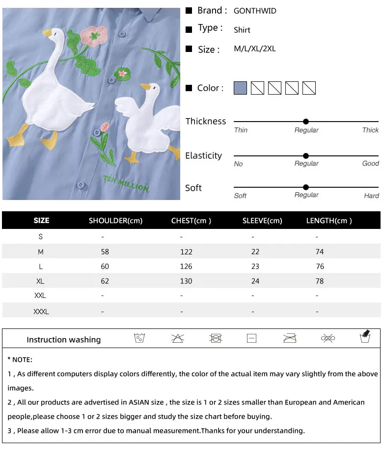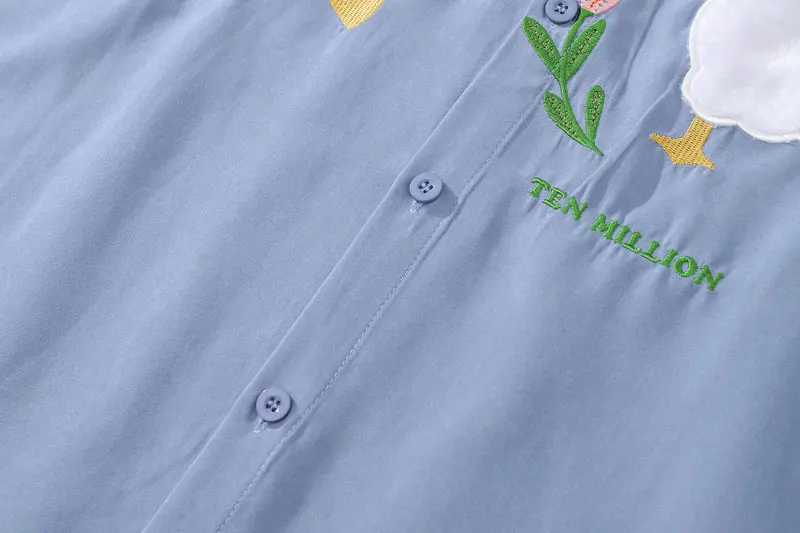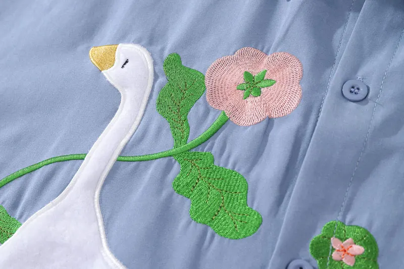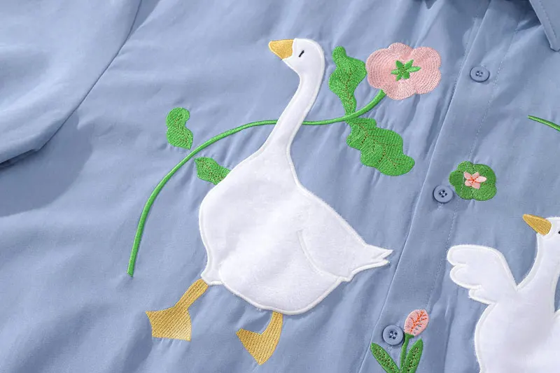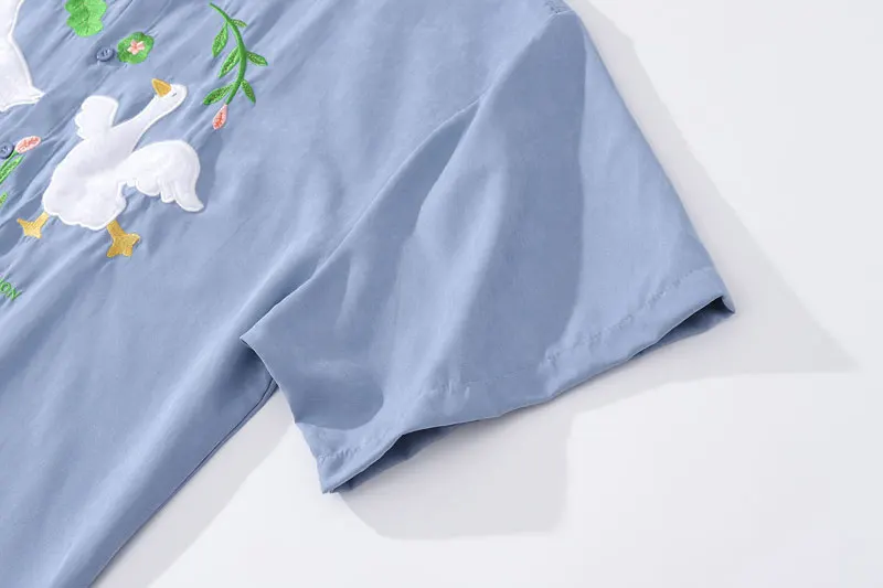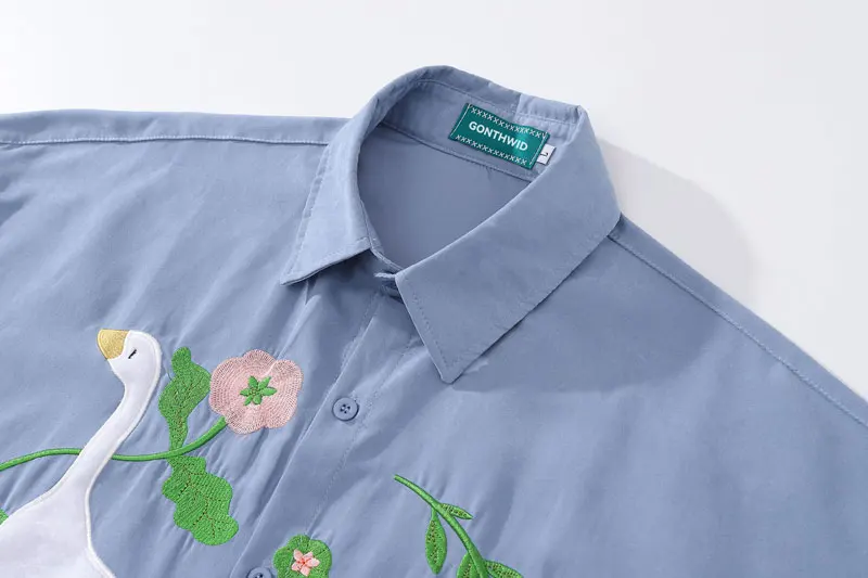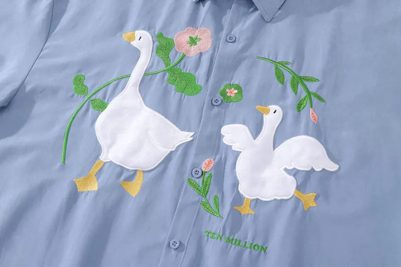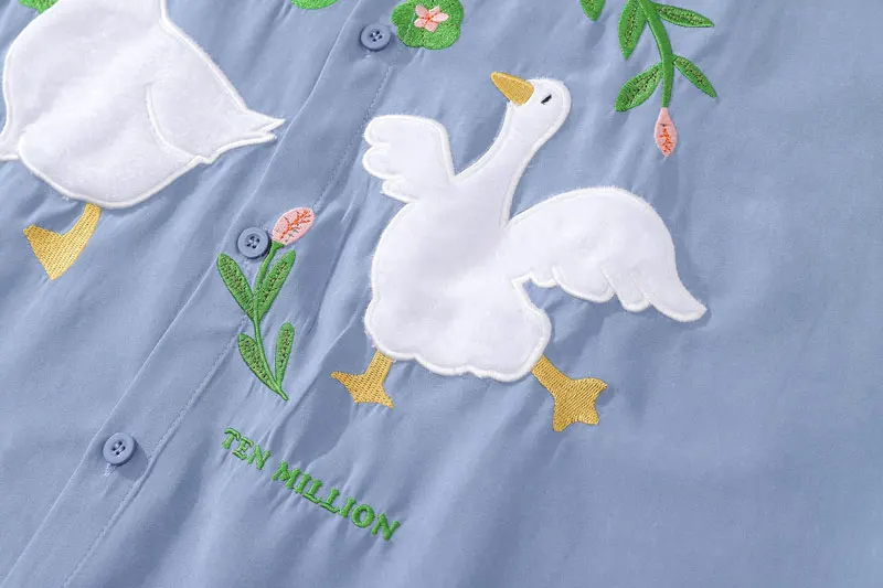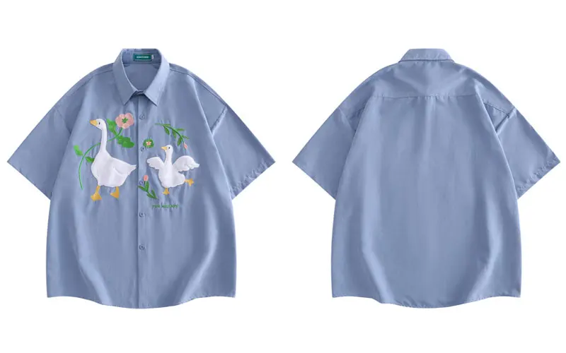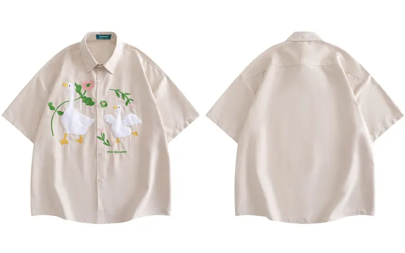 Harajuku Men Shirts Funny Embroidery Flower White Duck Goose Patch Short Sleeve Blouse Summer Loose Button Up Shirt Streetwear