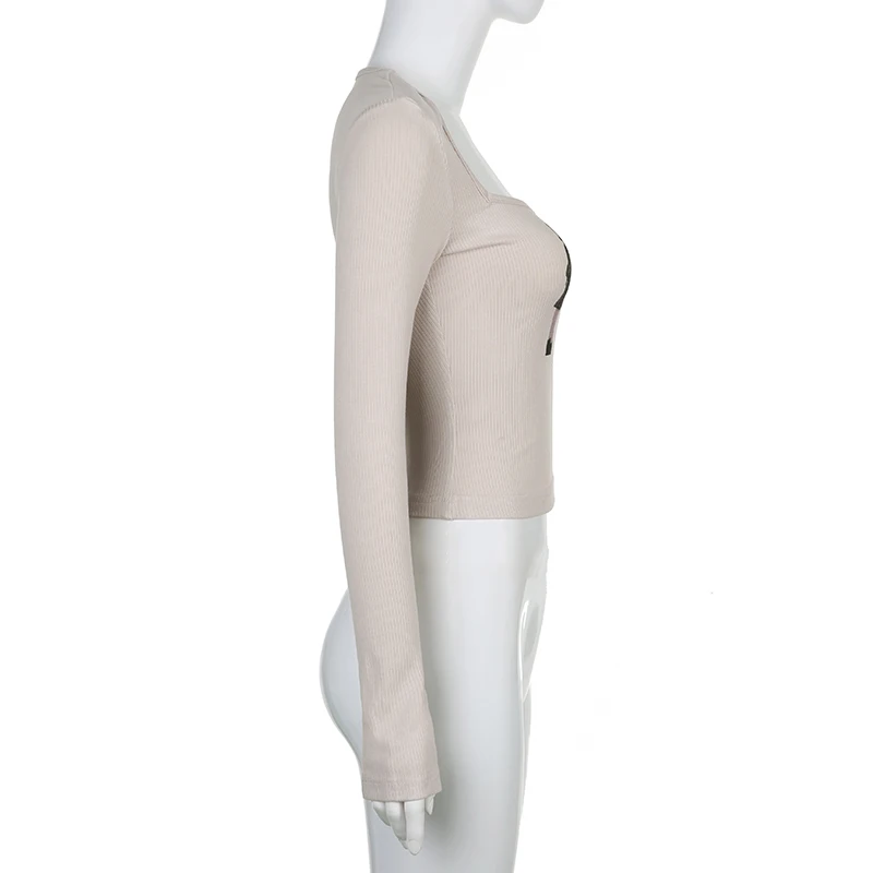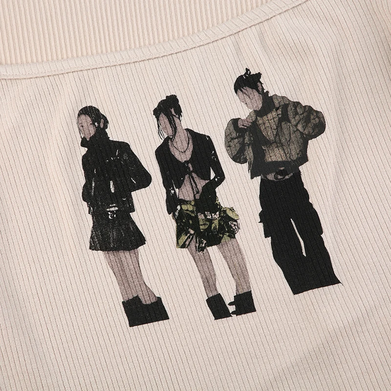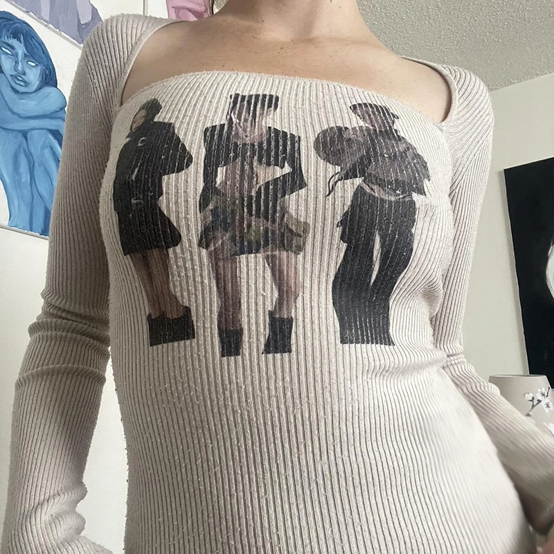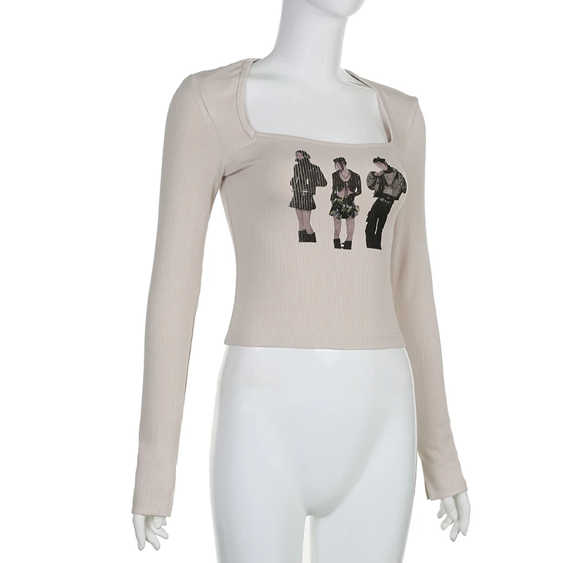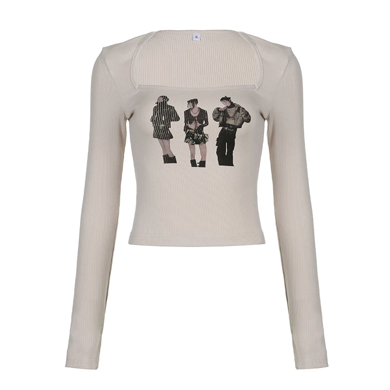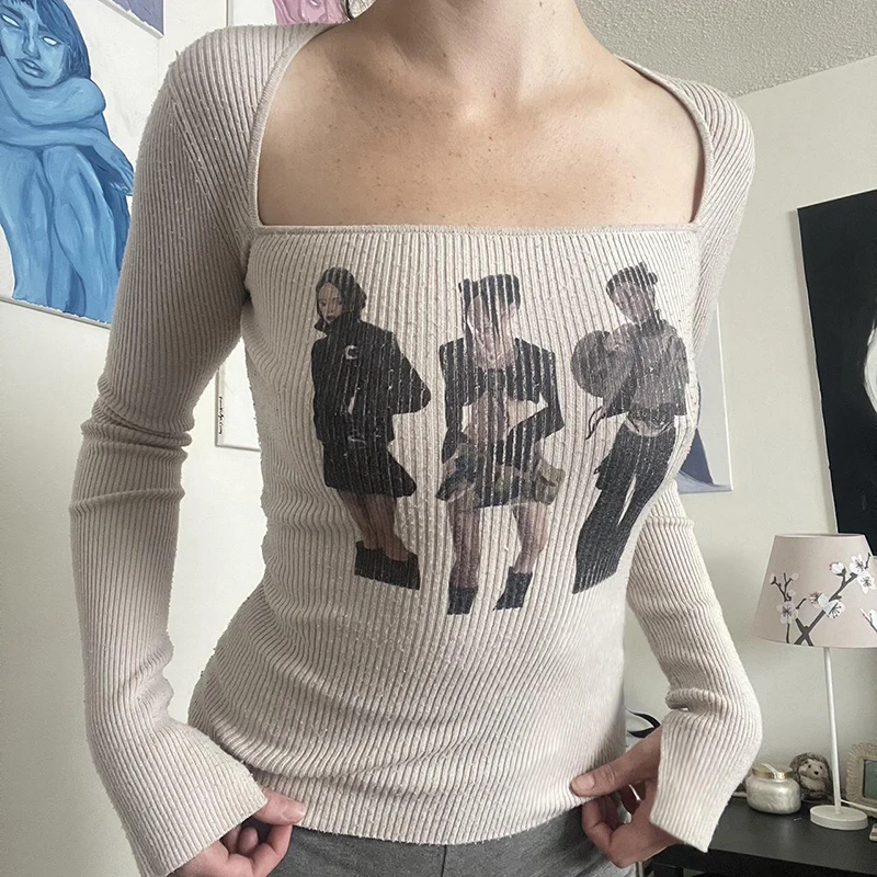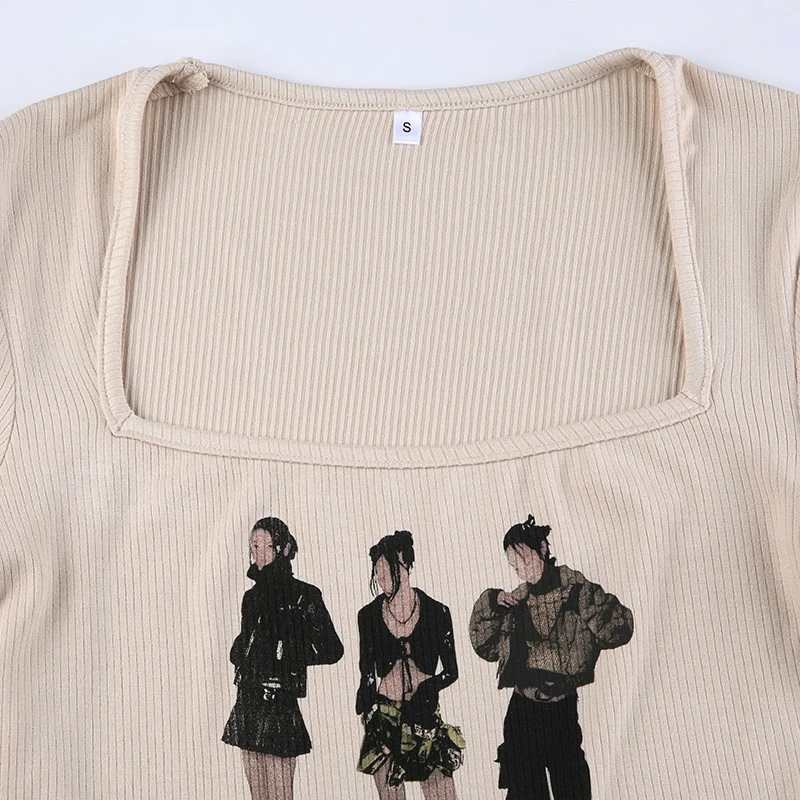 Harajuku Y2K Graphic Tee Women Printing Slim Square Neck Japanese Pullover Autumn Top Tshirt Knit Pattern Clothes New
