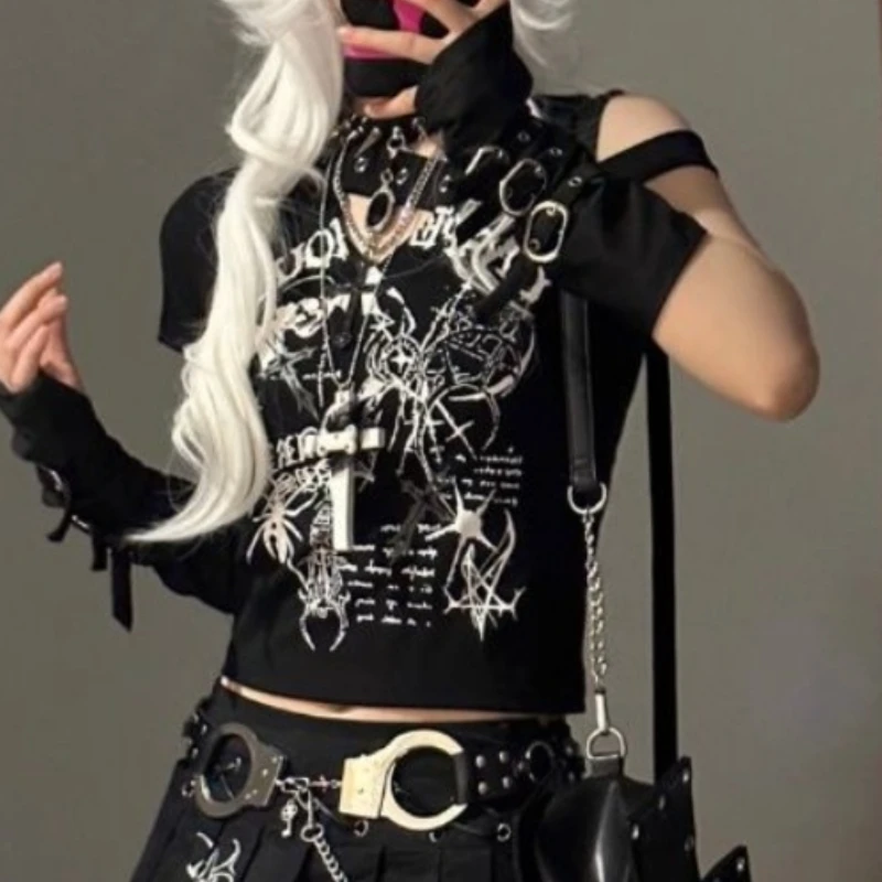 Harajuku Y2k Tshirts for Women Fashion Japanese Camisetas Black Punk Skull Tees Crop Tops Skew Collar Tunic Off Shoulder T-shirt