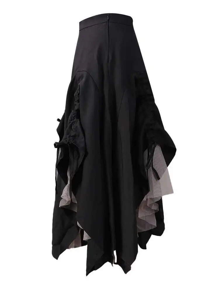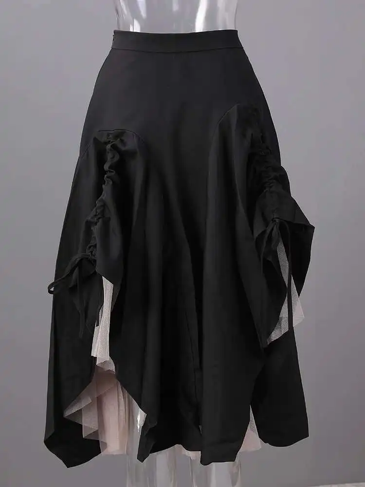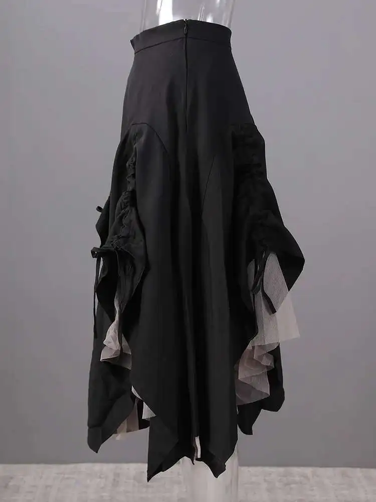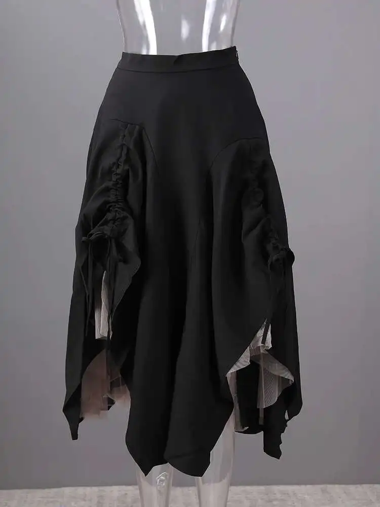 High Elastic Waist Black Drawstring Mesh Irregular A-line Half-body Skirt Women Fashion Tide New Spring Autumn 2025 2Q1136