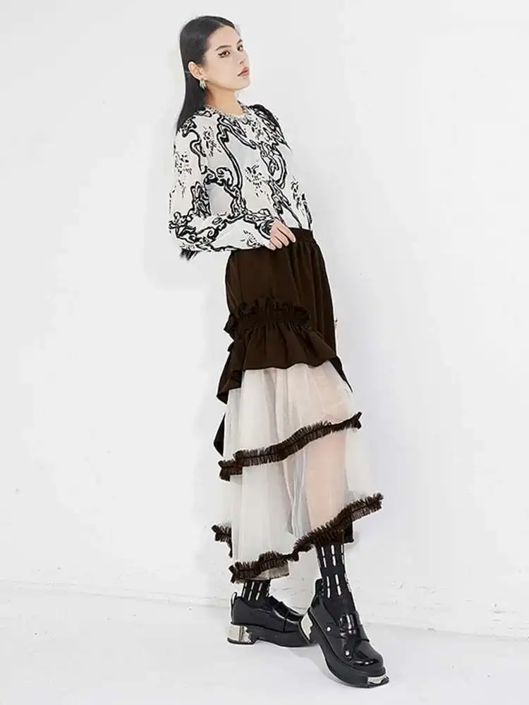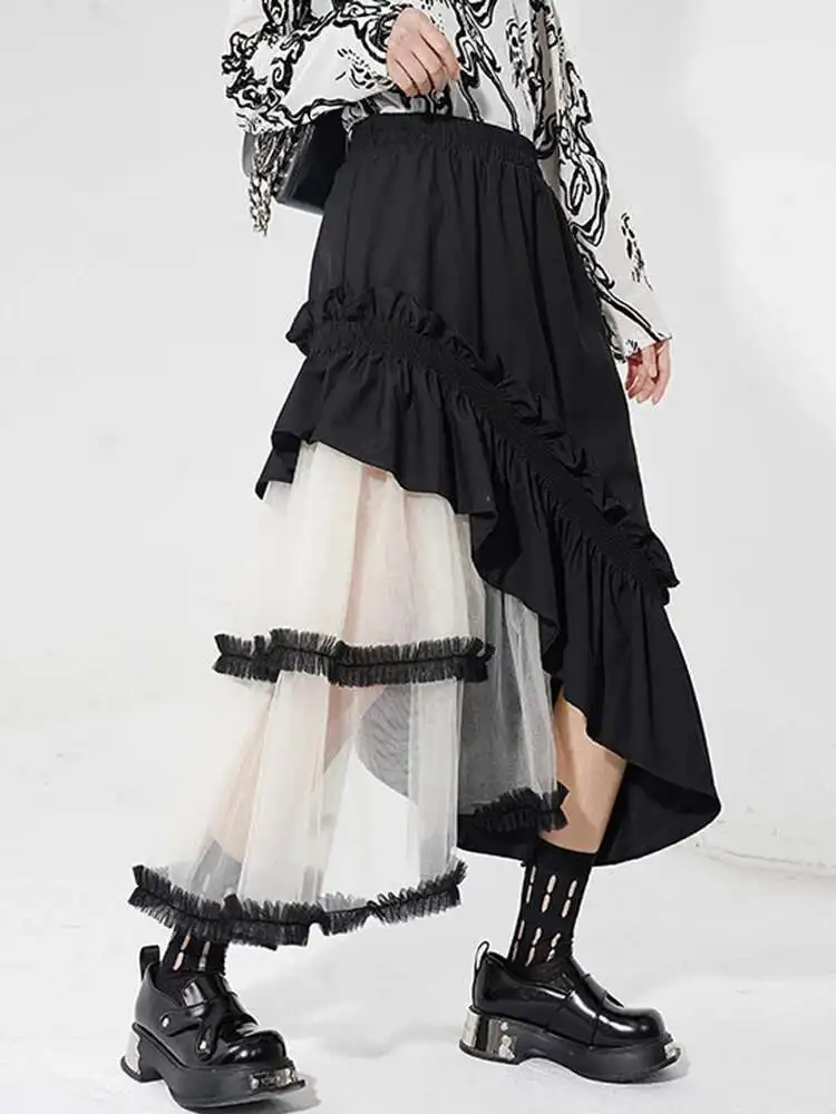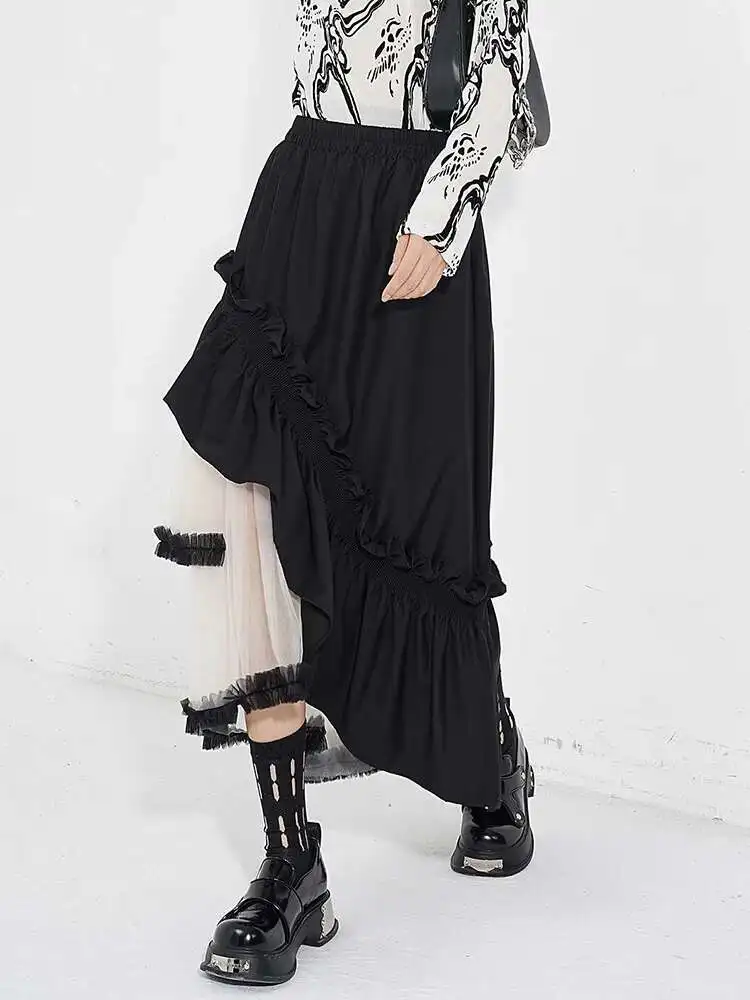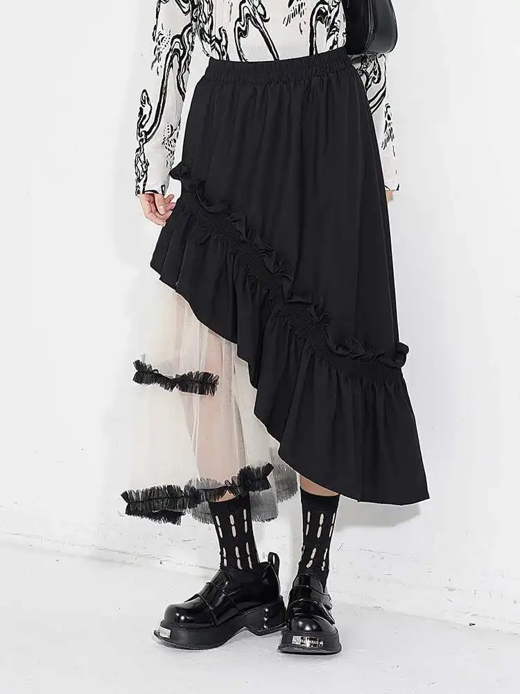 High Elastic Waist Black Irregular Ruffles Mesh A-line Half-body Skirt Women Fashion Tide New Spring Autumn 2025 1DH4926