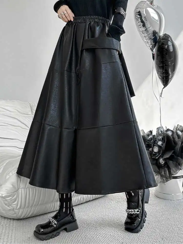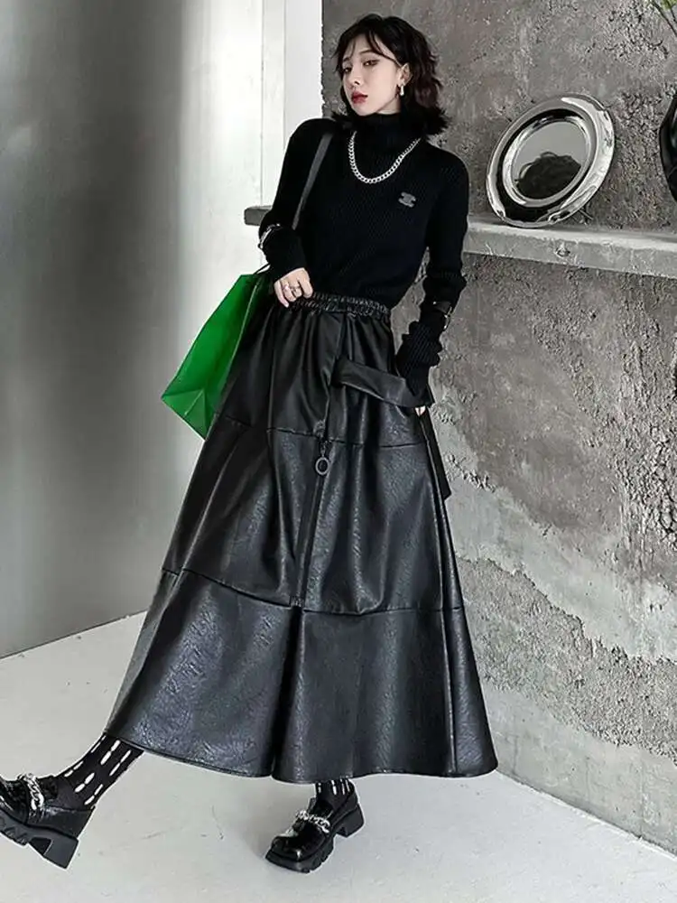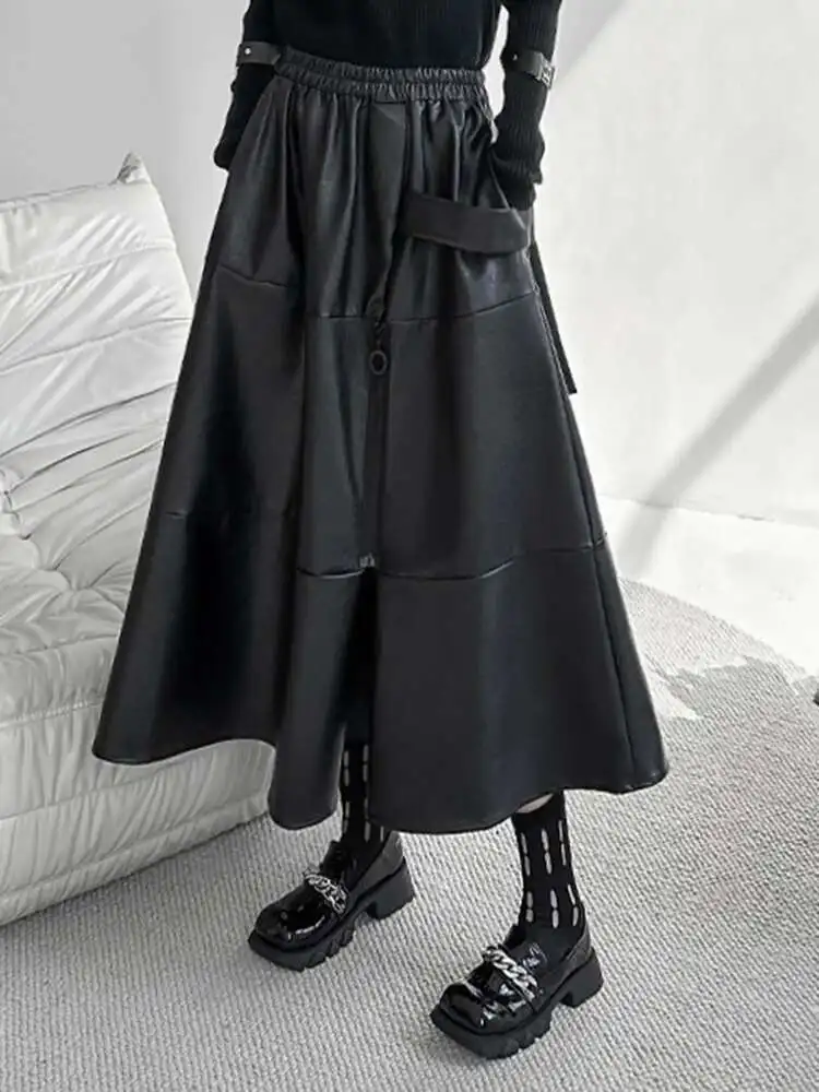 High Elastic Waist Black Pu Leather Zipper Long A-line Half-body Skirt Women Fashion Tide New Spring Autumn 2025 1DH4646