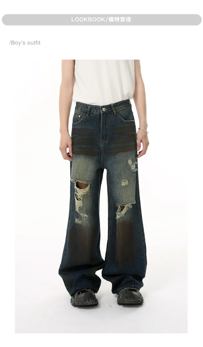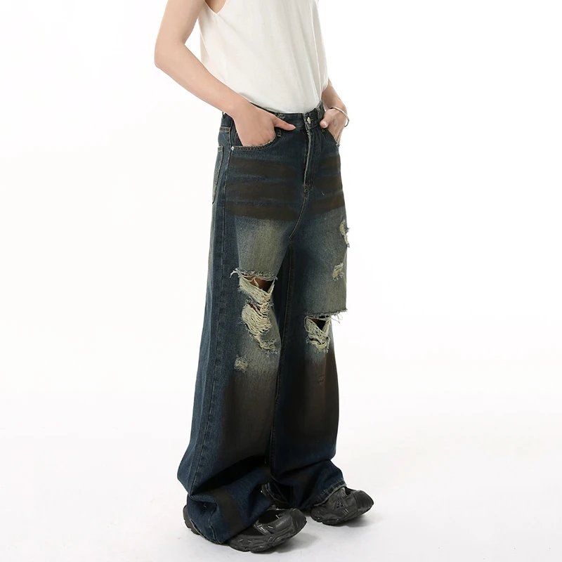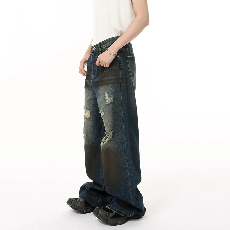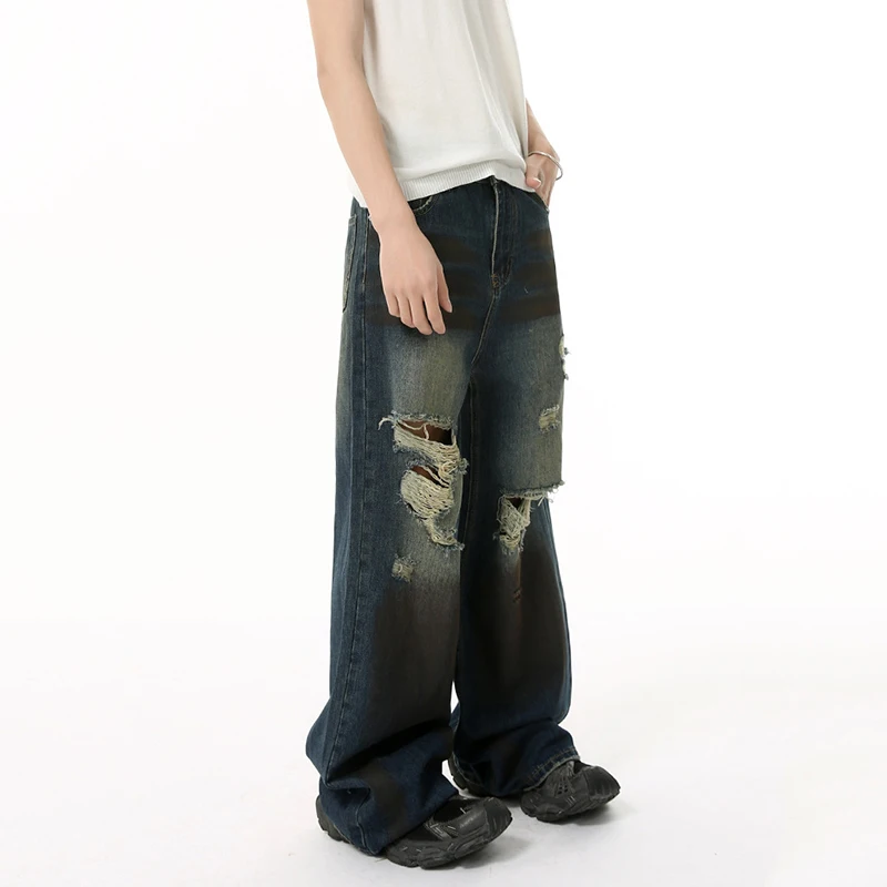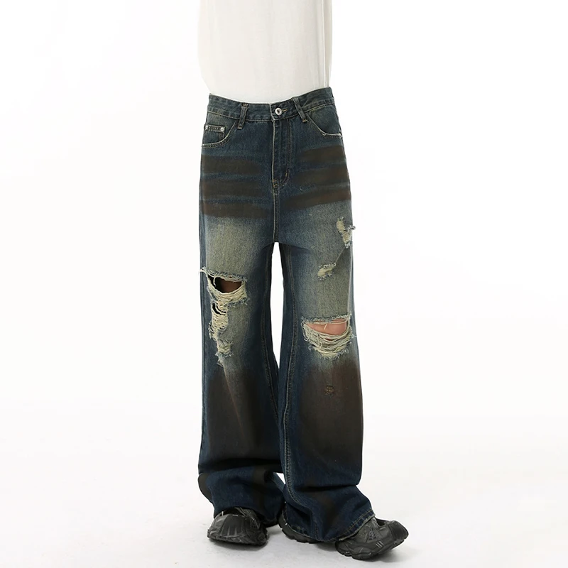 High Street Men's Denim Pants New Worn-out Contrast Color Wide Leg Jeans Hole Straight Personailty Male Trousers 9W1839