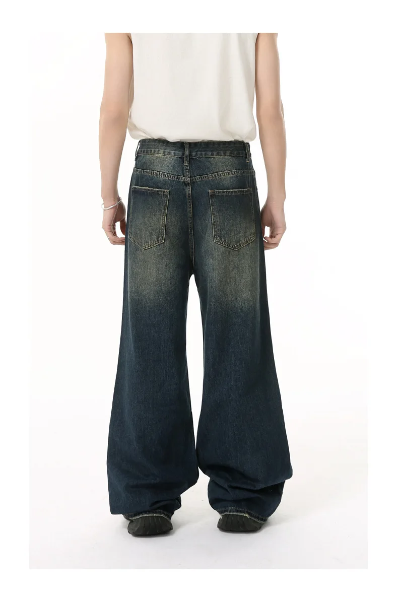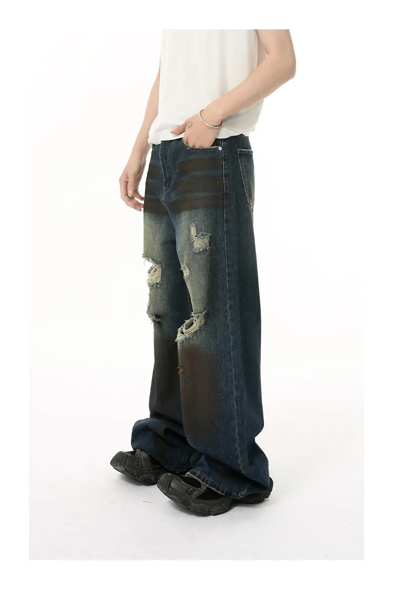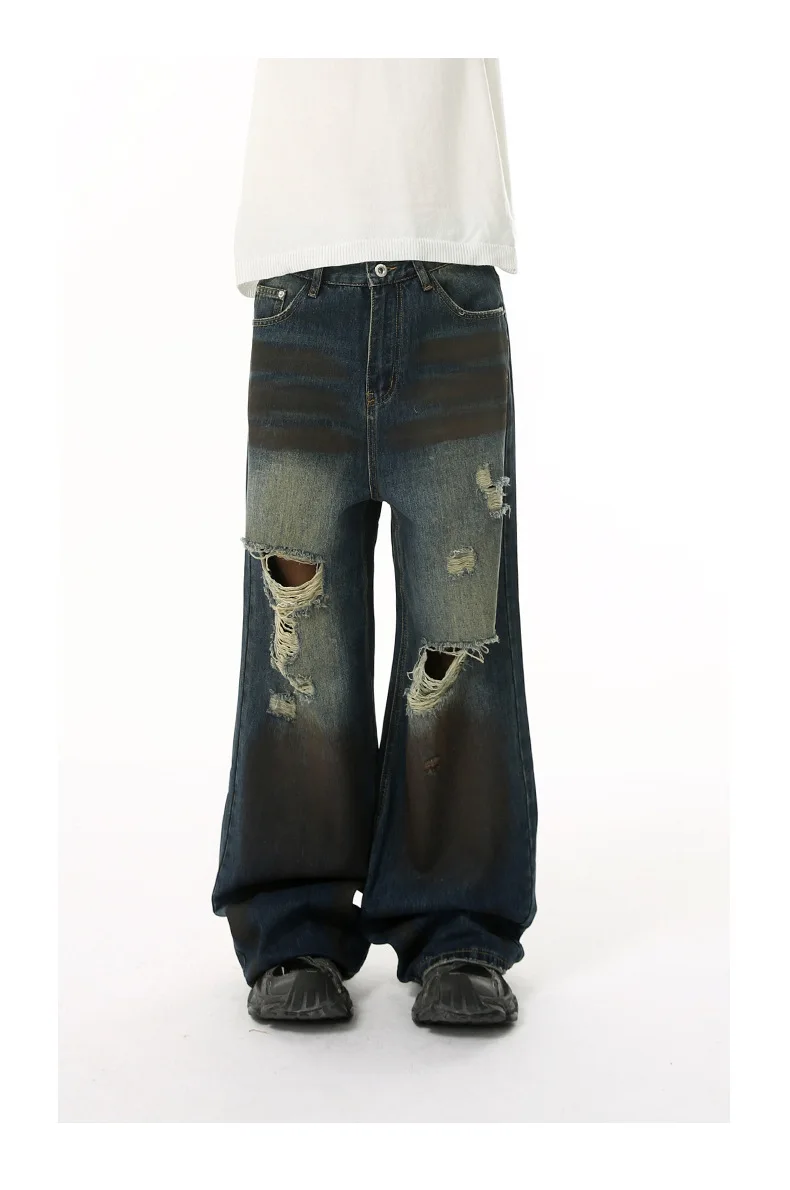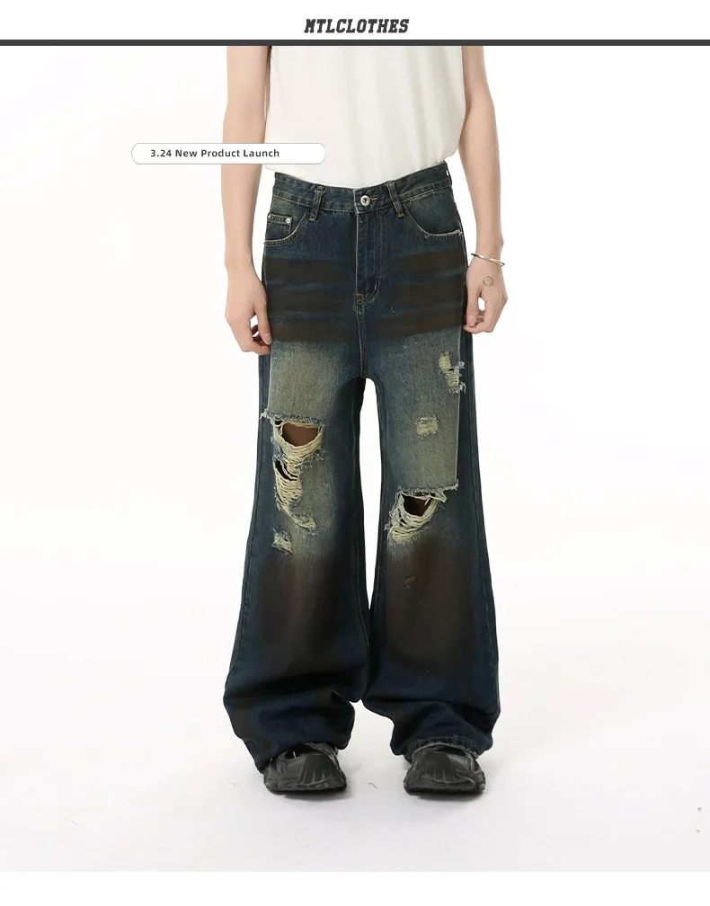 High Street Men's Denim Pants New Worn-out Contrast Color Wide Leg Jeans Hole Straight Personailty Male Trousers 9W1839