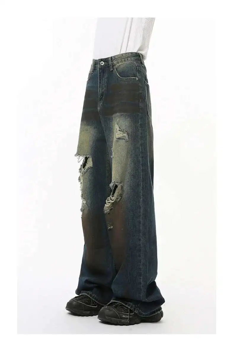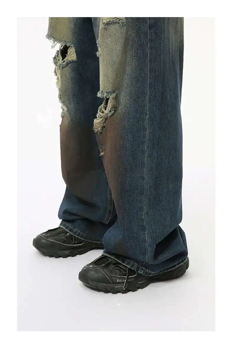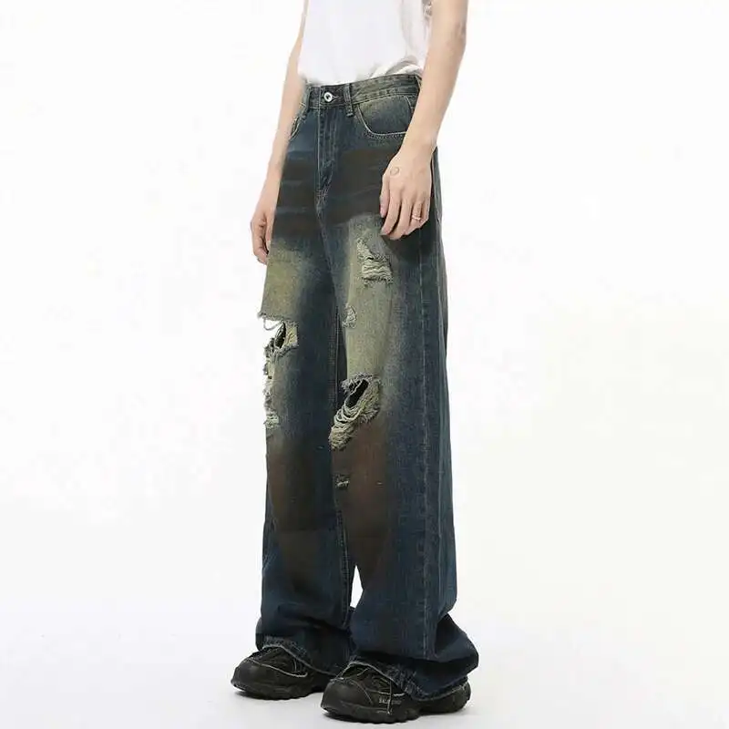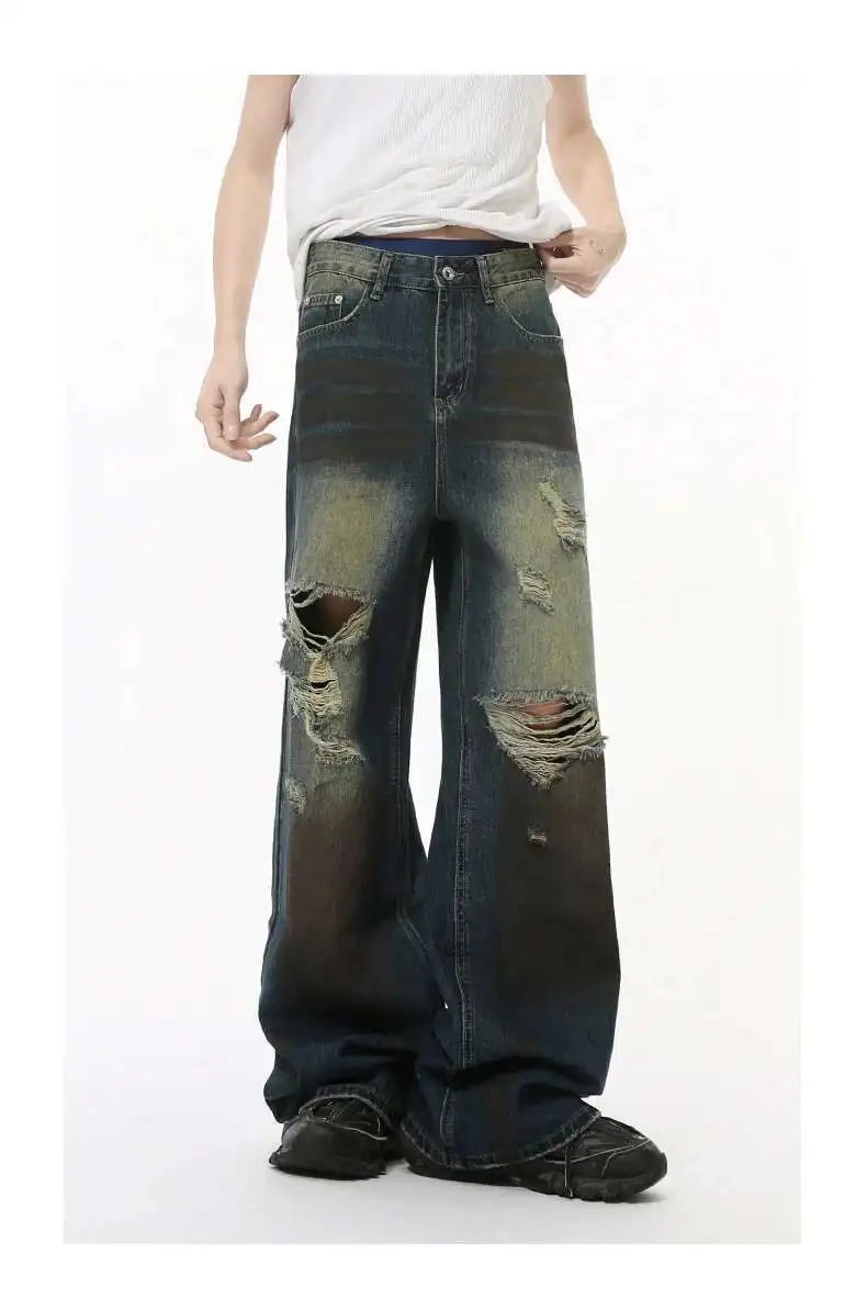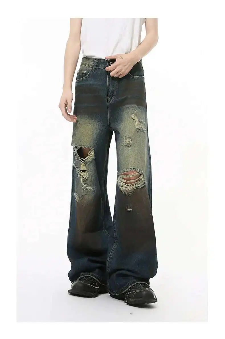 High Street Men's Denim Pants Worn-out Hole Design Contrast Color Straigh Bottom Wide Leg Loose Male Denim Spring 9C8204