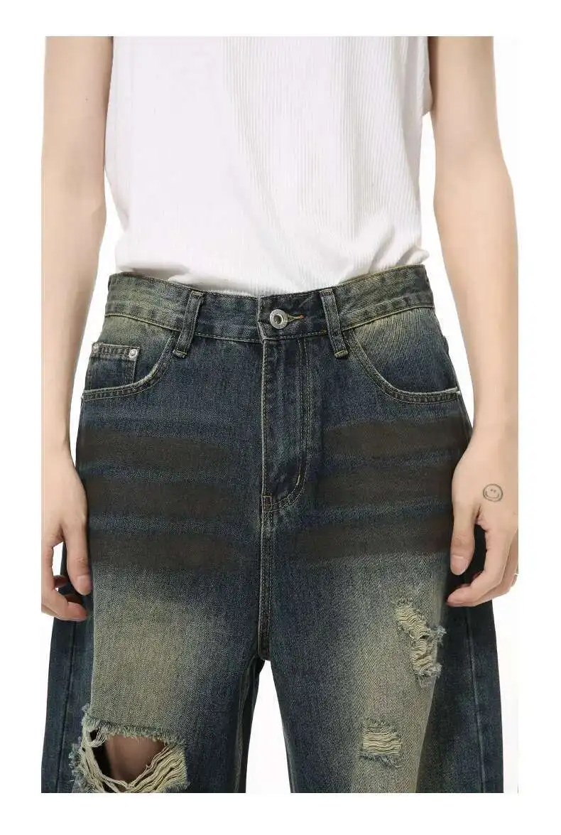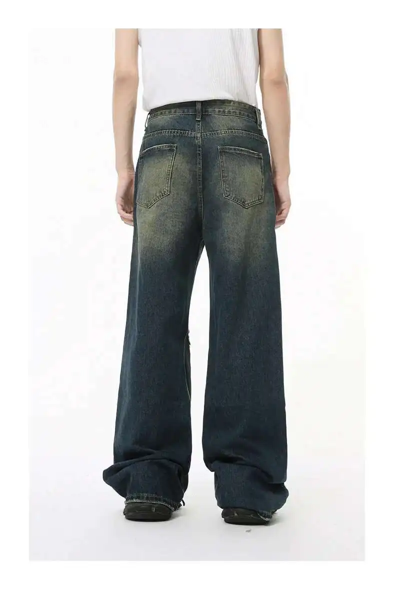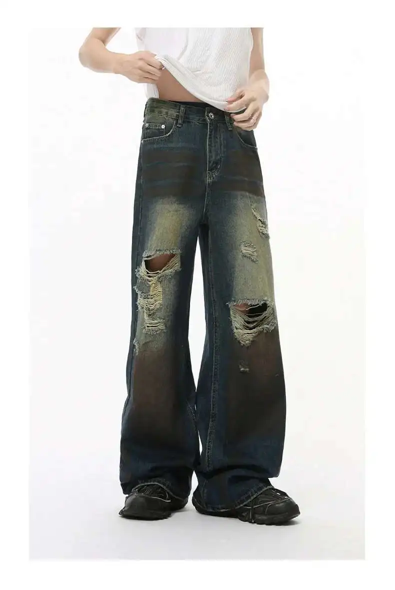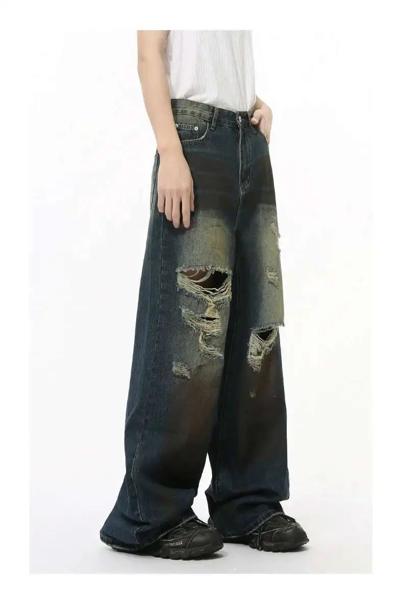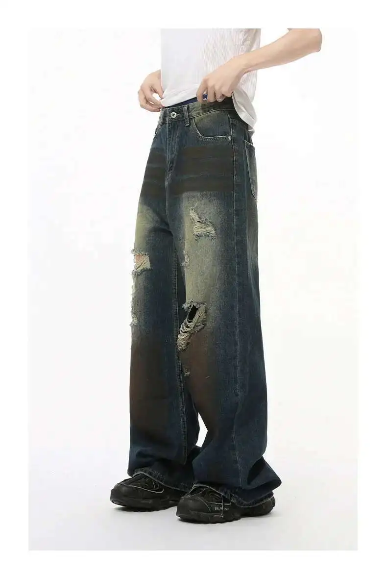 High Street Men's Denim Pants Worn-out Hole Design Contrast Color Straigh Bottom Wide Leg Loose Male Denim Spring 9C8204