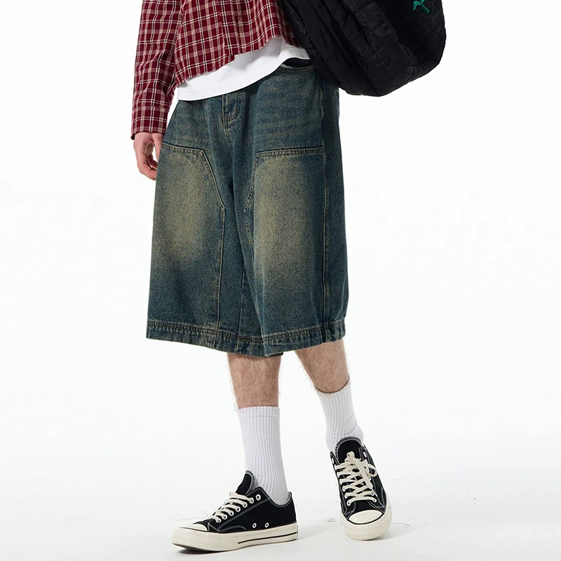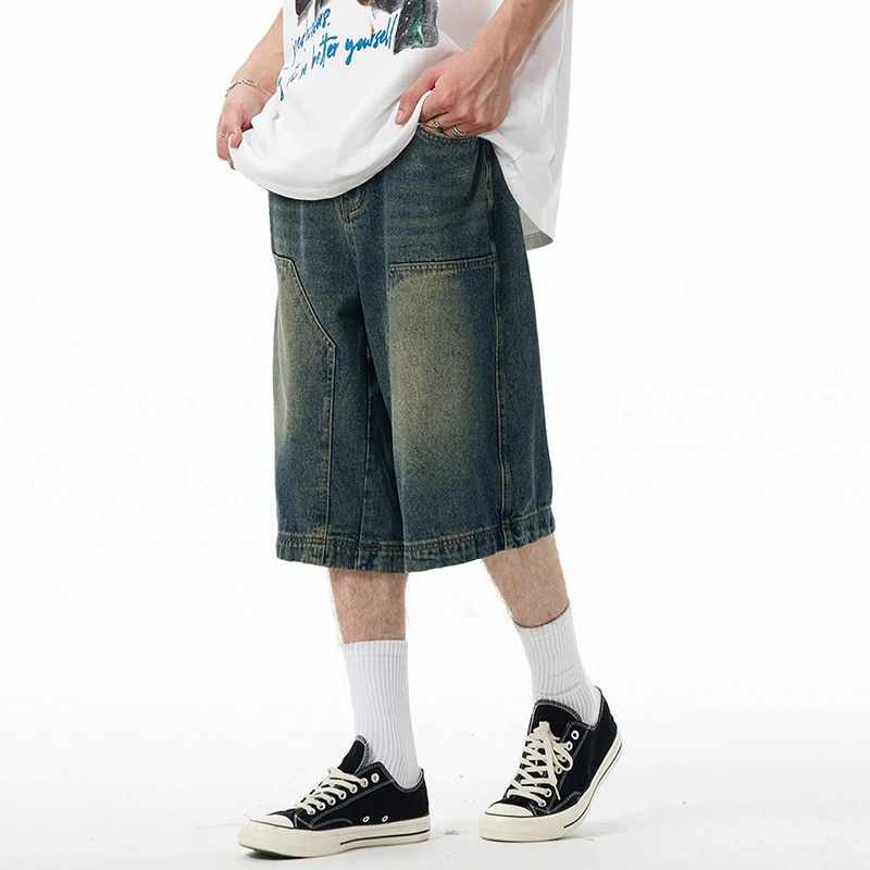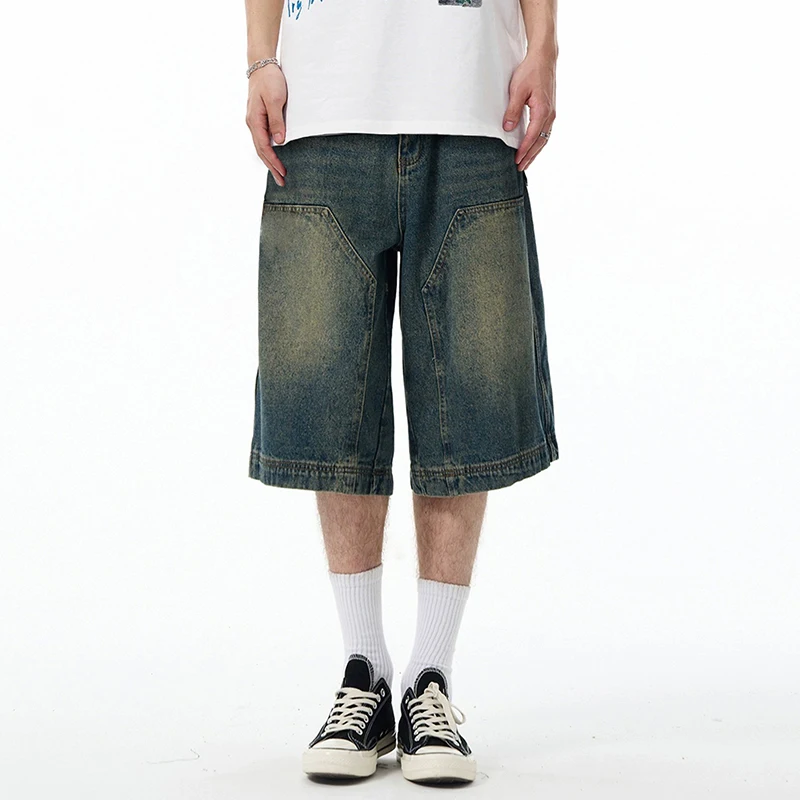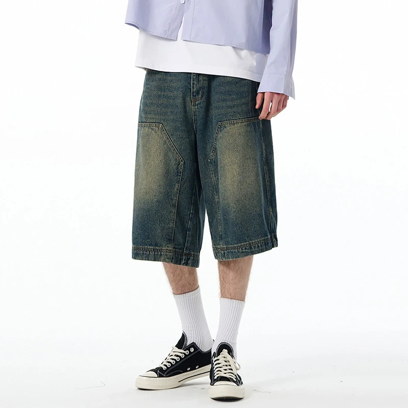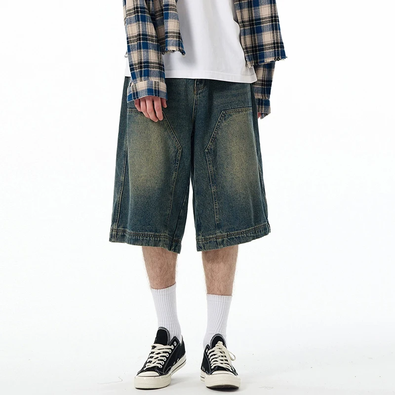 High Street Men's Denim Shorts American Washed Solid Color Straight Leg Design Cropped Male Short Jeans 9W1469