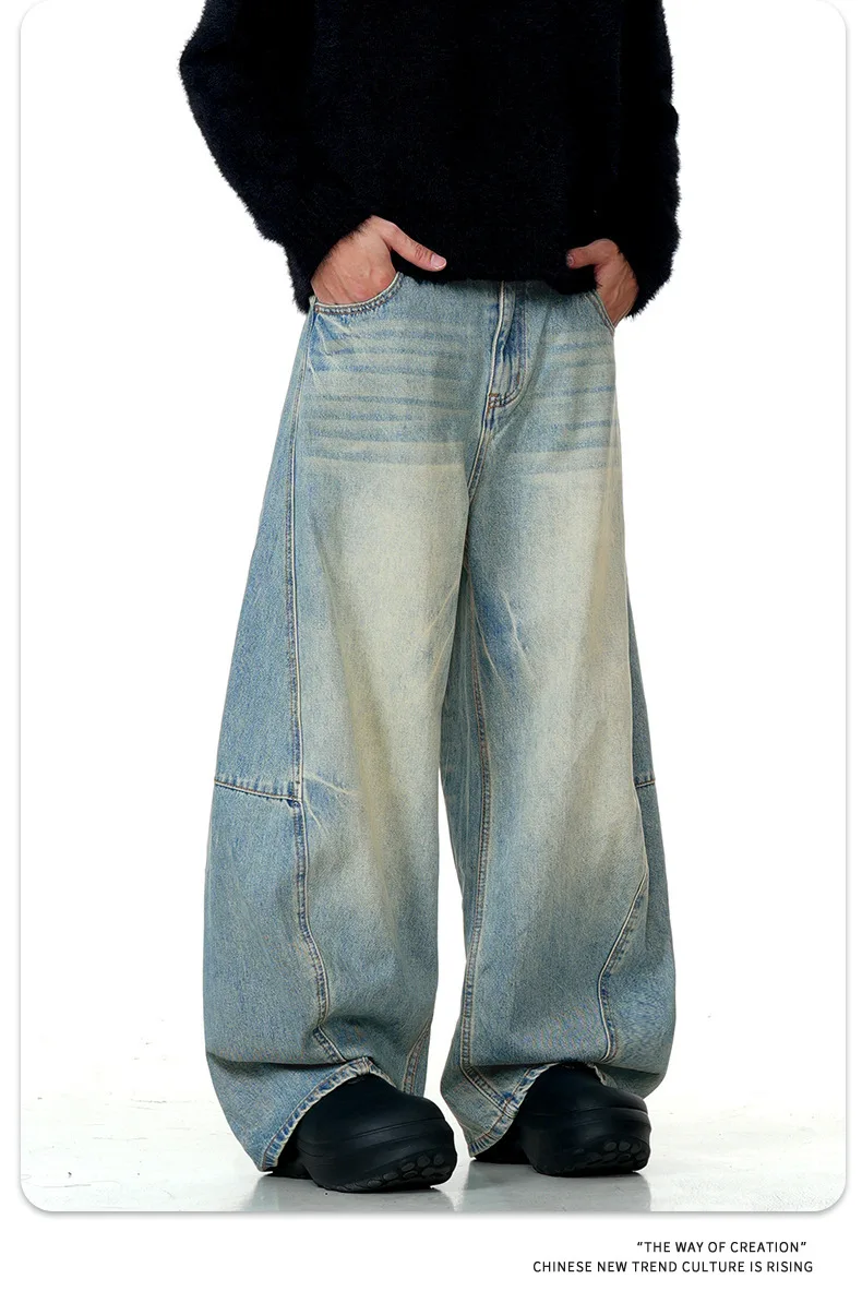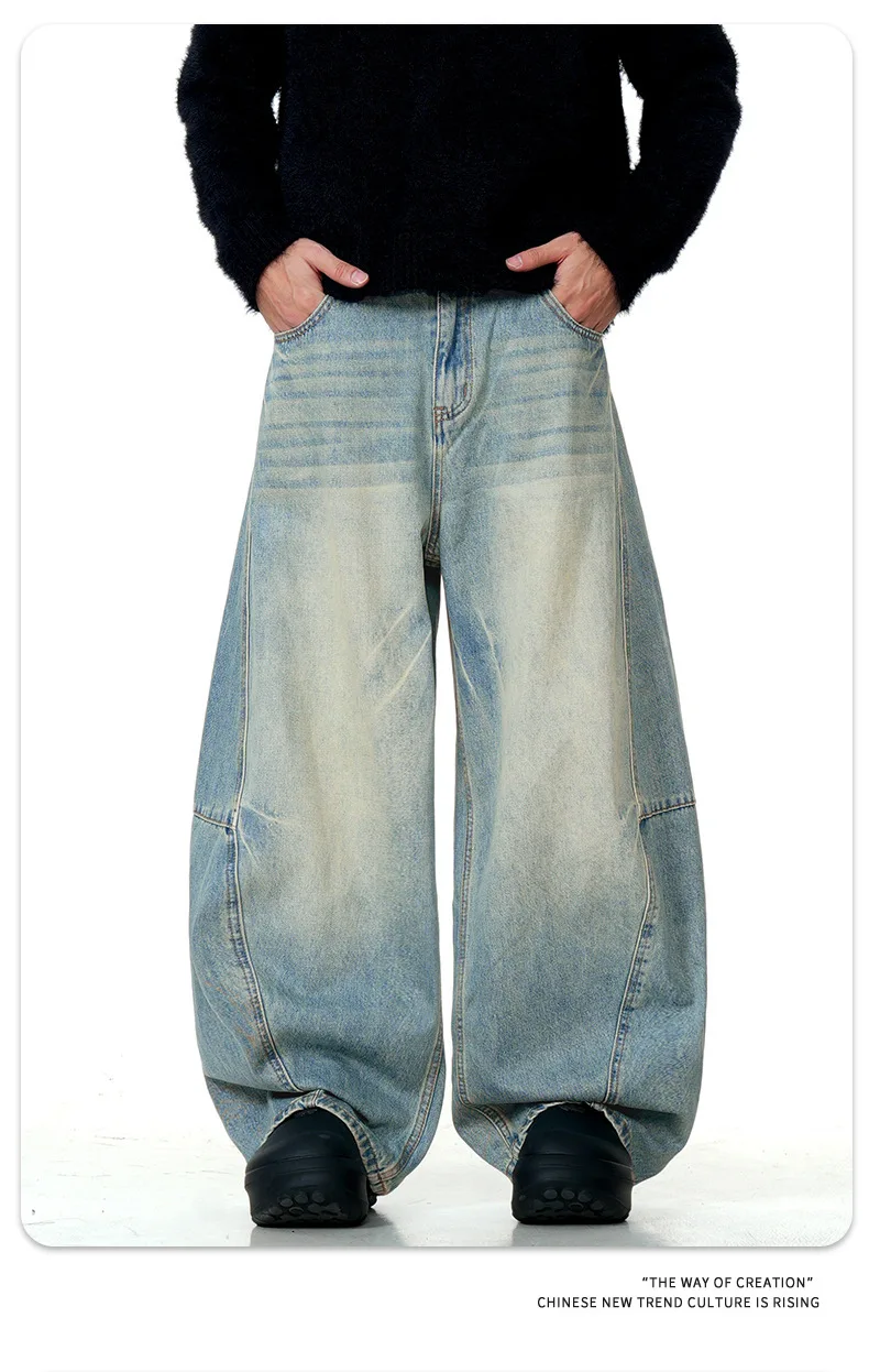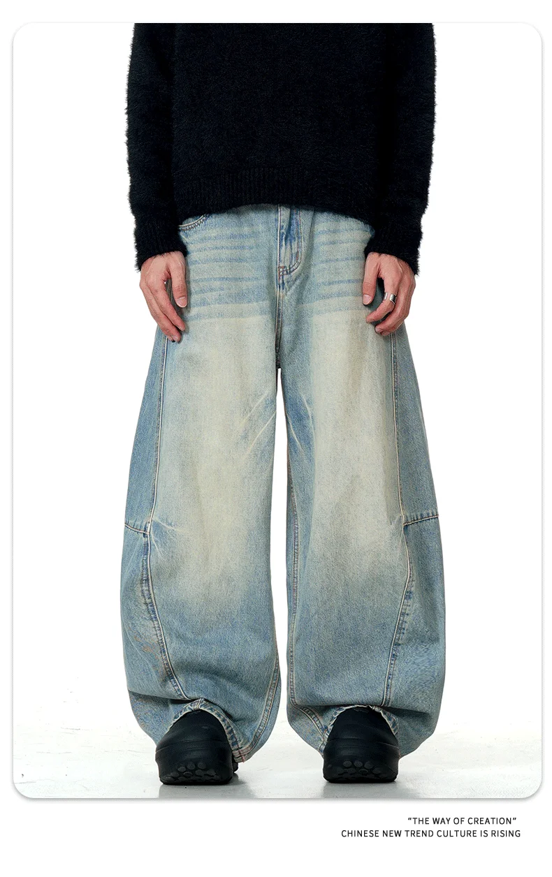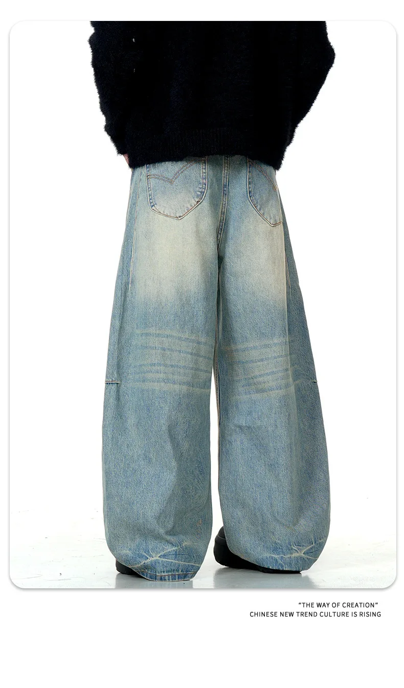 11KN American retro blue loose wide leg curved knife jeans for men and women street trend brand banana long pants cross-border