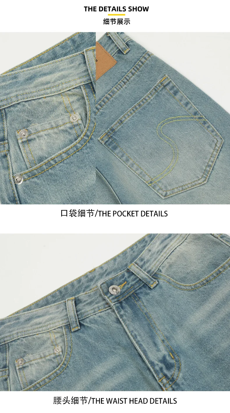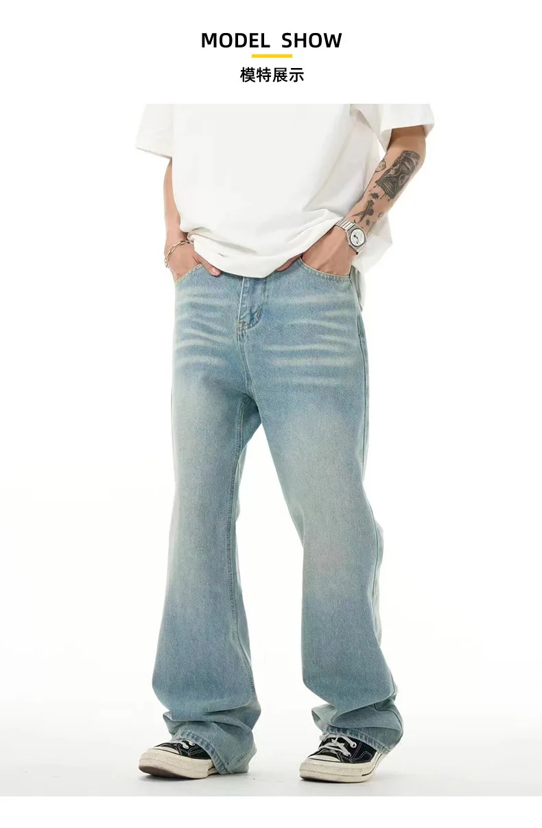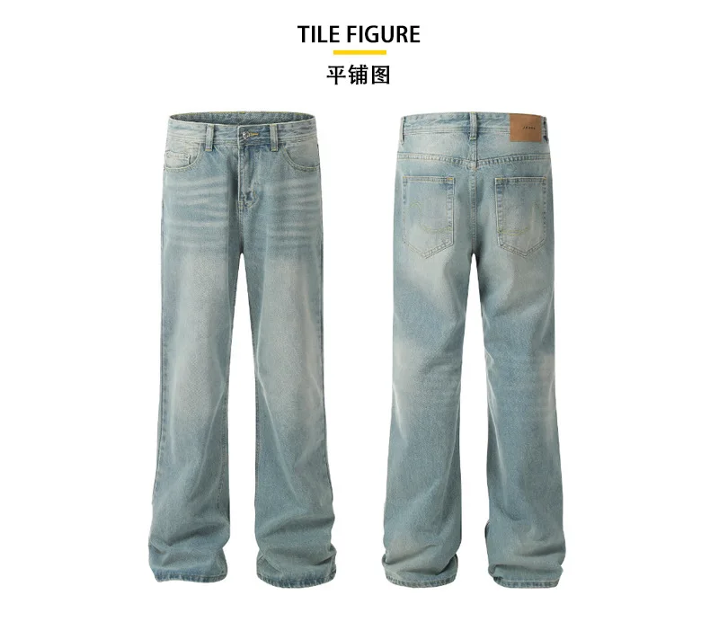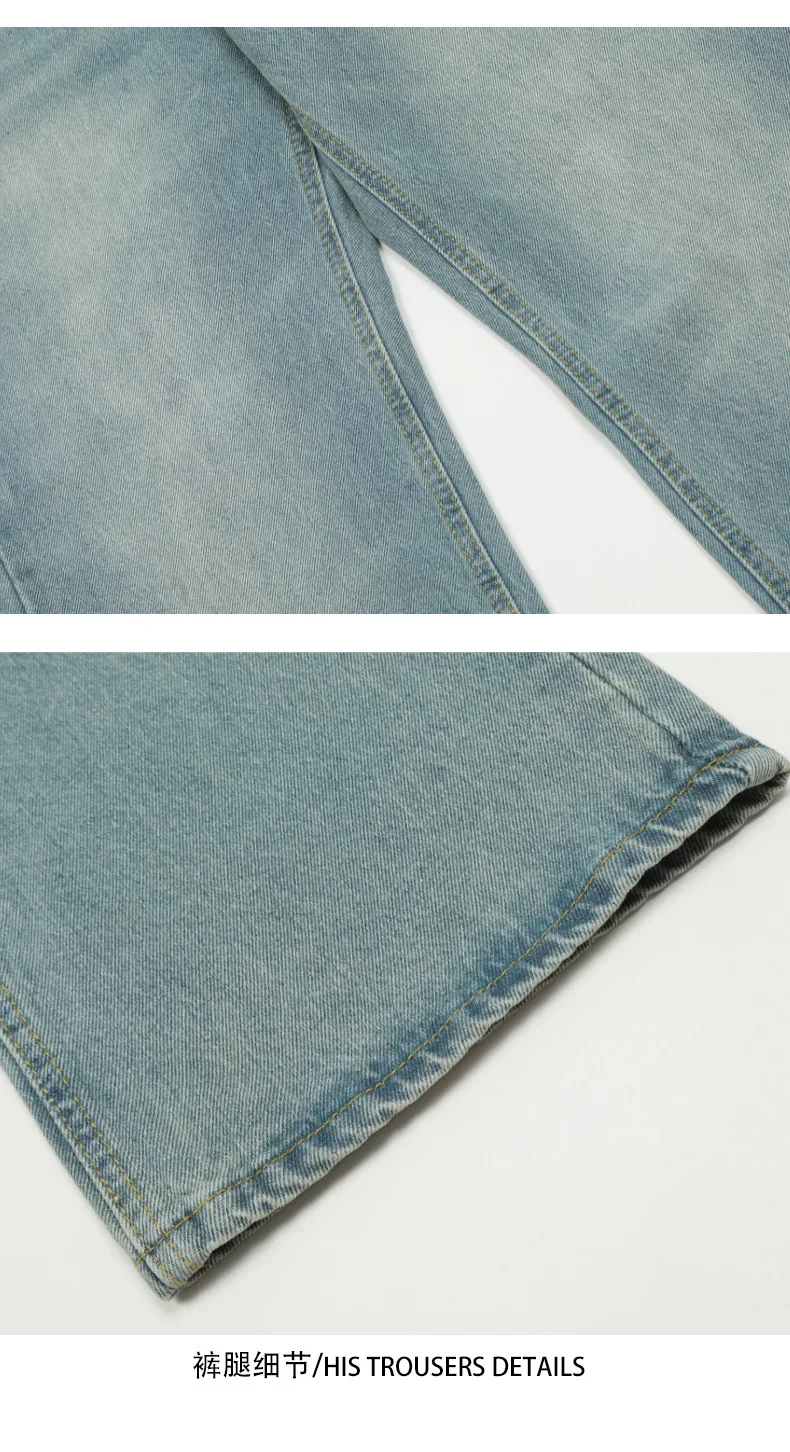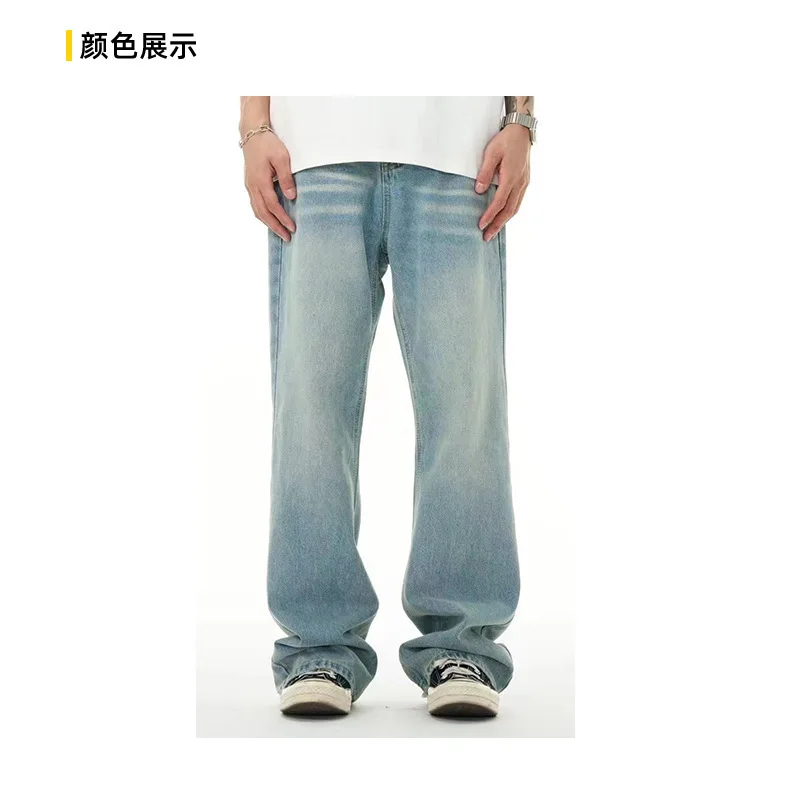 High Street Men's Washed Denim Pants American Style Loose Straight Wide Leg Trendy Solid Color Male Summer Bottoms 9W1741