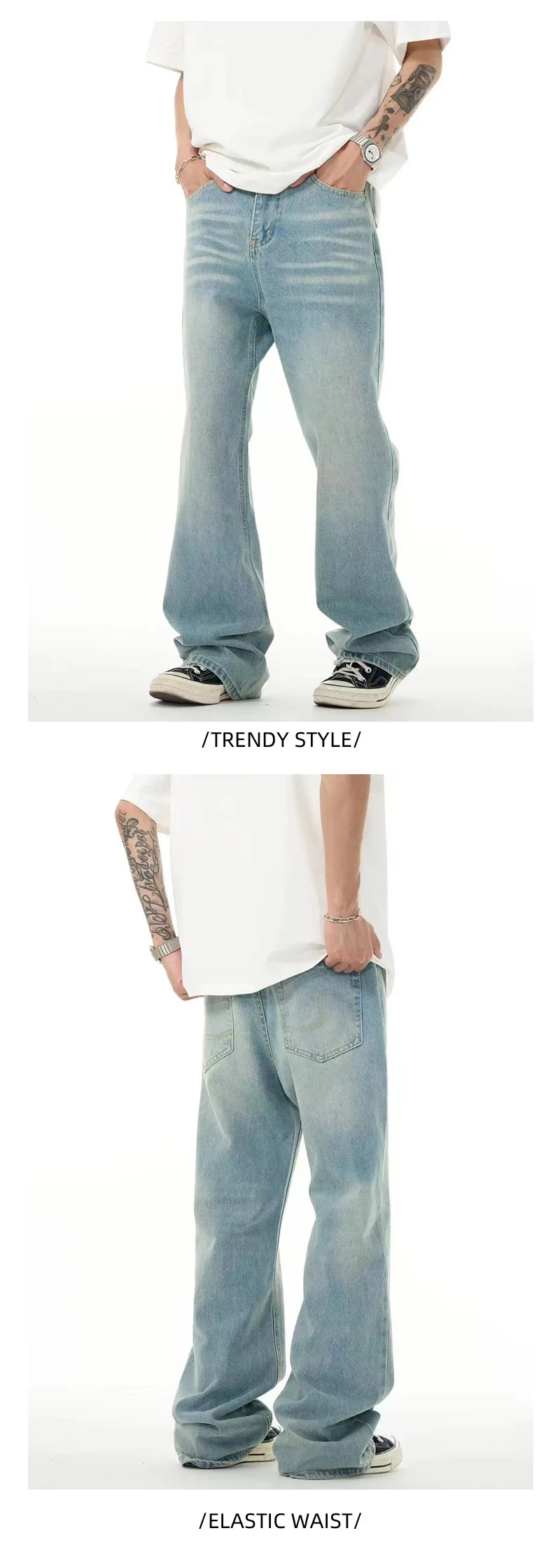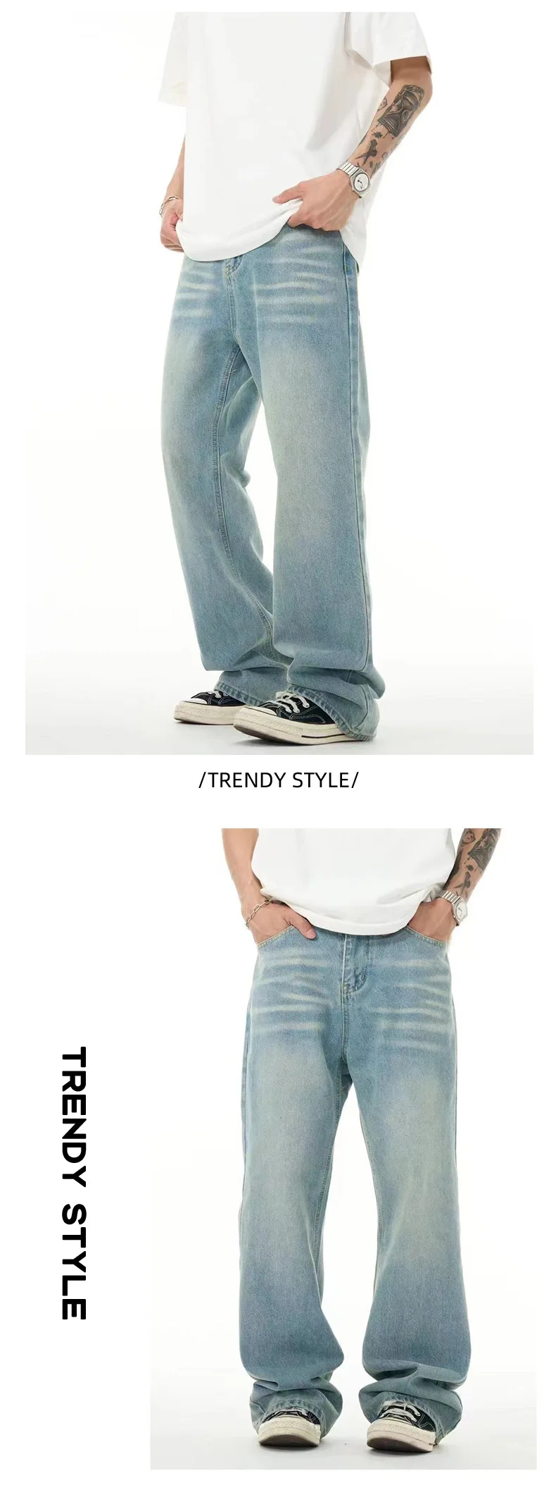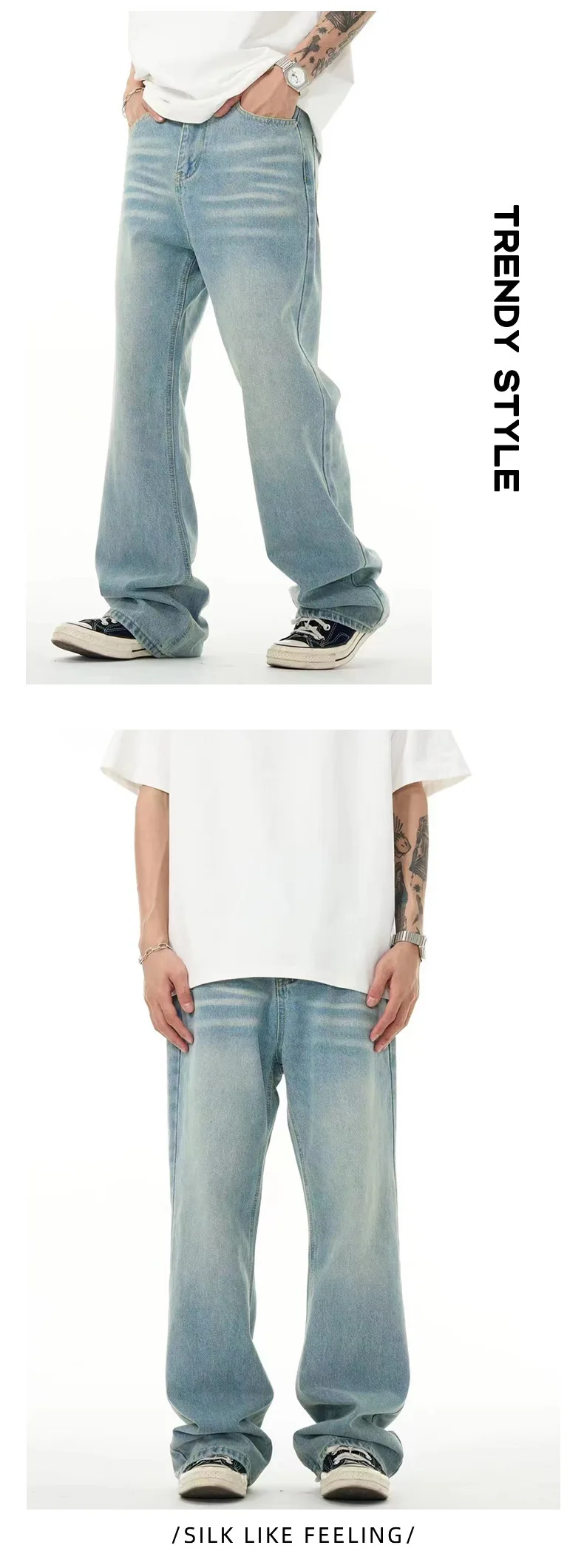 High Street Men's Washed Denim Pants American Style Loose Straight Wide Leg Trendy Solid Color Male Summer Bottoms 9W1741