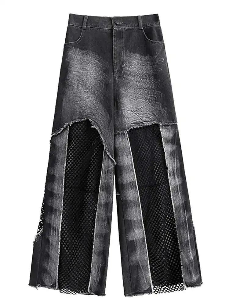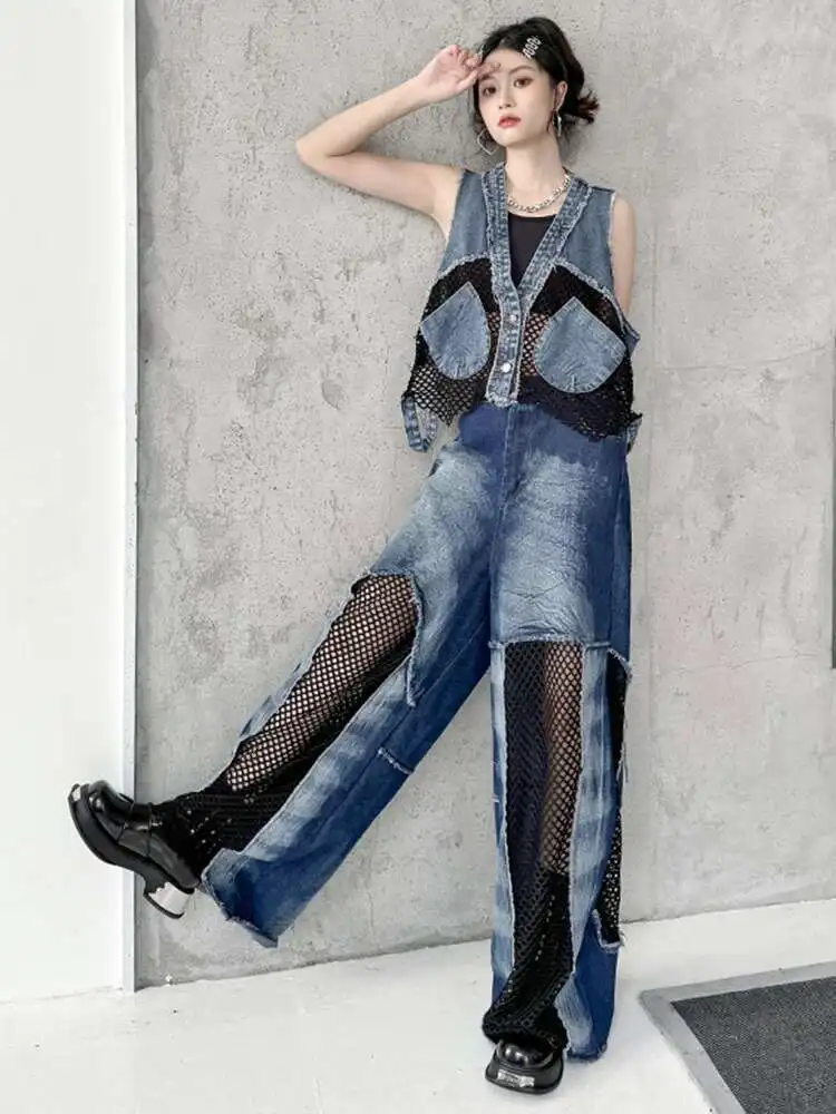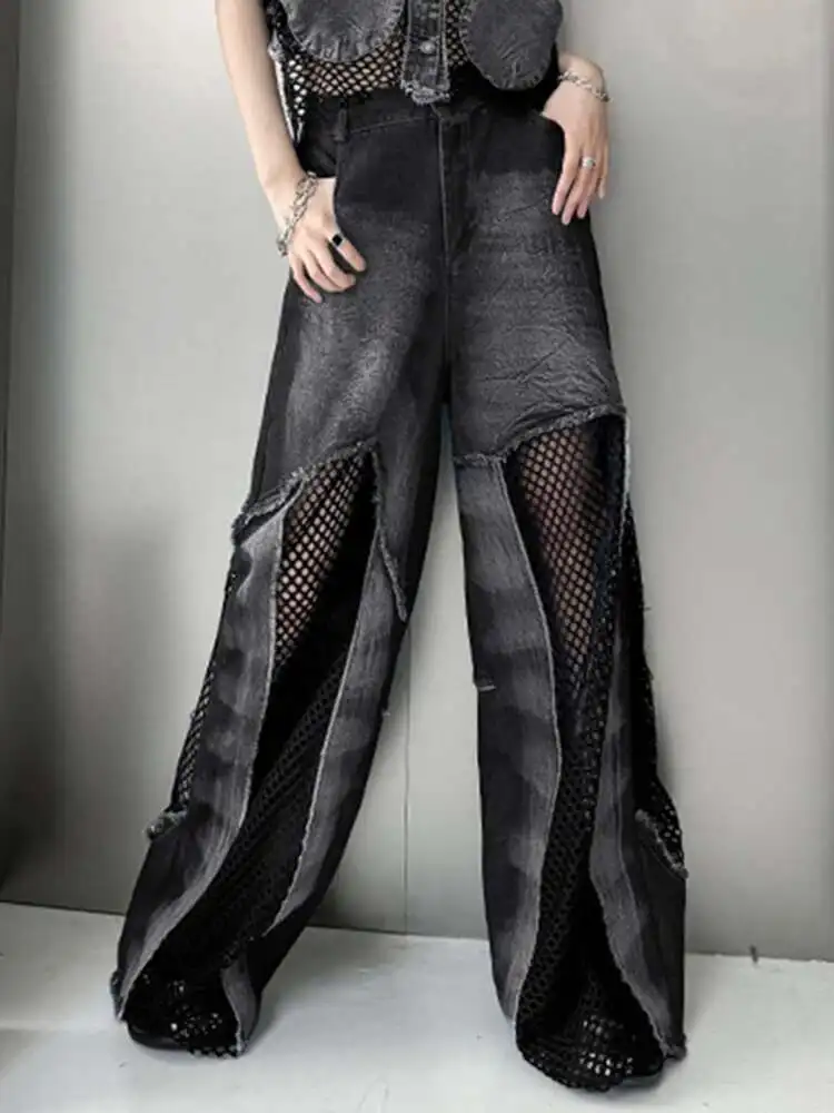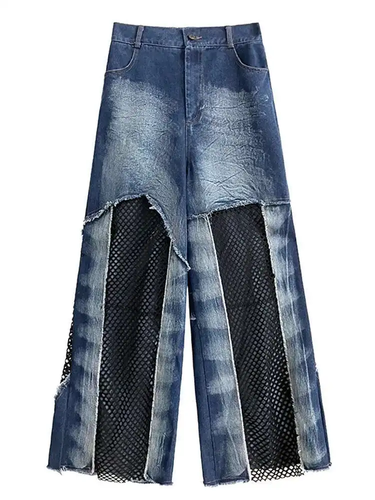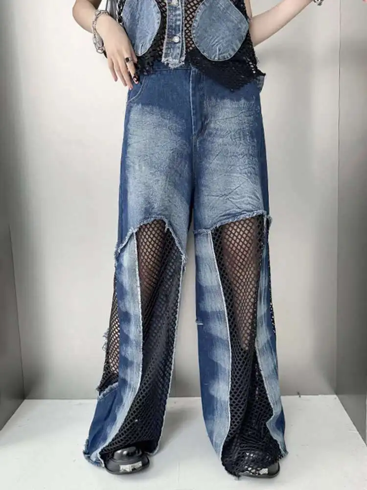 High Waist Blue Hollow Out Mesh Denim Wide Leg Jeans New Women Trousers Loose Fashion Tide Spring Autumn 2025 1DH4343
