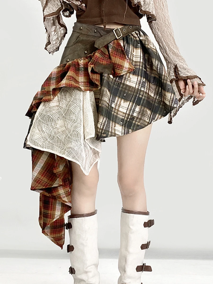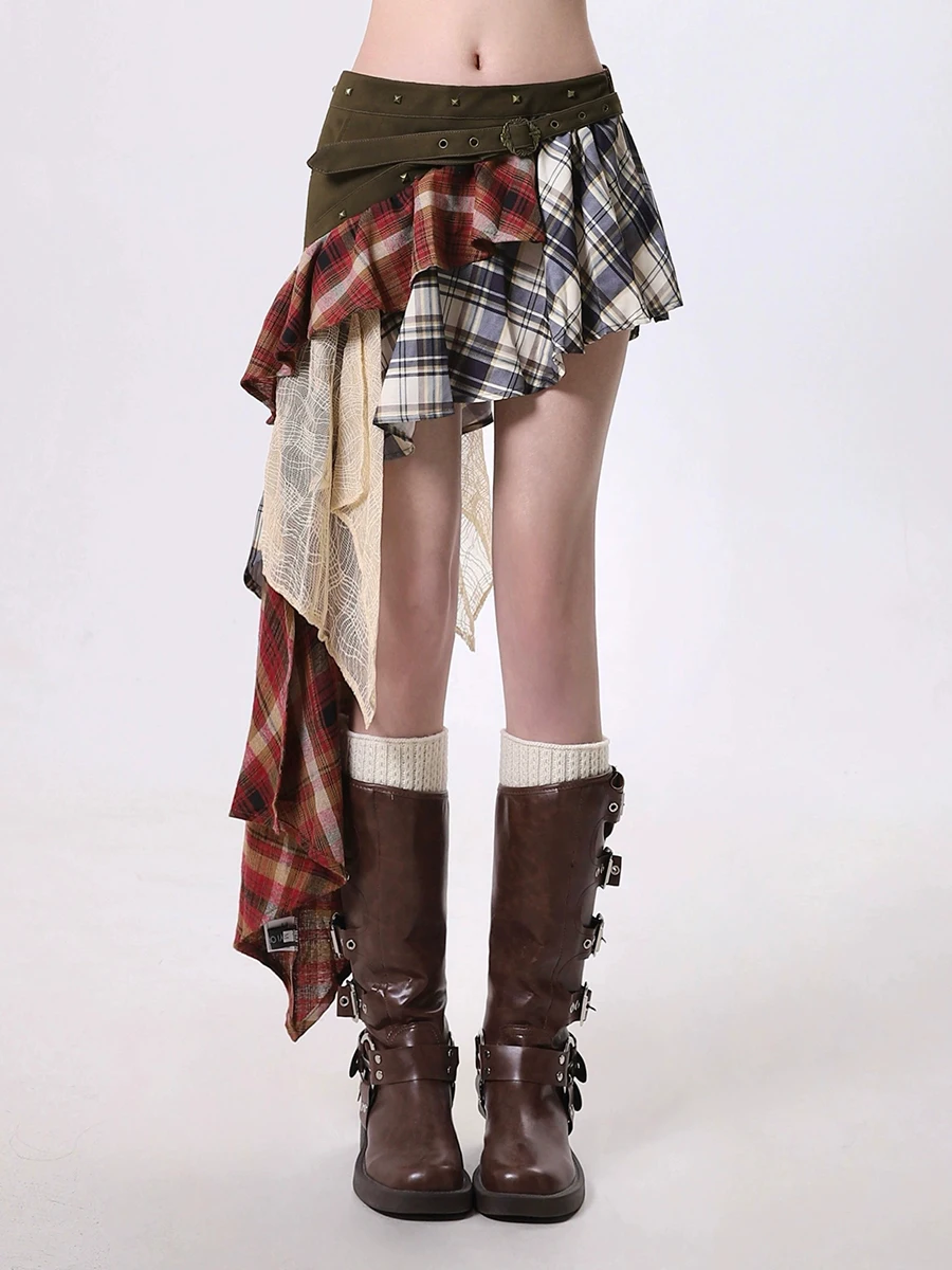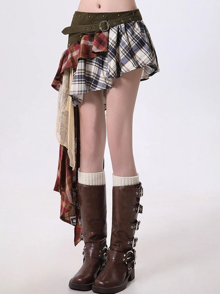 Hit Color Designer Loose Mini Skirts For Women High Waist Temperament Check Spliced Belt Skirt Female Fashion New