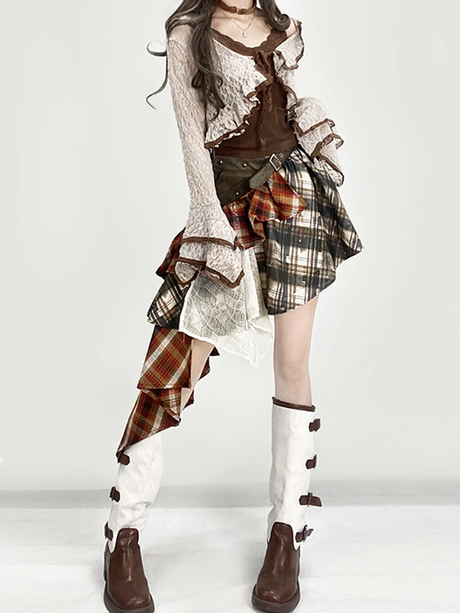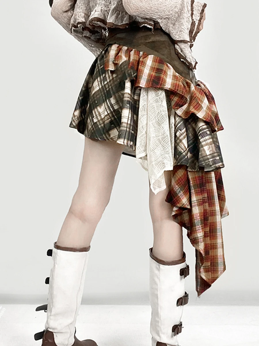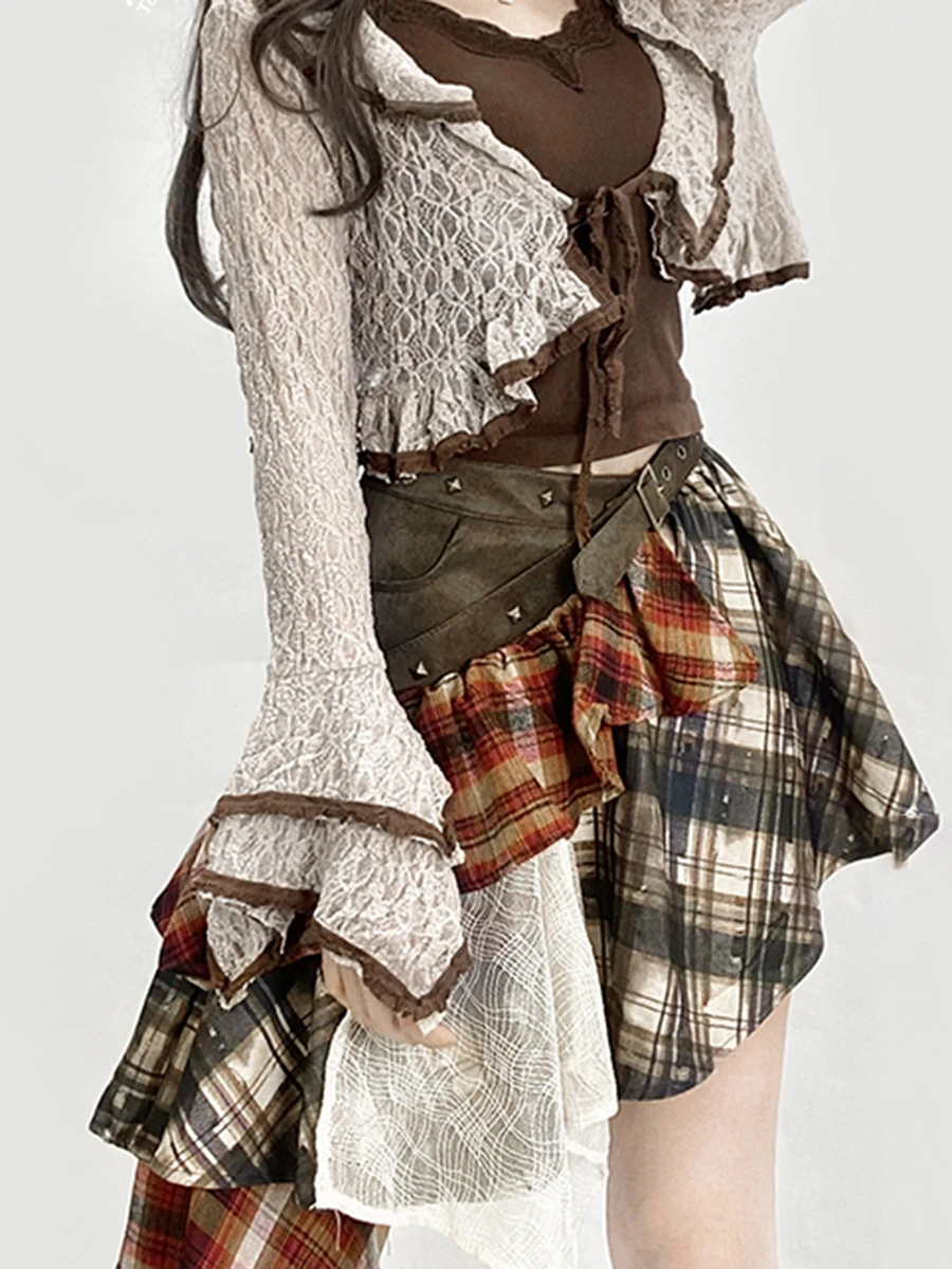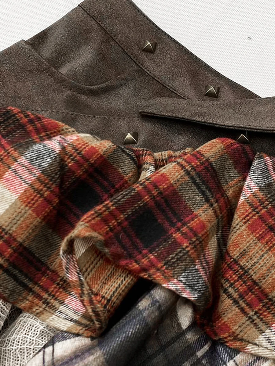 Hit Color Designer Loose Mini Skirts For Women High Waist Temperament Check Spliced Belt Skirt Female Fashion New