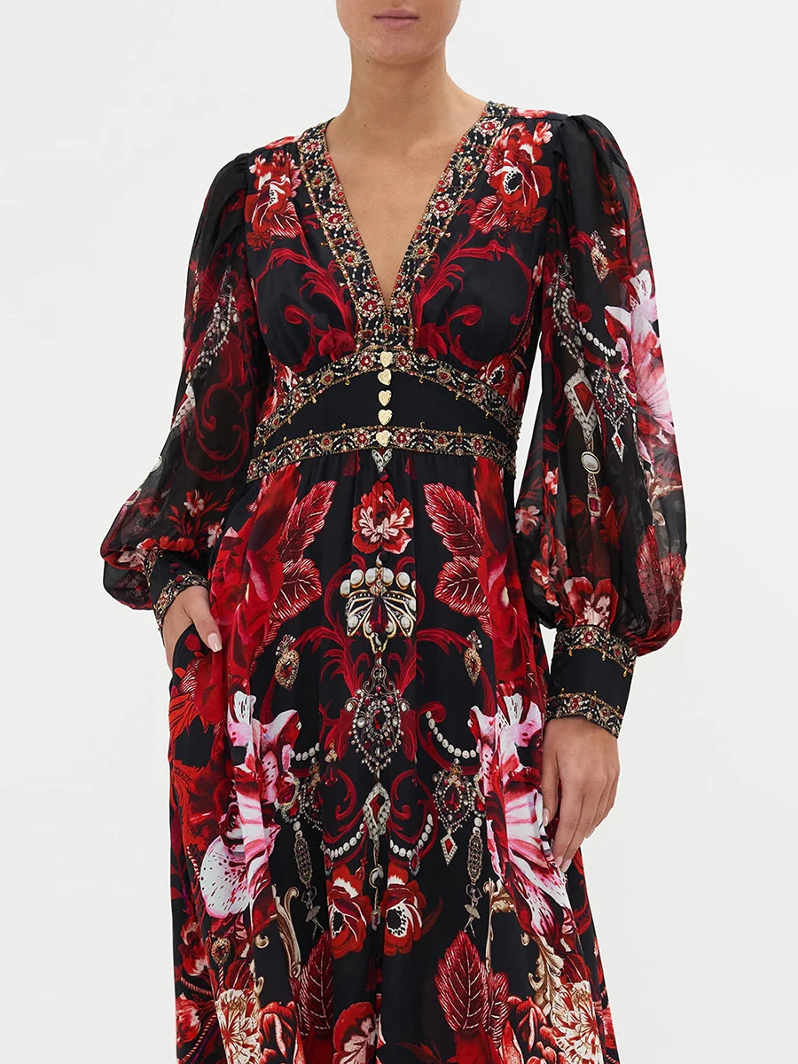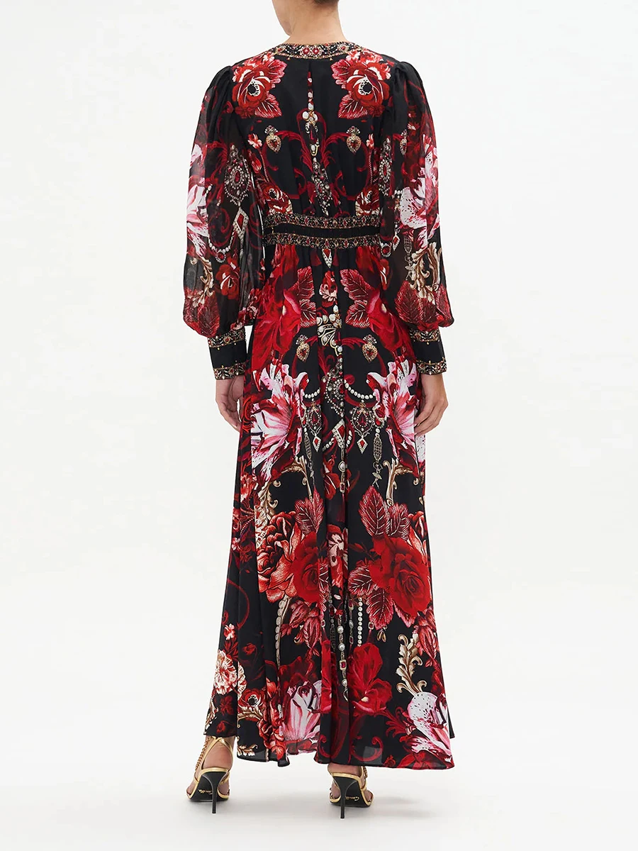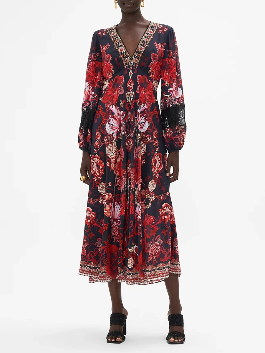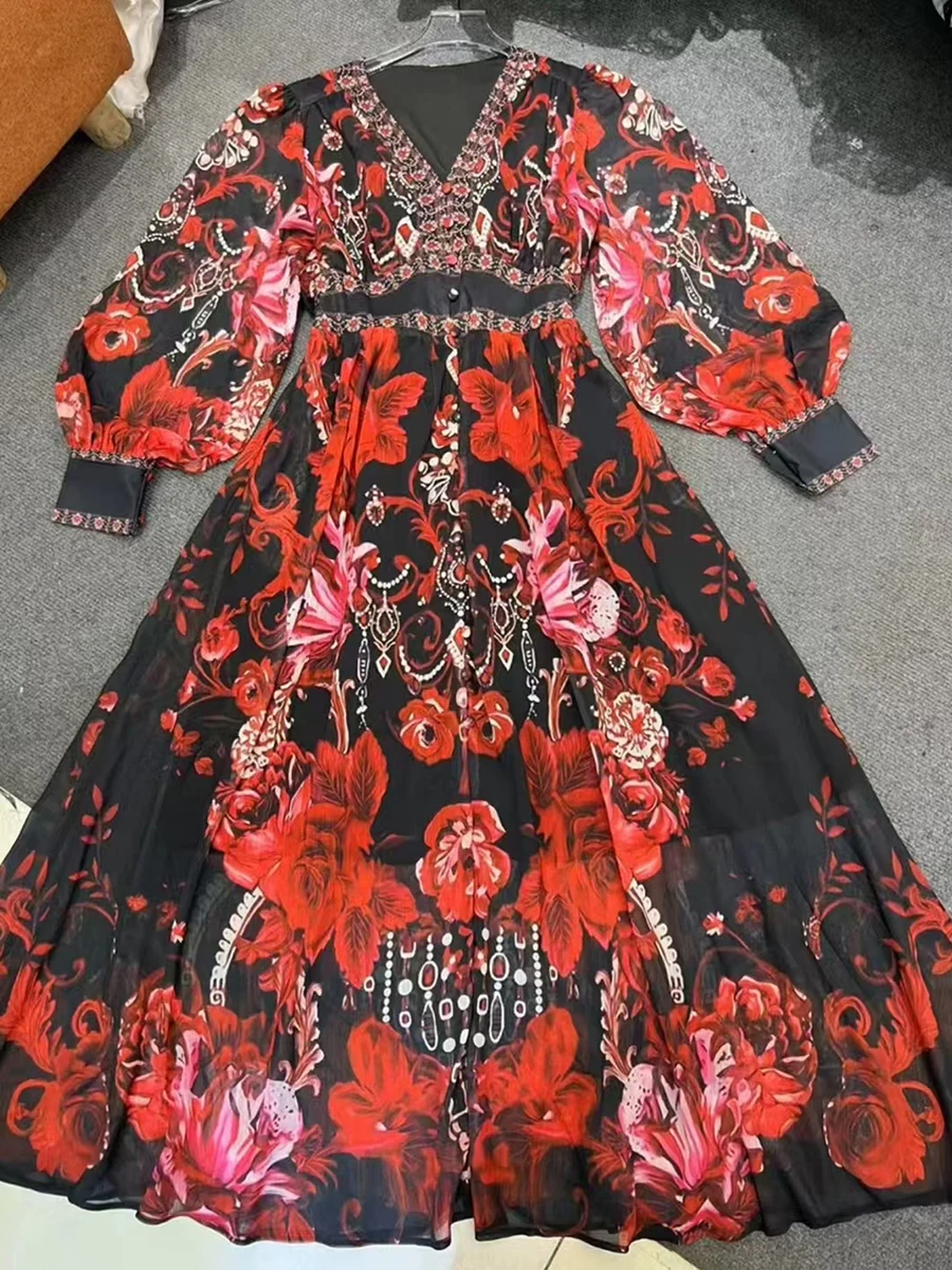 Hit Color Loose Spliced Button Dresses For Women V Neck Long Sleeve High Waist Temperament Long Dress Female New