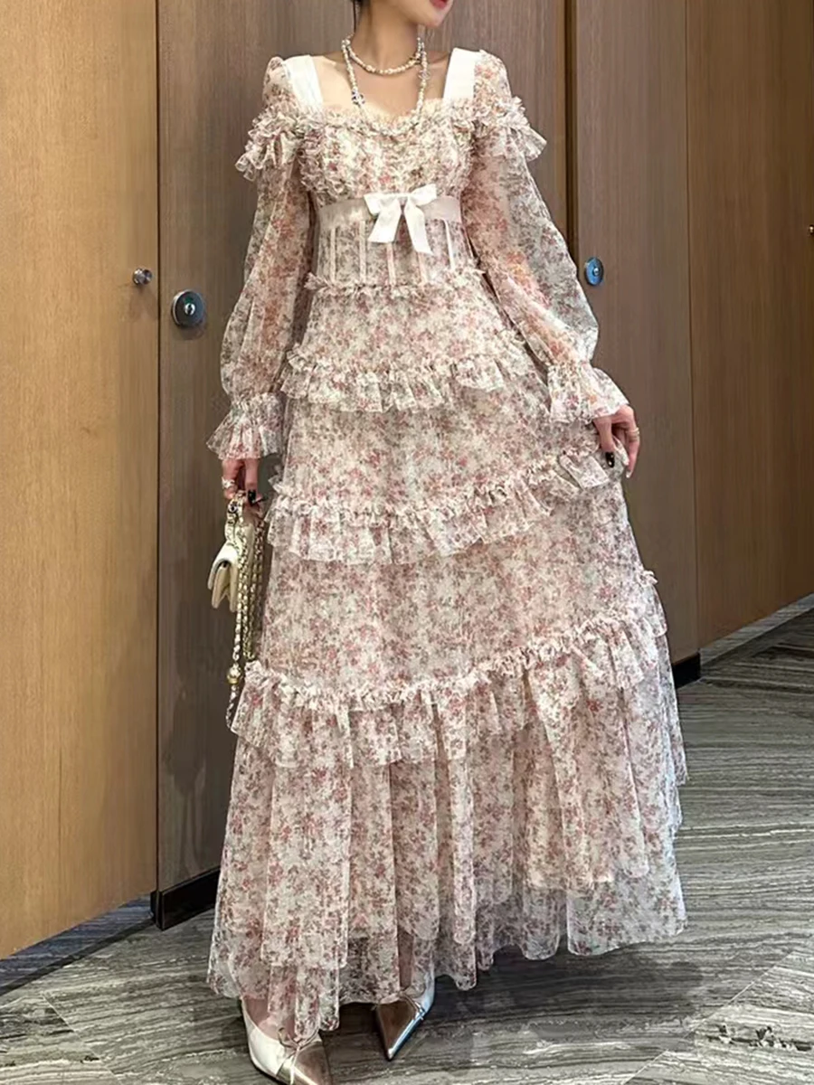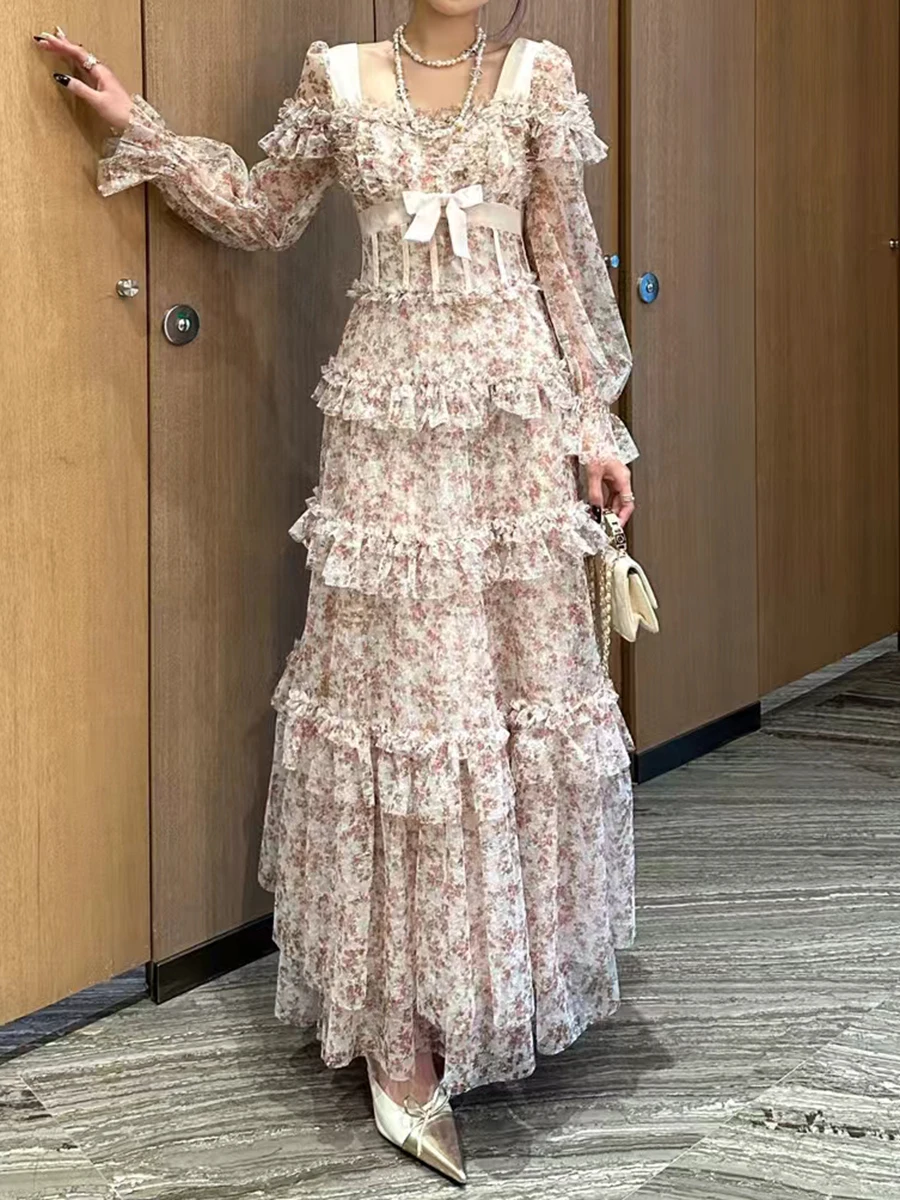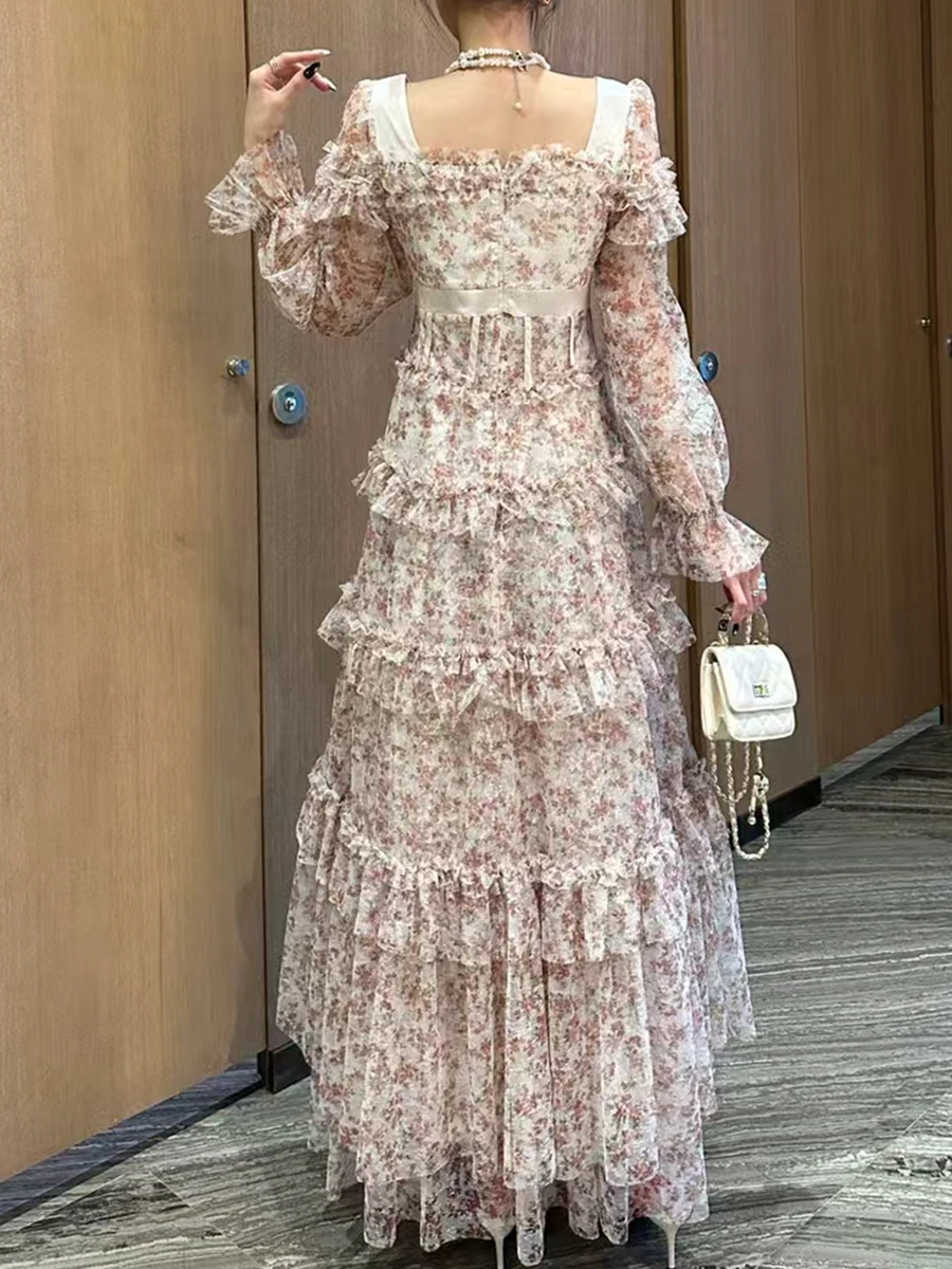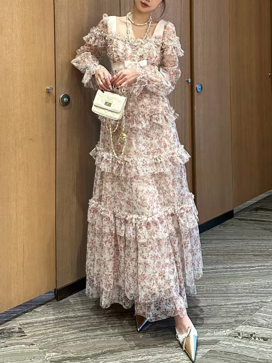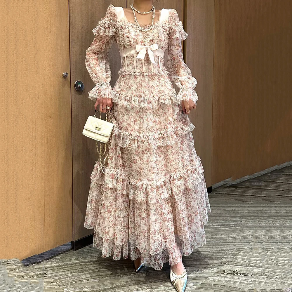 Hit Color Printing Slimming Dresses For Women Square Neck Long Sleeve High Waist Temperament Long Dress Female New