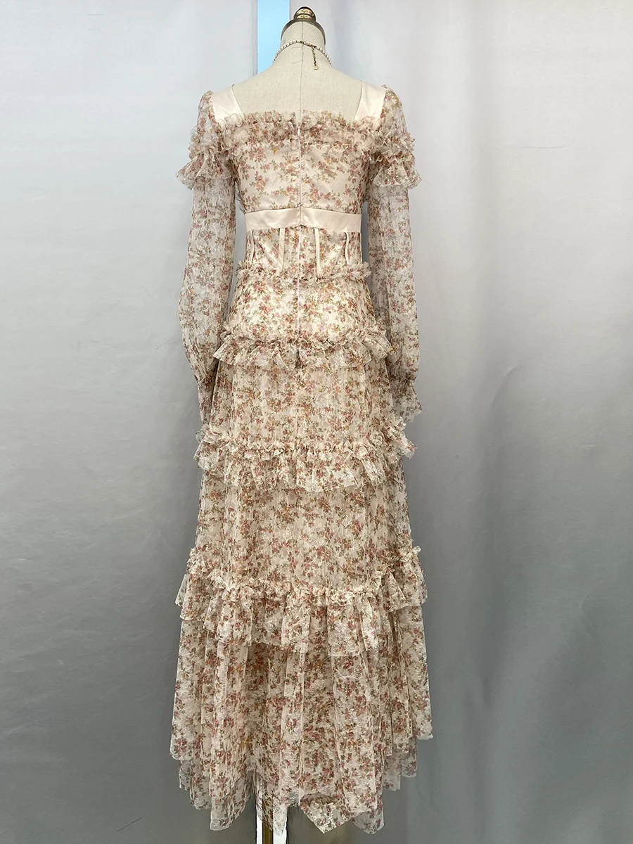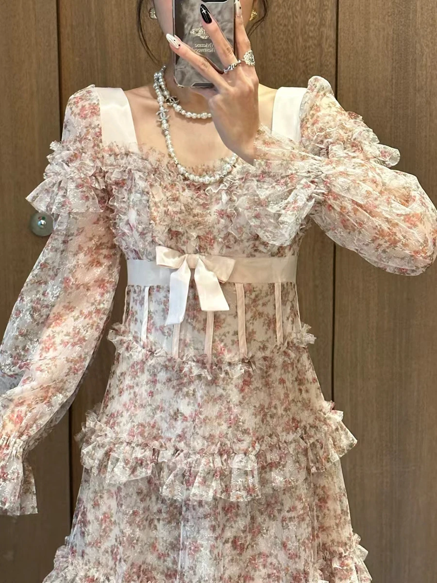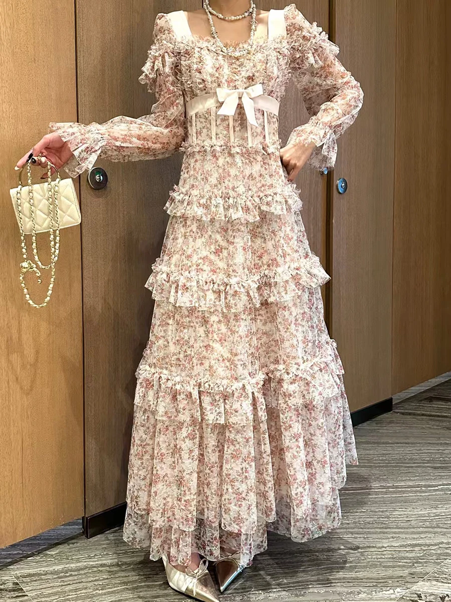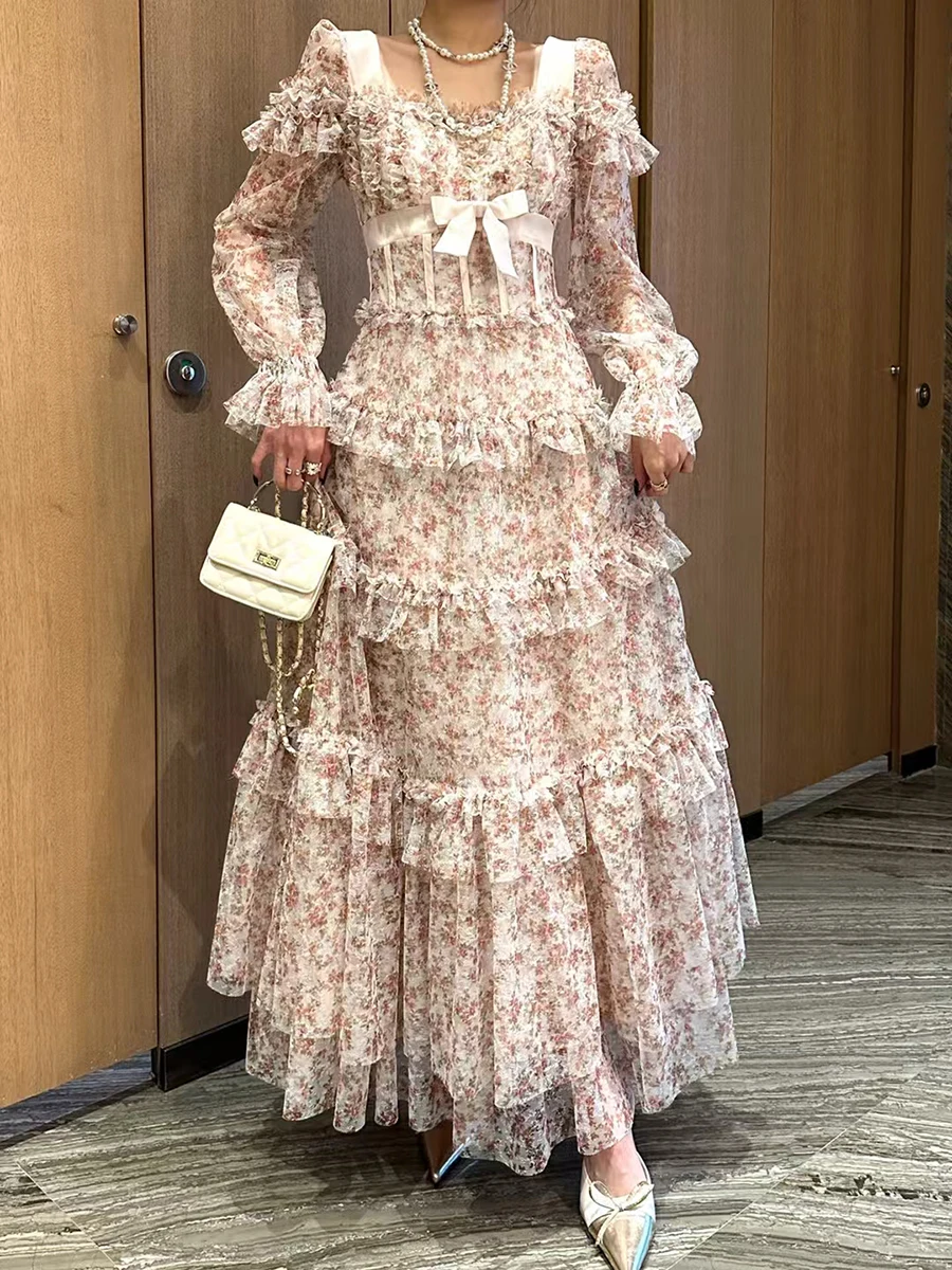 Hit Color Printing Slimming Dresses For Women Square Neck Long Sleeve High Waist Temperament Long Dress Female New