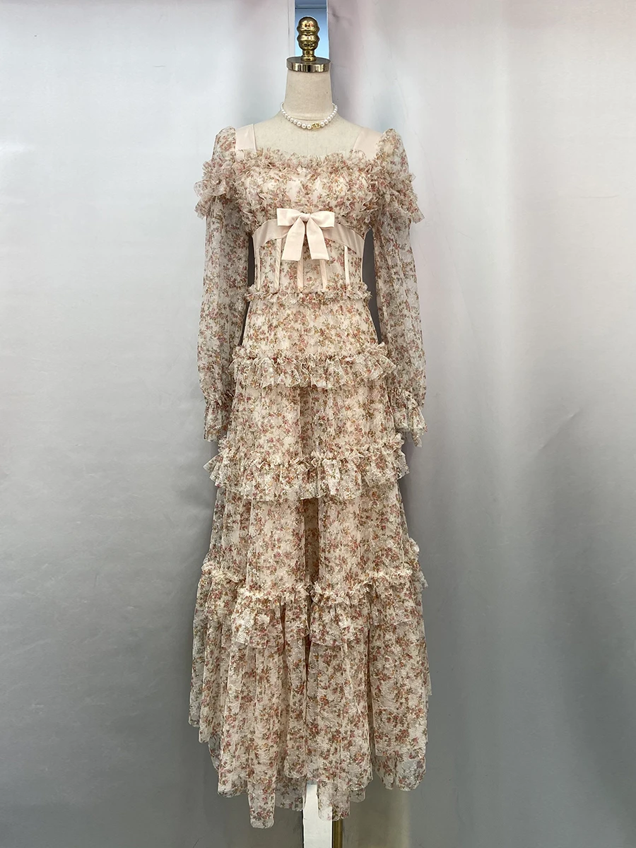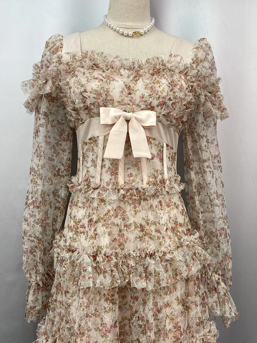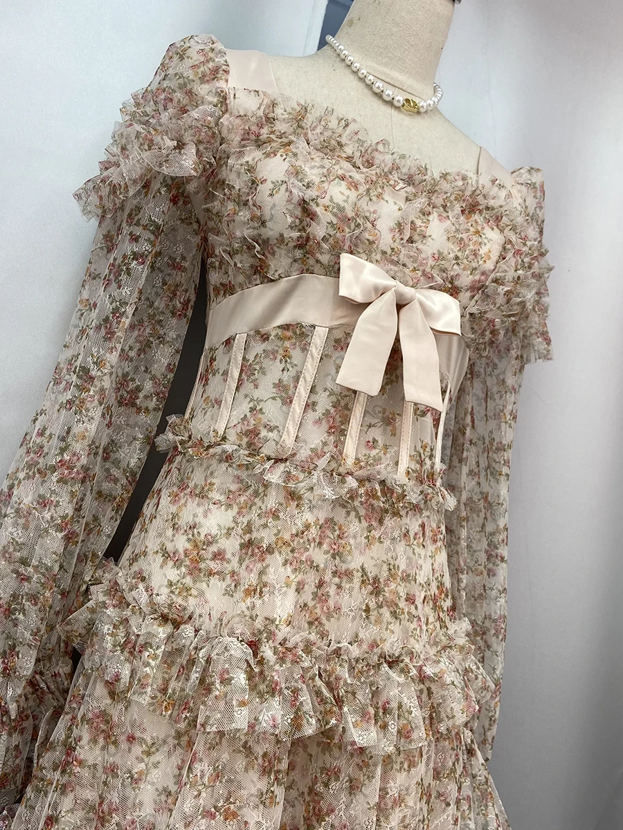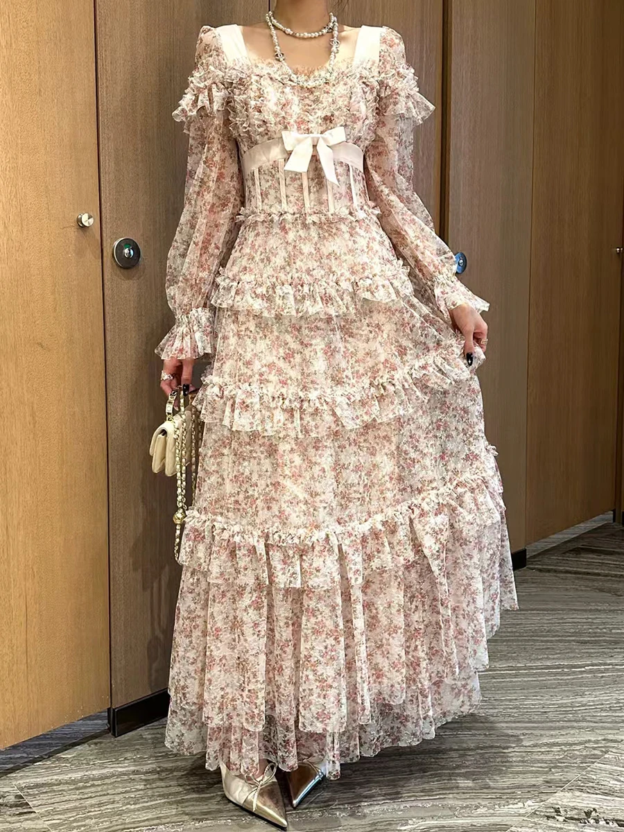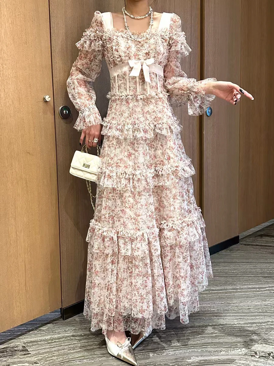 Hit Color Printing Slimming Dresses For Women Square Neck Long Sleeve High Waist Temperament Long Dress Female New