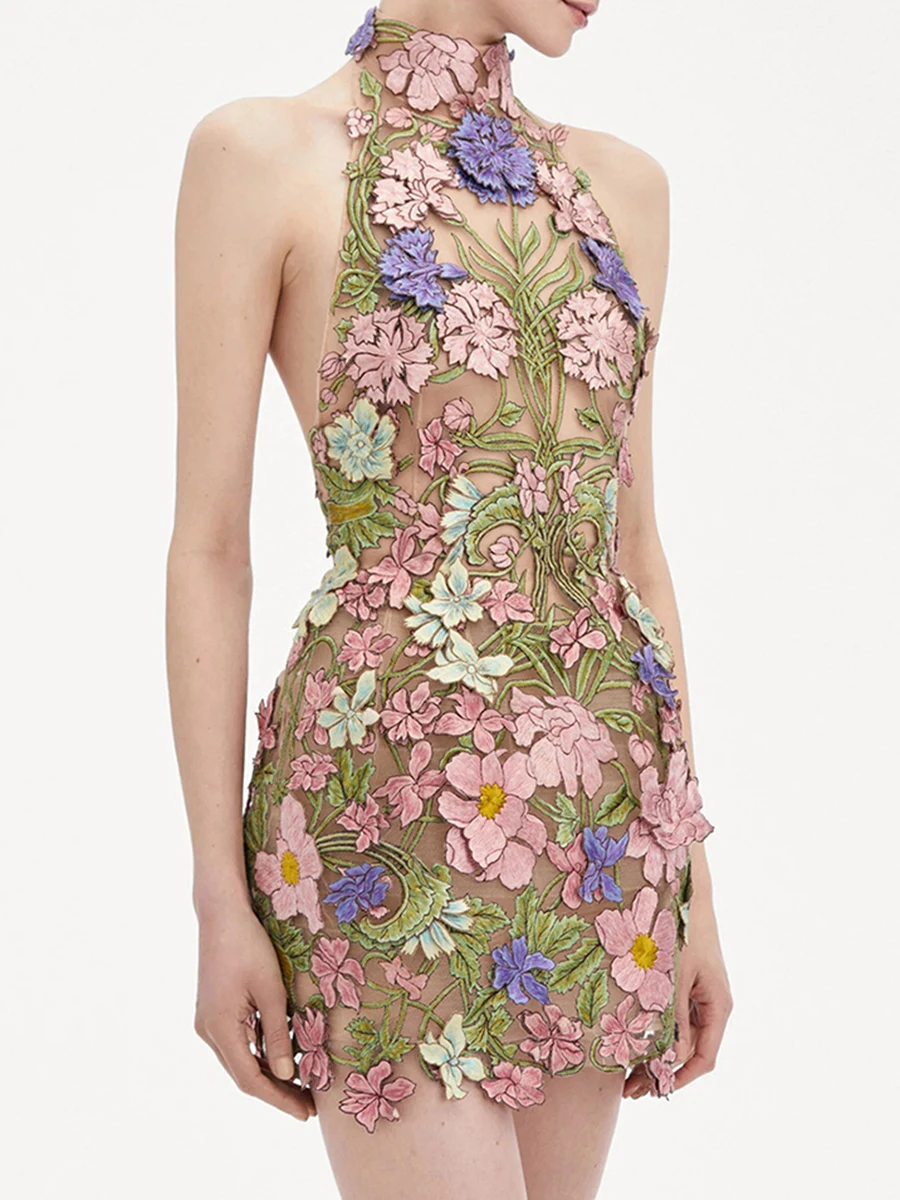 Hit Color Slimming Spliced Embroidery Dresses for Women Halter Sleeveless Backless High Waist Dress Female Clothing