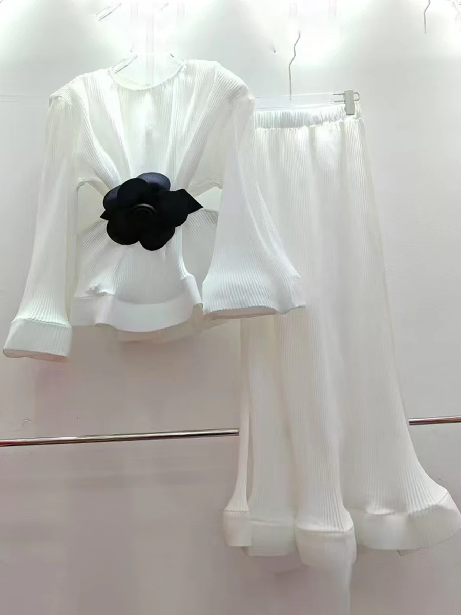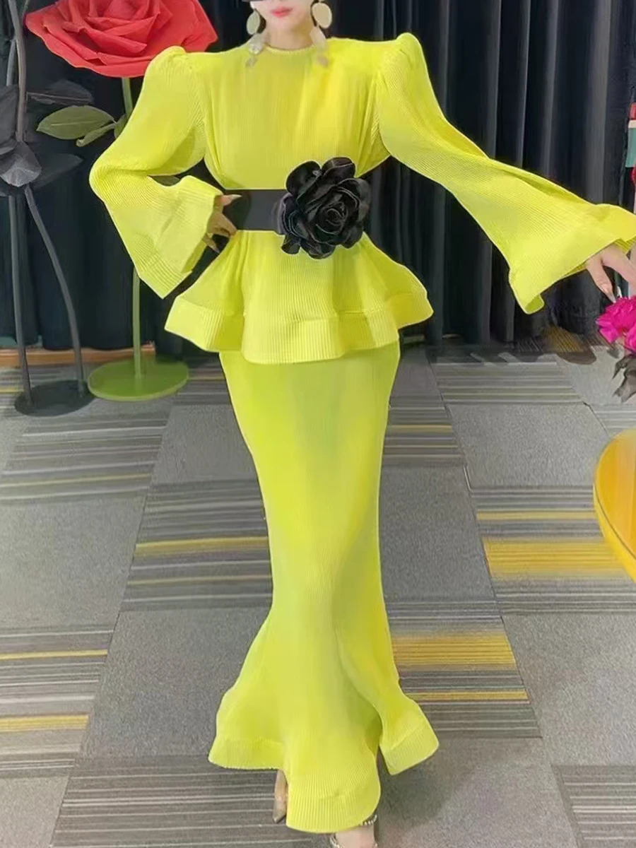 Hit Color Spliced Belt Two Piece Set For Women O Neck Long Sleeve Top High Wait Slimming Skirt Sets Female Fashion