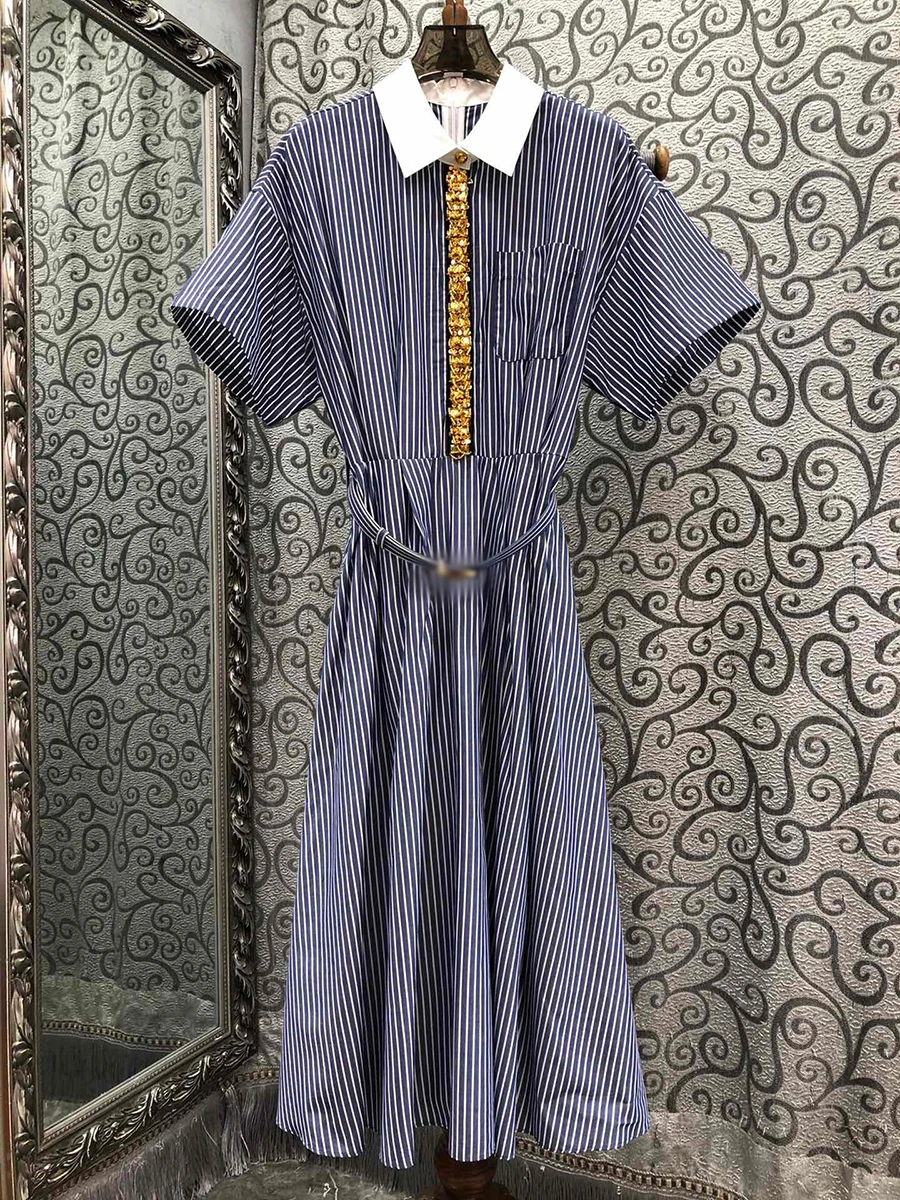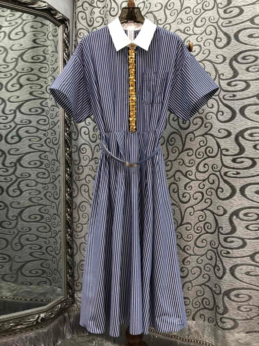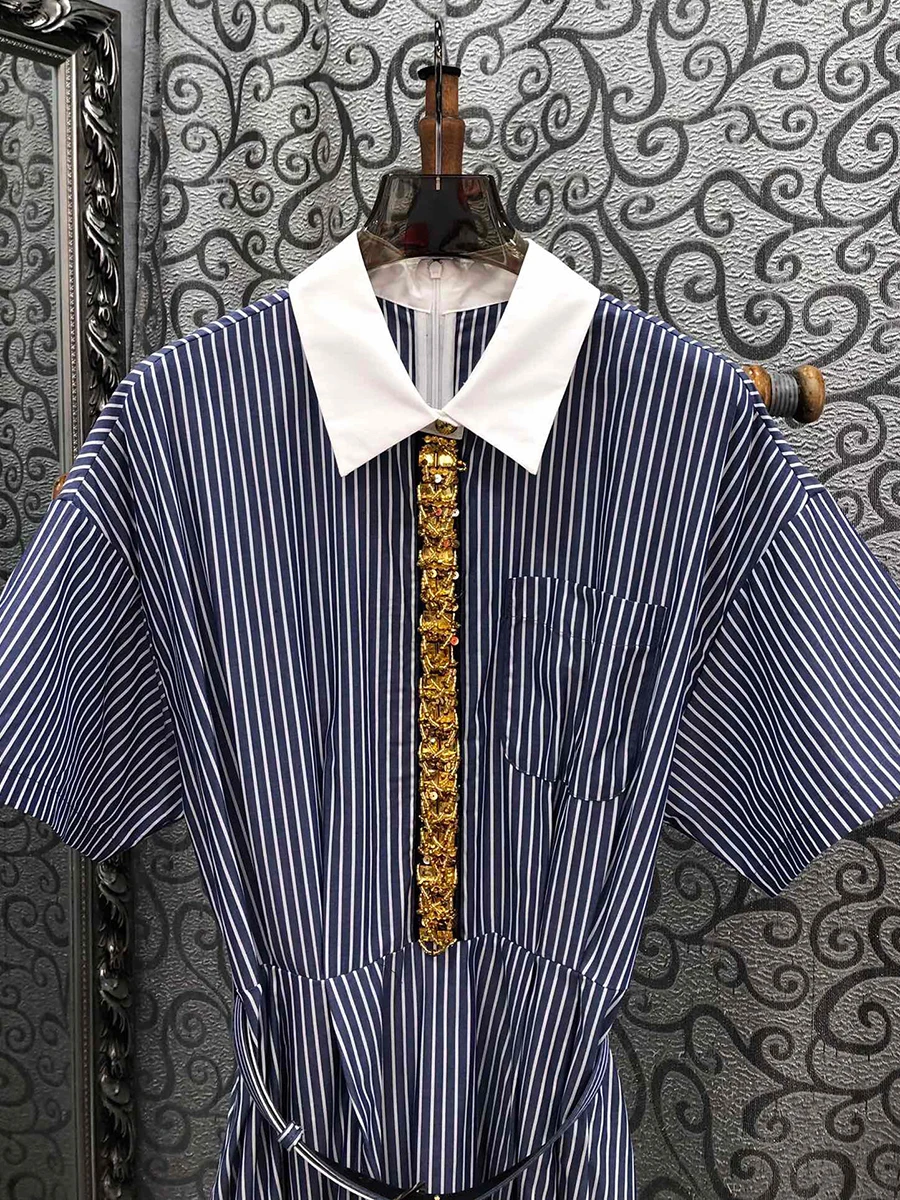 Hit Color Spliced Diamonds Dresses For Women Lapel Short Sleeve High Waist Temperament Long Dress Female Fashion