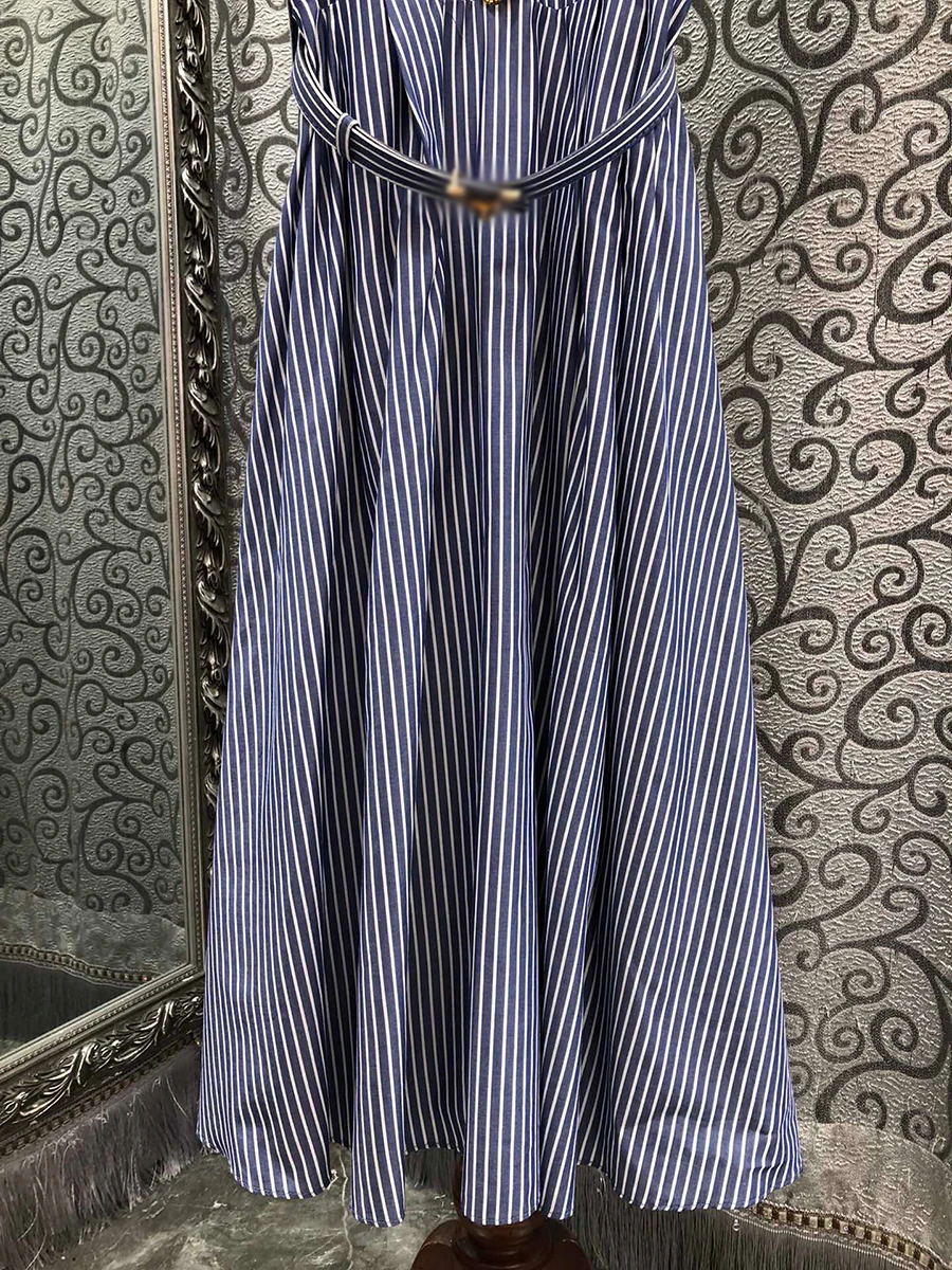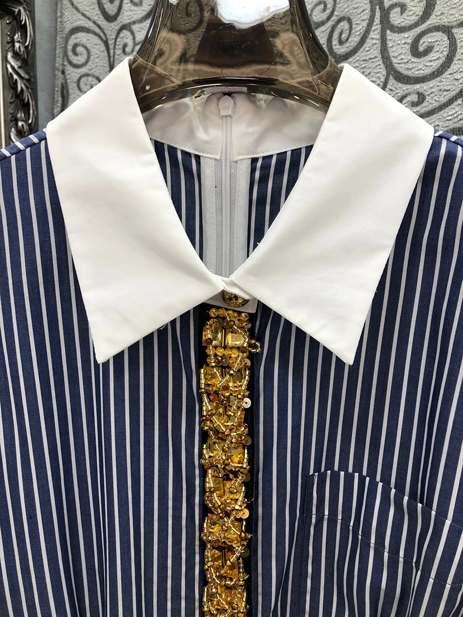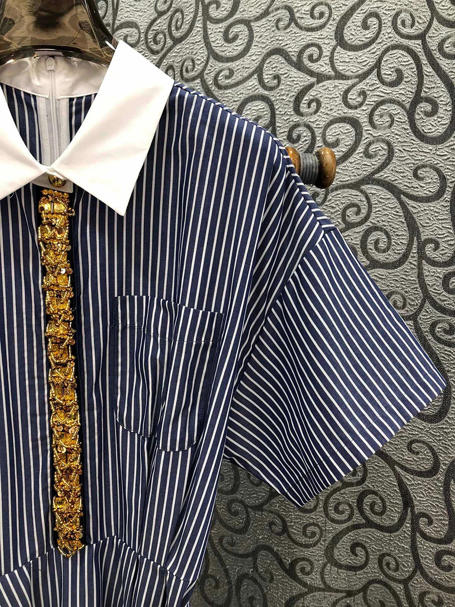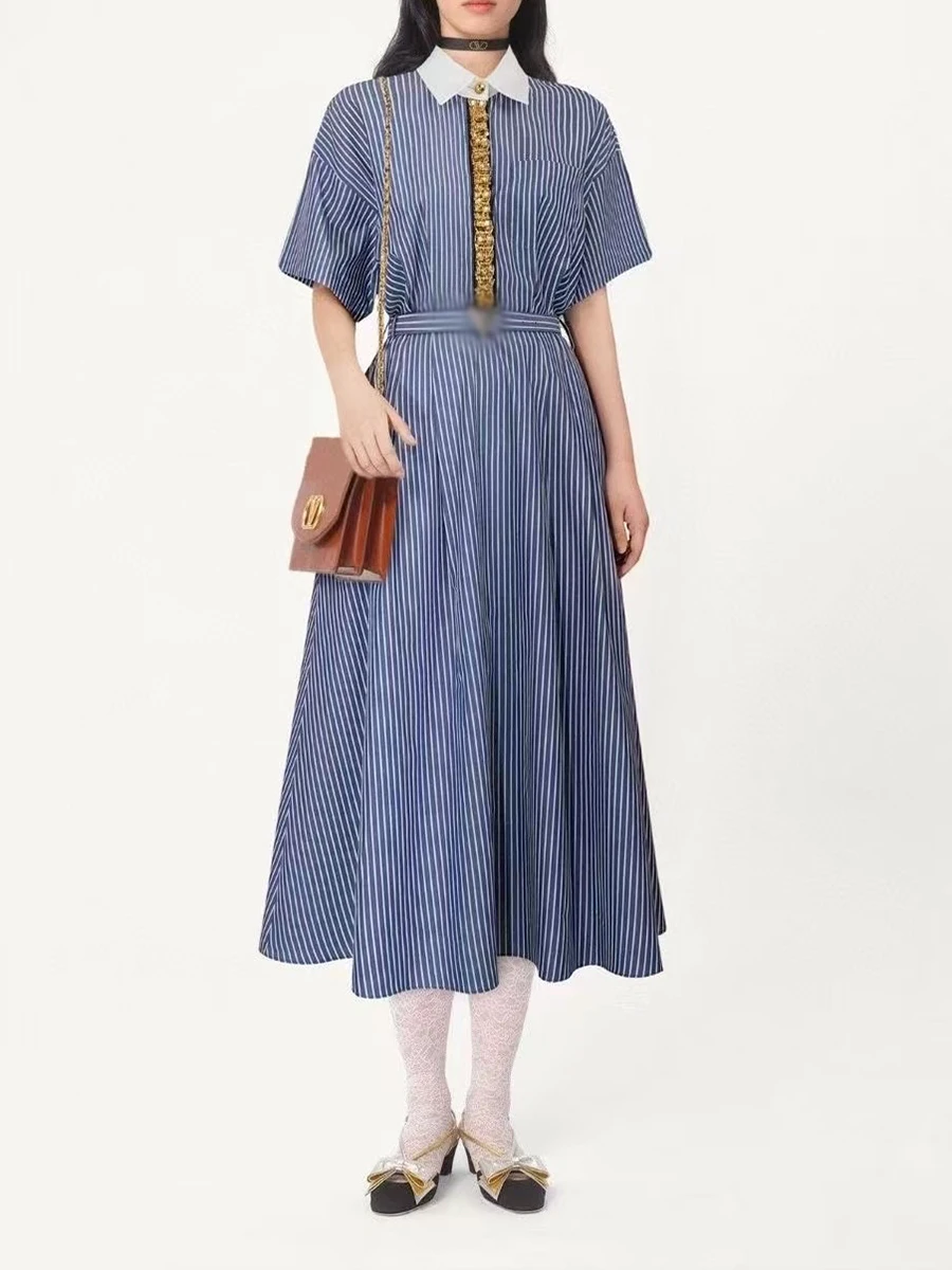 Hit Color Spliced Diamonds Dresses For Women Lapel Short Sleeve High Waist Temperament Long Dress Female Fashion