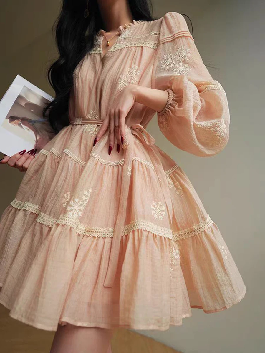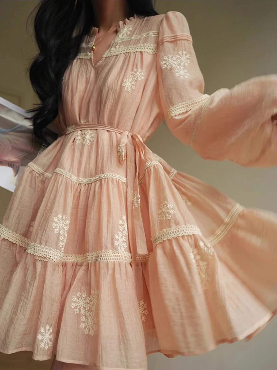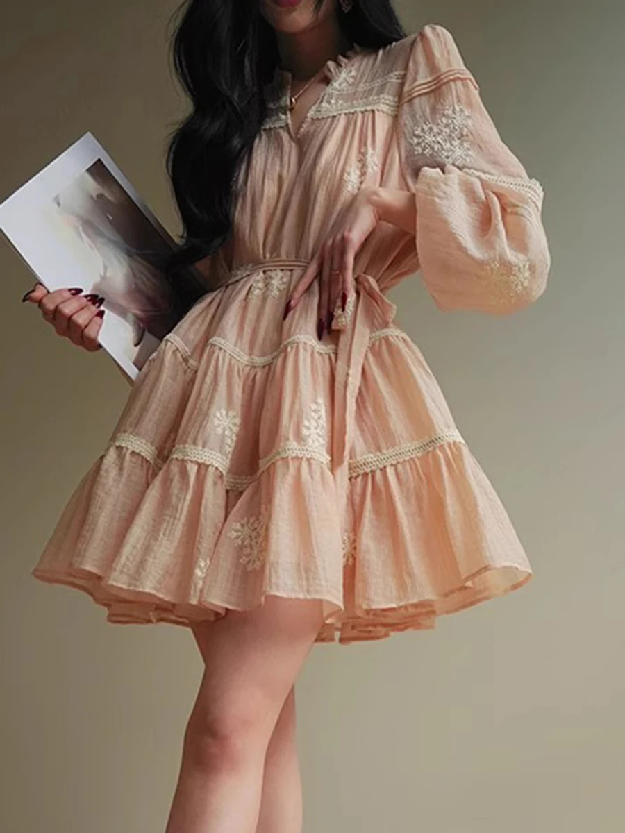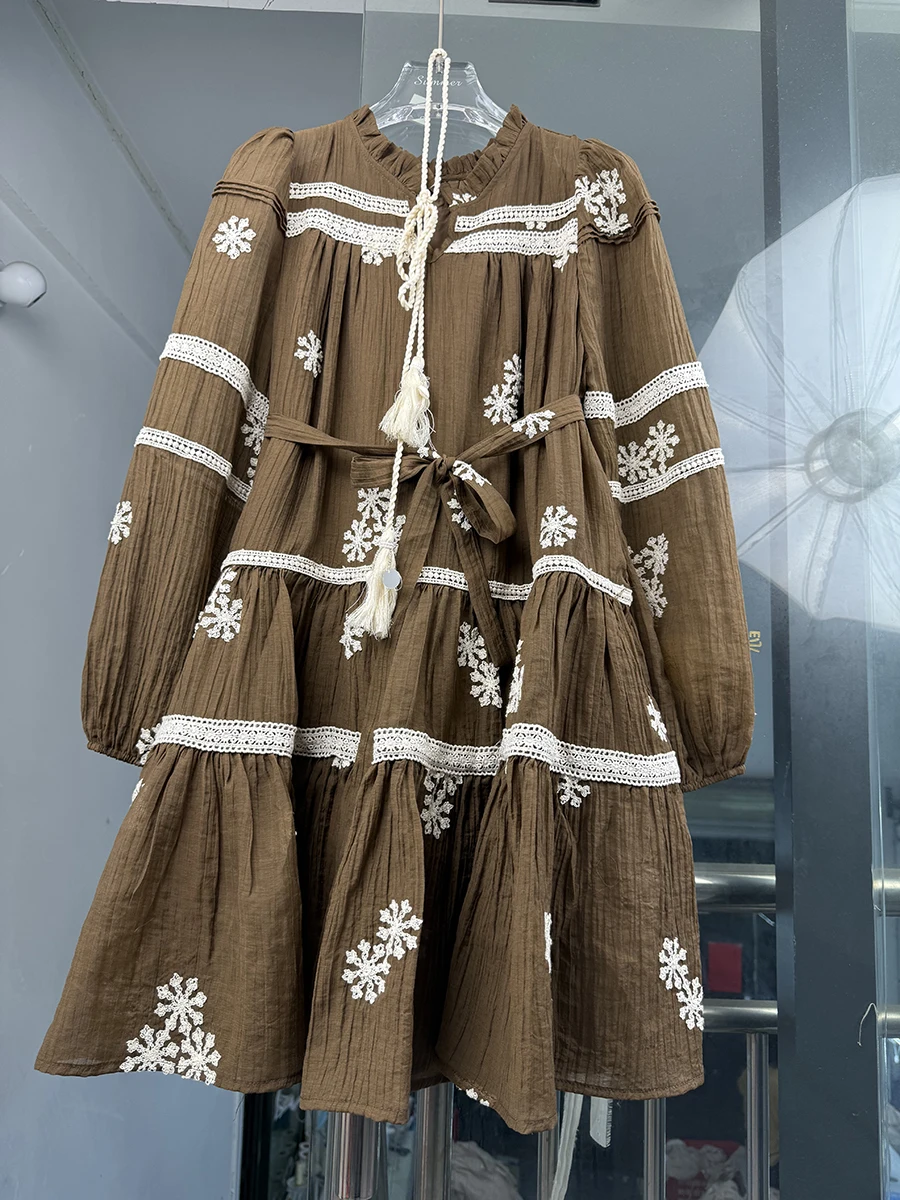 Hit Color Spliced Lace Up Loose Dresses For Women O Neck Long Sleeve High Waist Temperament Mini Dress Female New