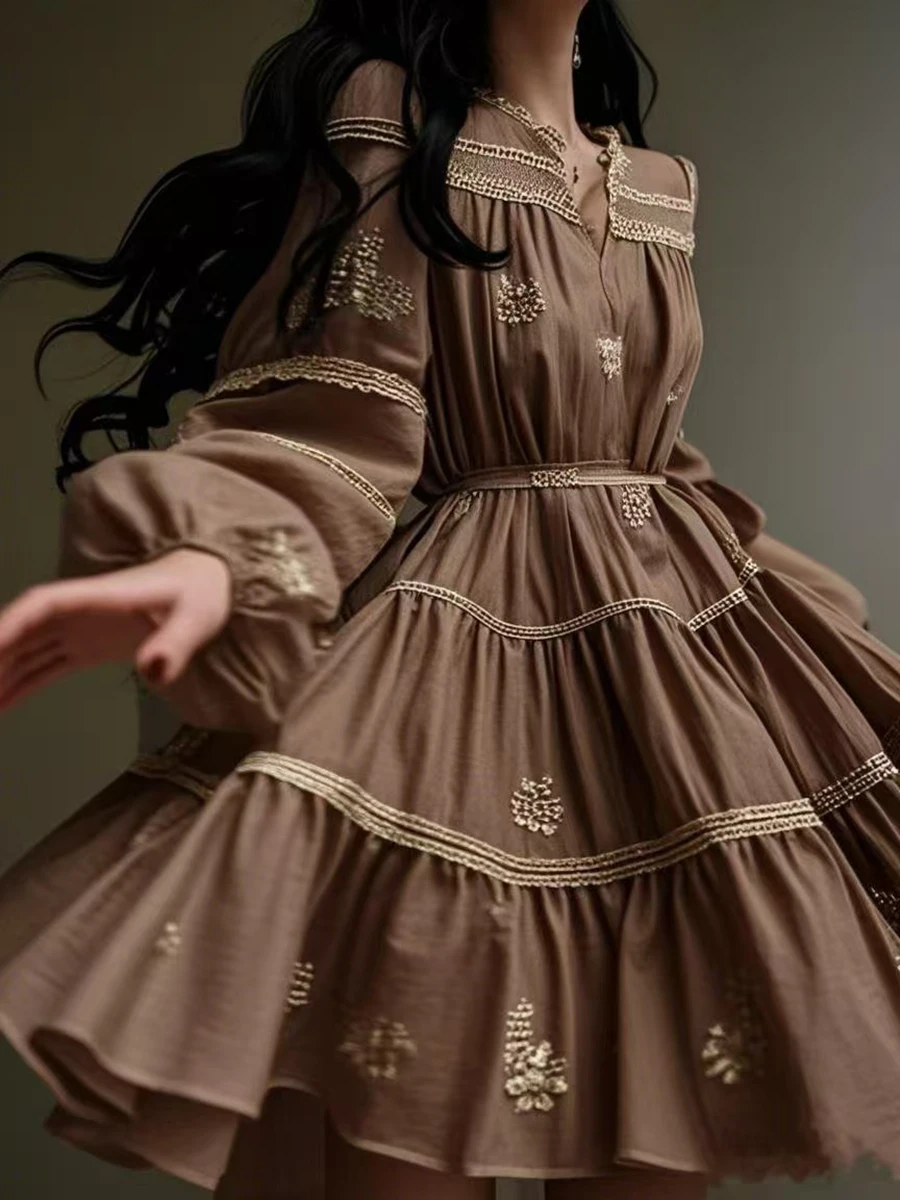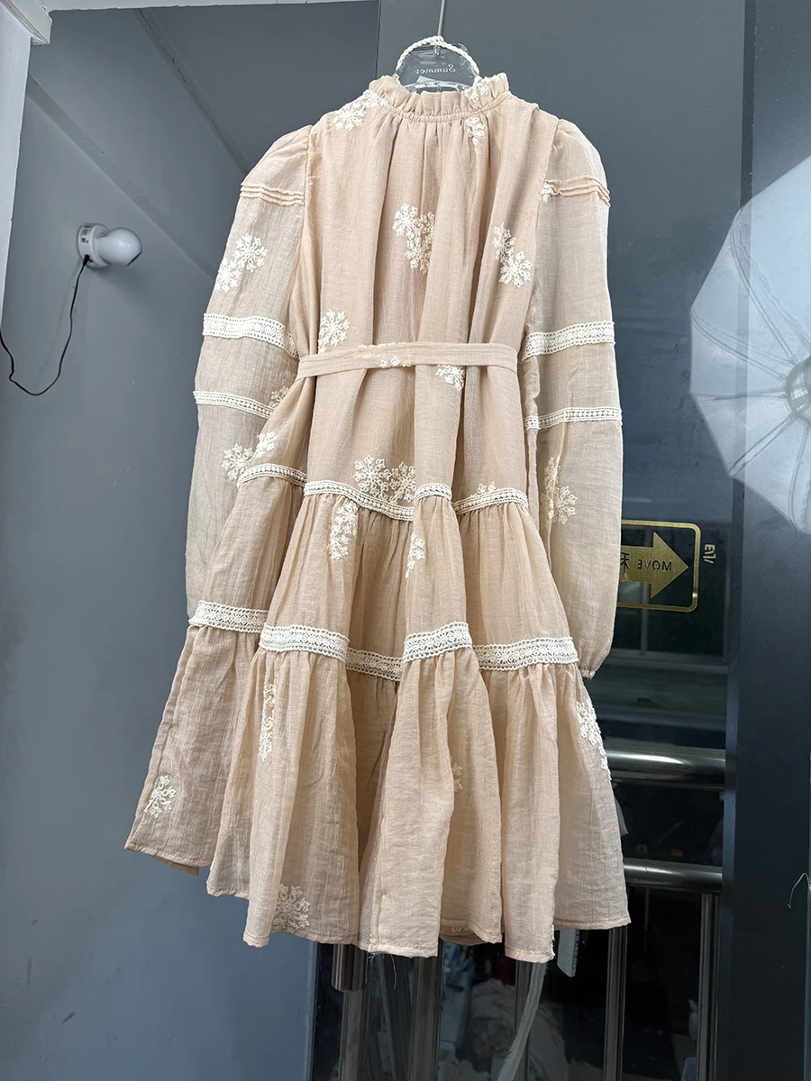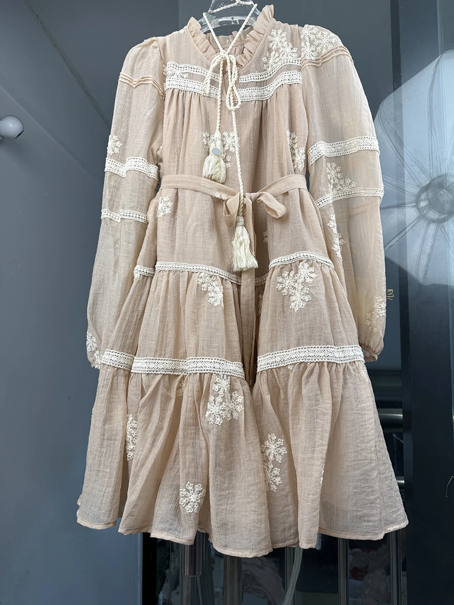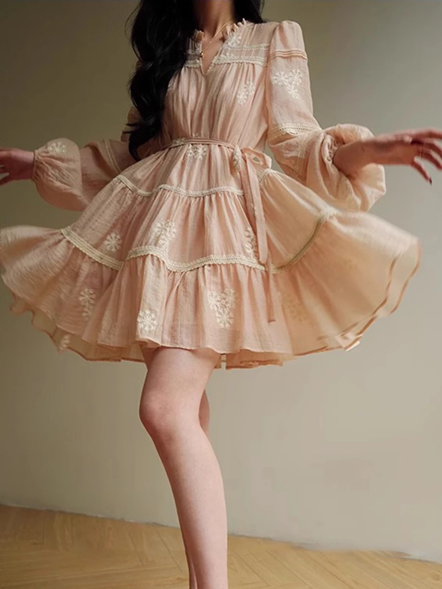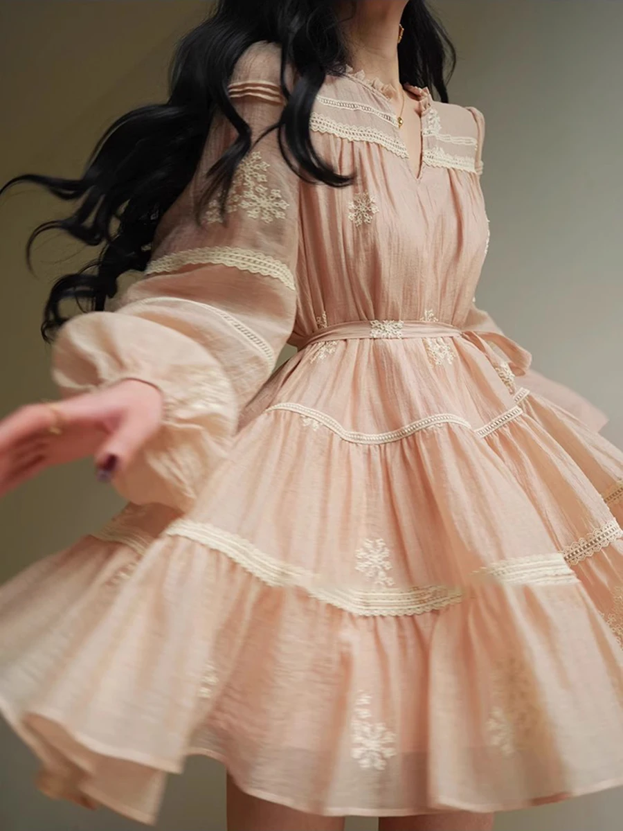 Hit Color Spliced Lace Up Loose Dresses For Women O Neck Long Sleeve High Waist Temperament Mini Dress Female New