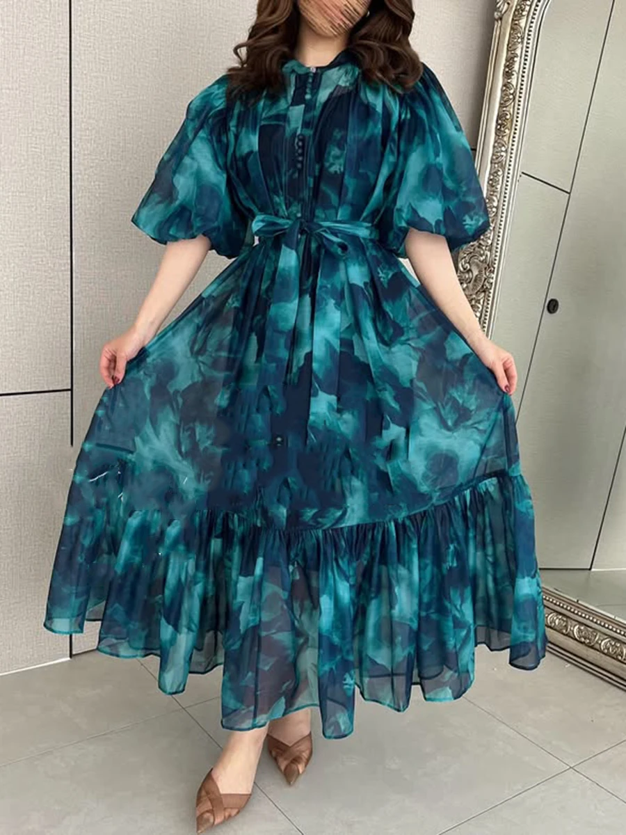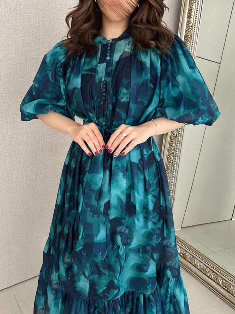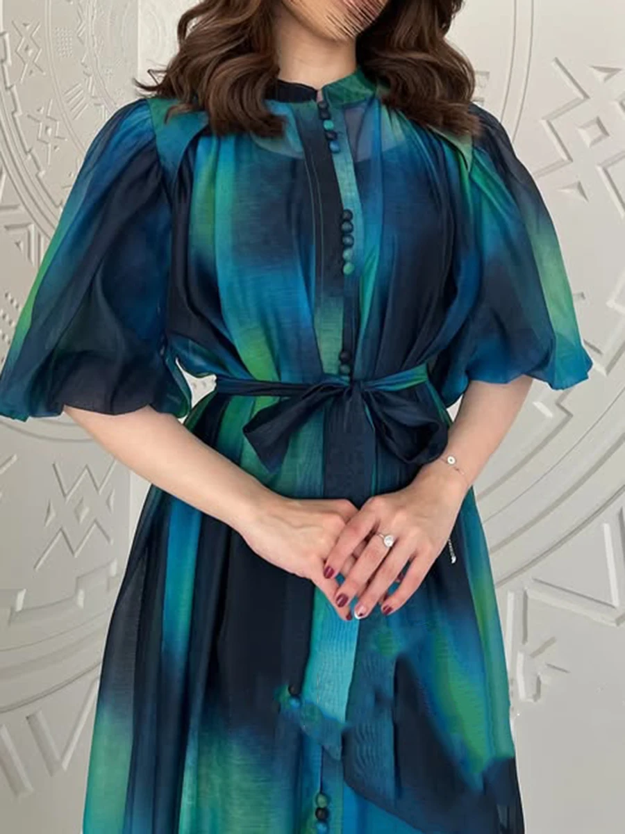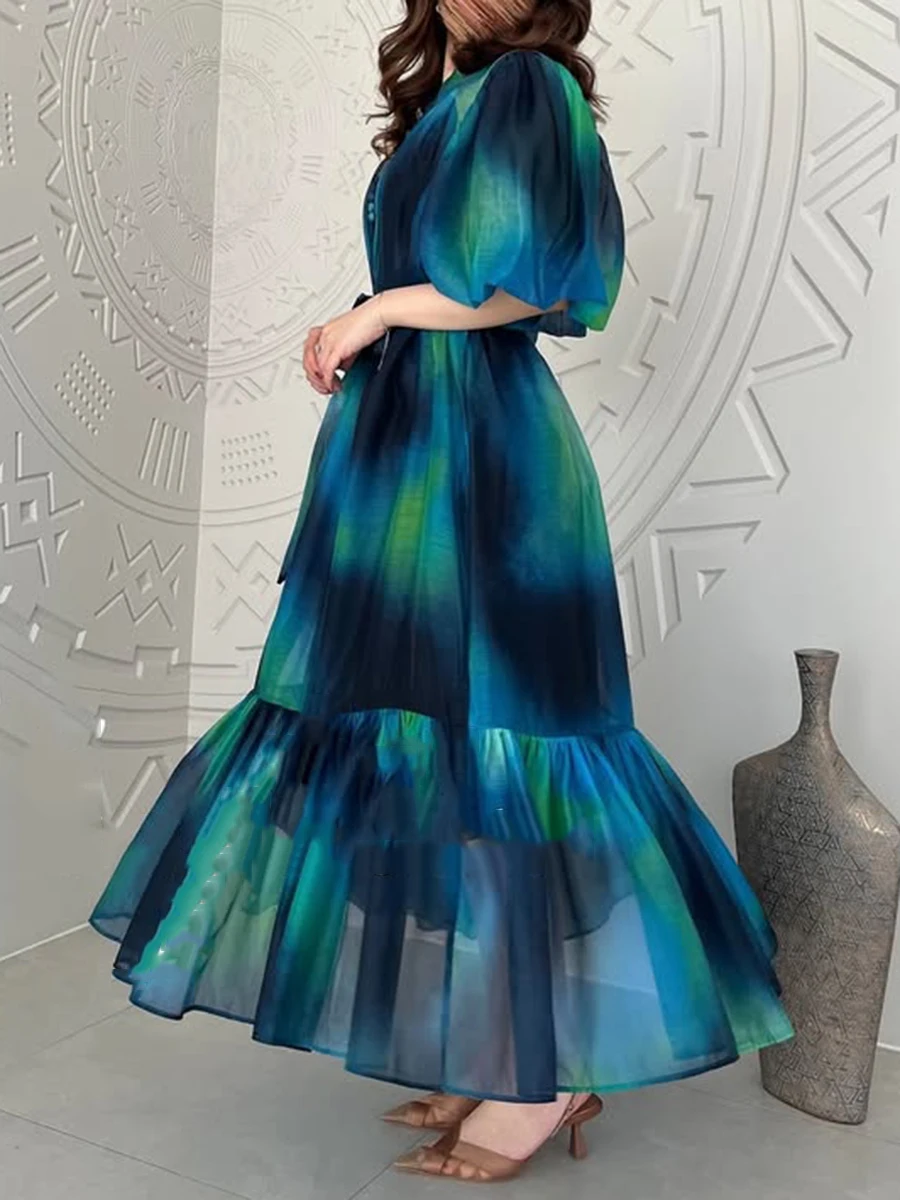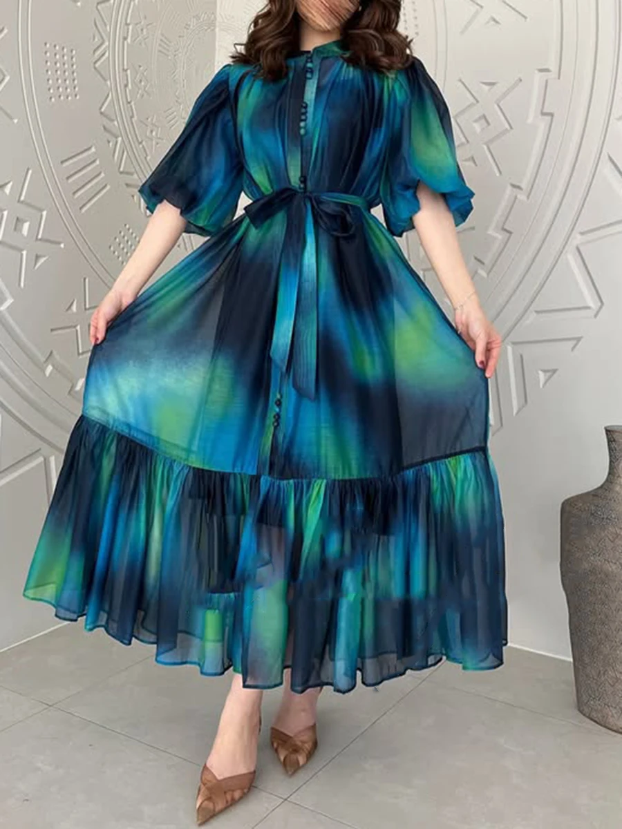 Hit Color Spliced Lace Up Loose Dresses For Womne O Neck Half Sleeve High Waist Long Dress Female Fashion Style New