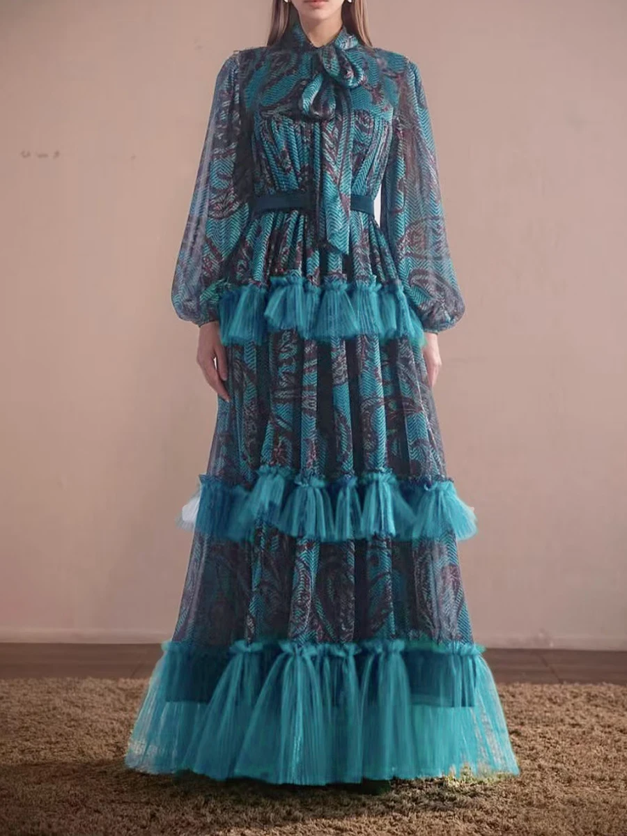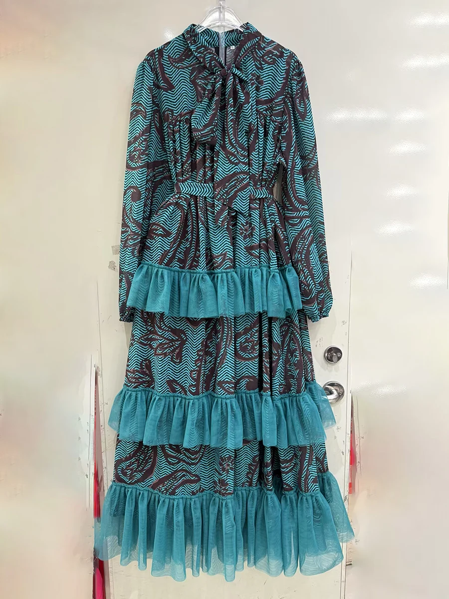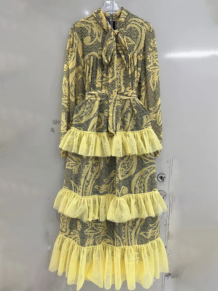 Hit Color Spliced Ruffles Dresses For Women O Neck Long Sleeve High Waist Temperament Long Dress Female Fashion New