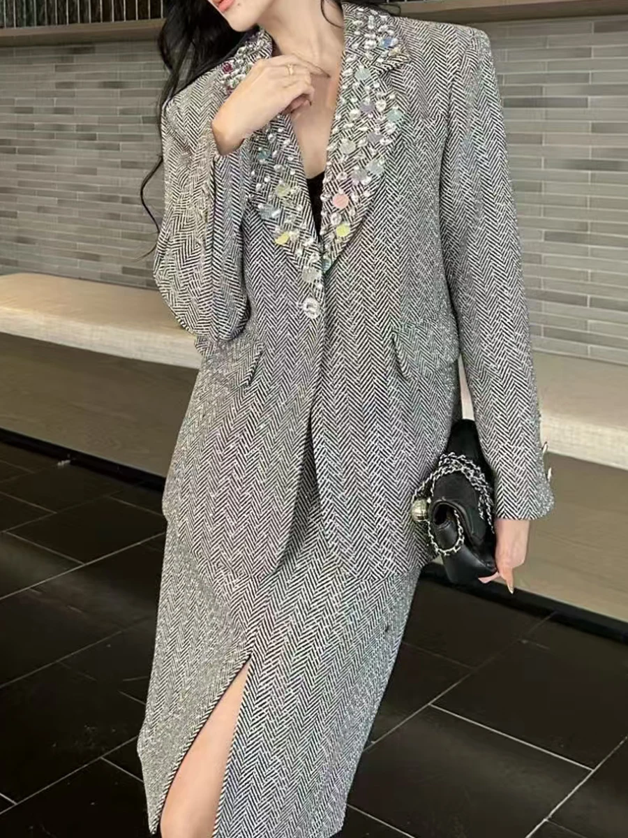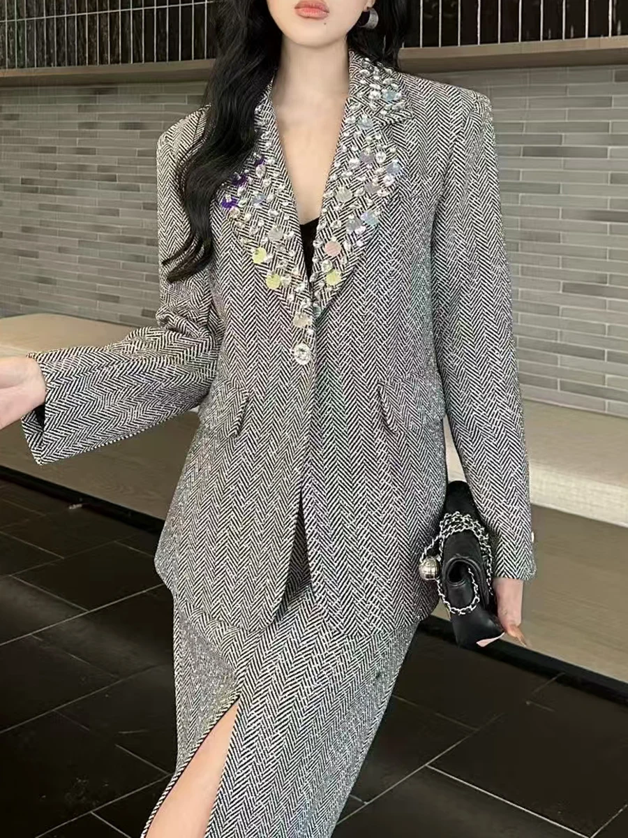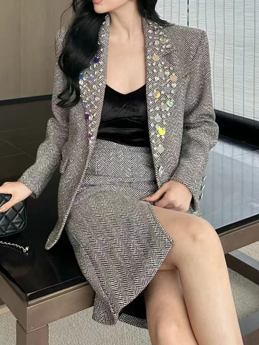 Hit Color Spliced Sequines Two Piece Set For Women Lapel Long Sleeve Coat High Waist Temperament Skirts Sets Female