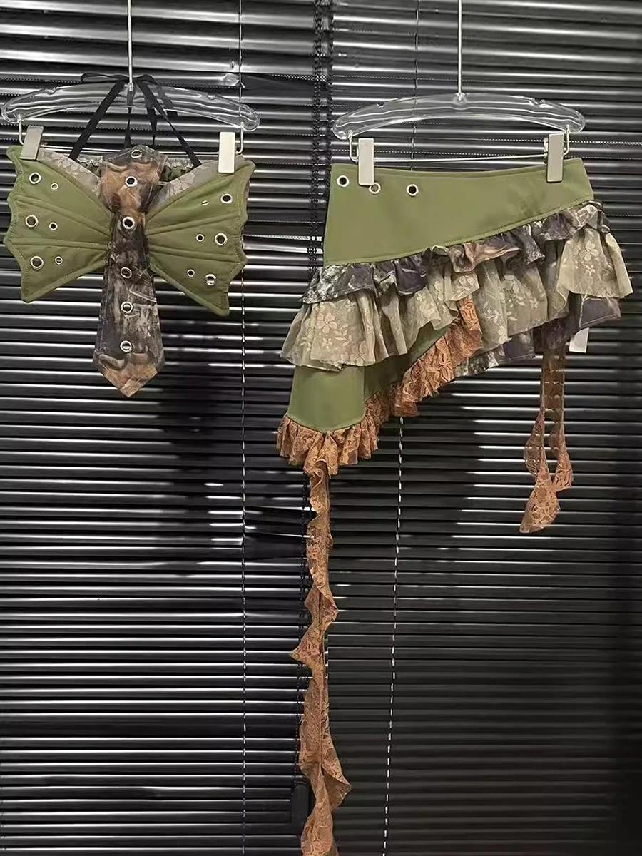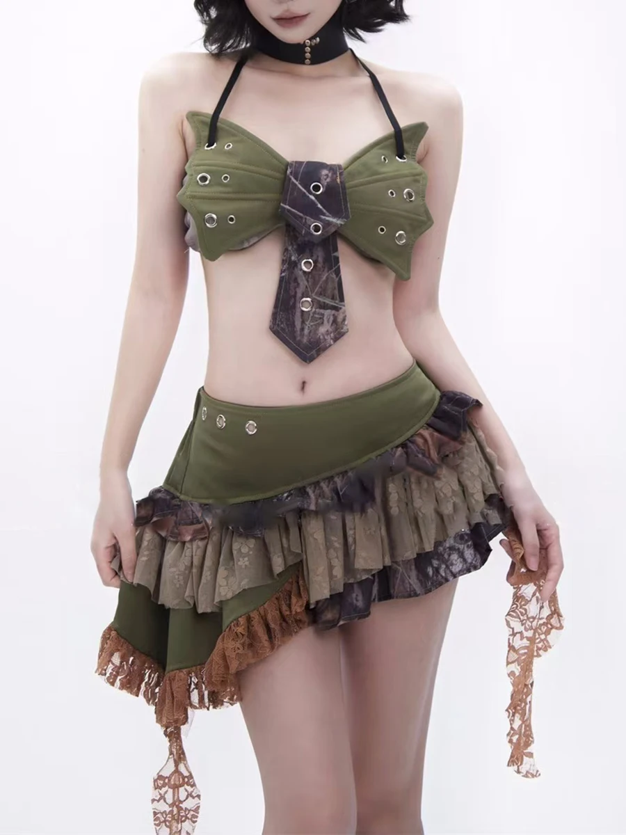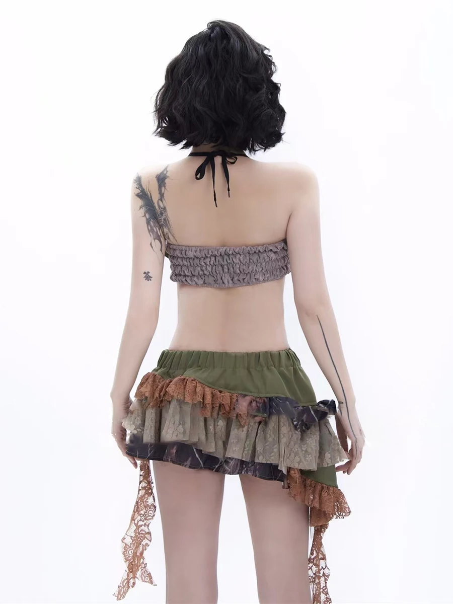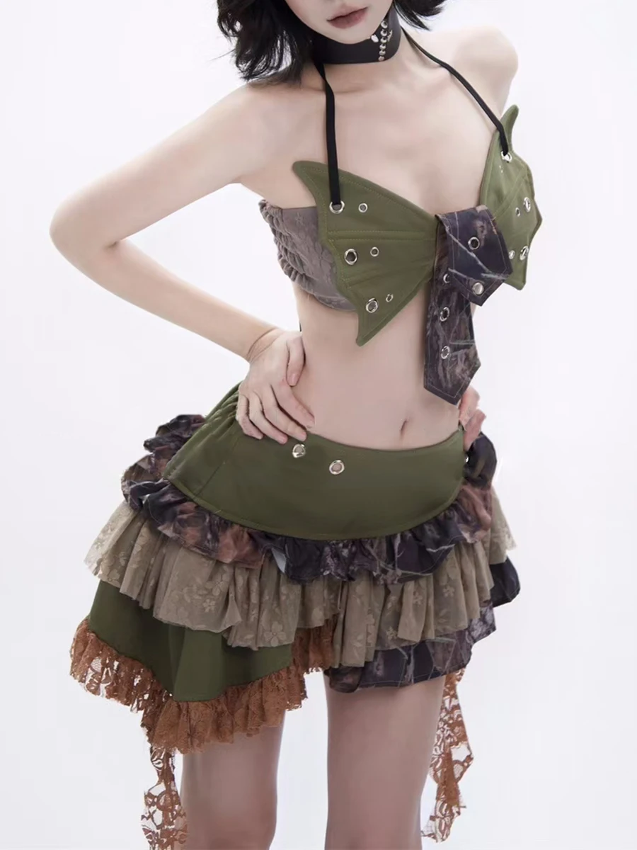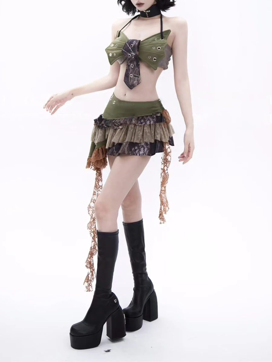 Hit Color Two Piece Set For Women Halter Sleeveless Top High Waist Temperament Mini Skirts Female Fashion Style New