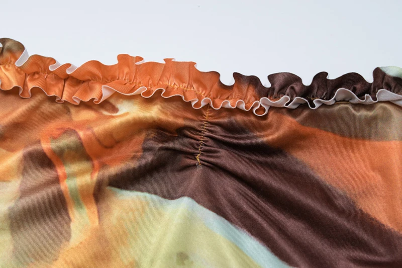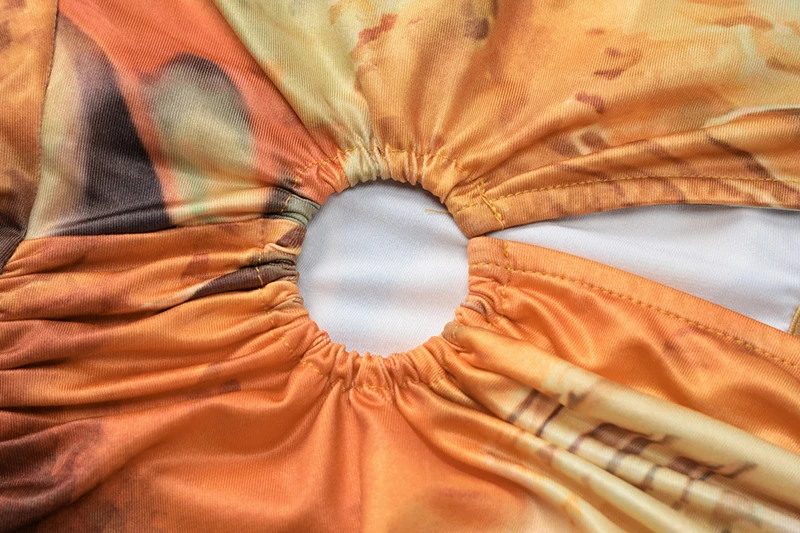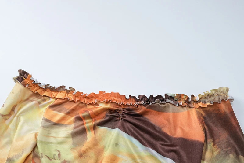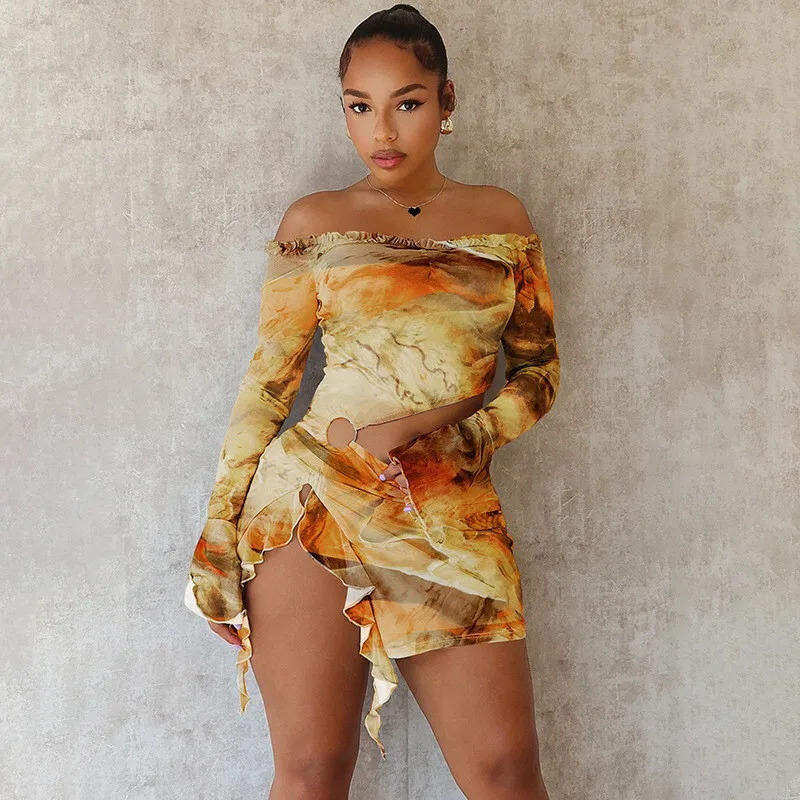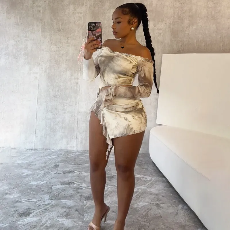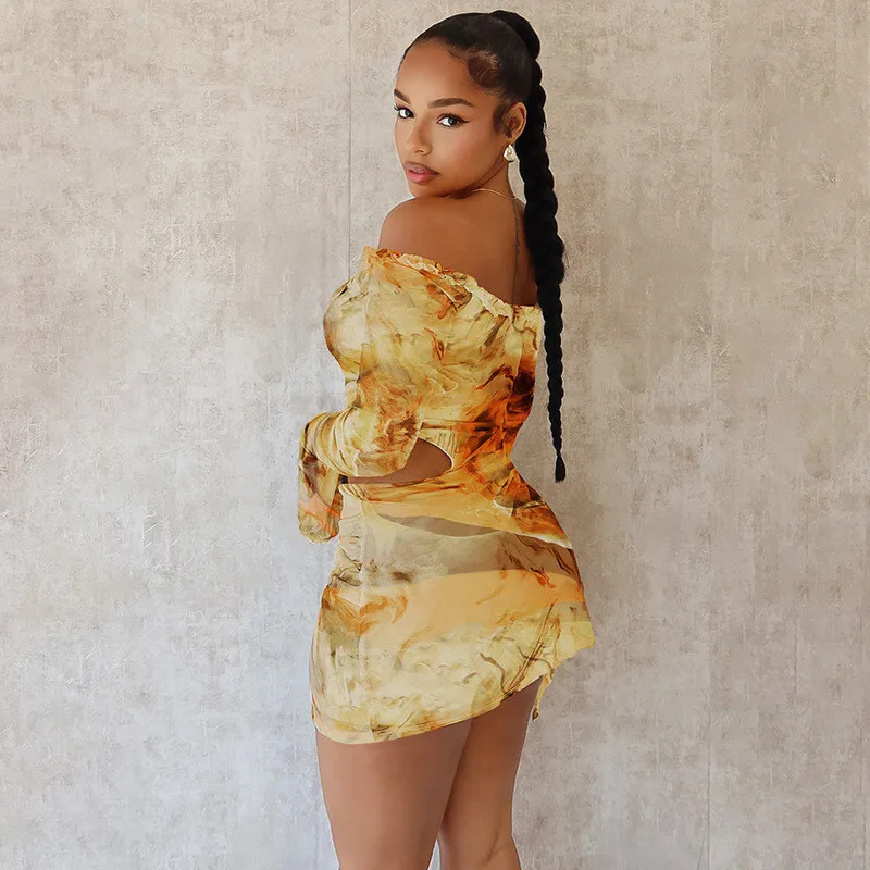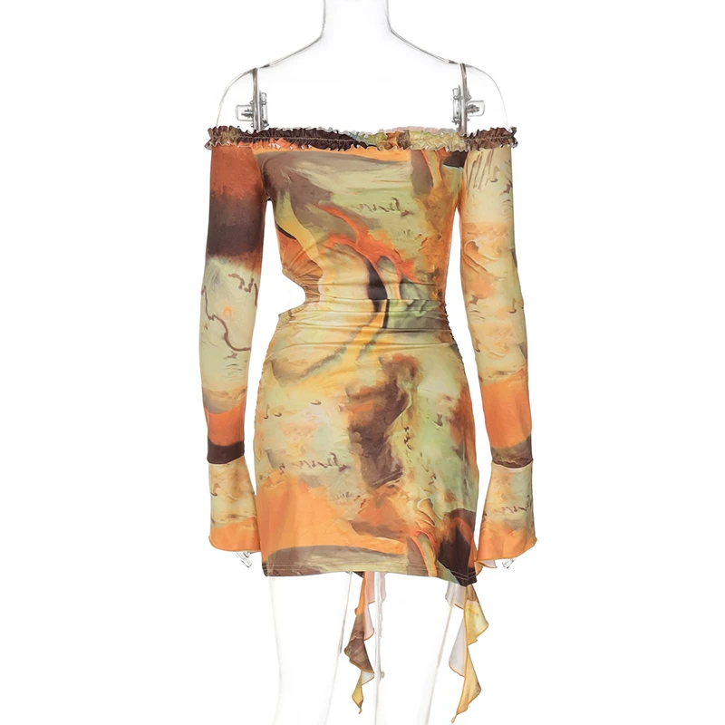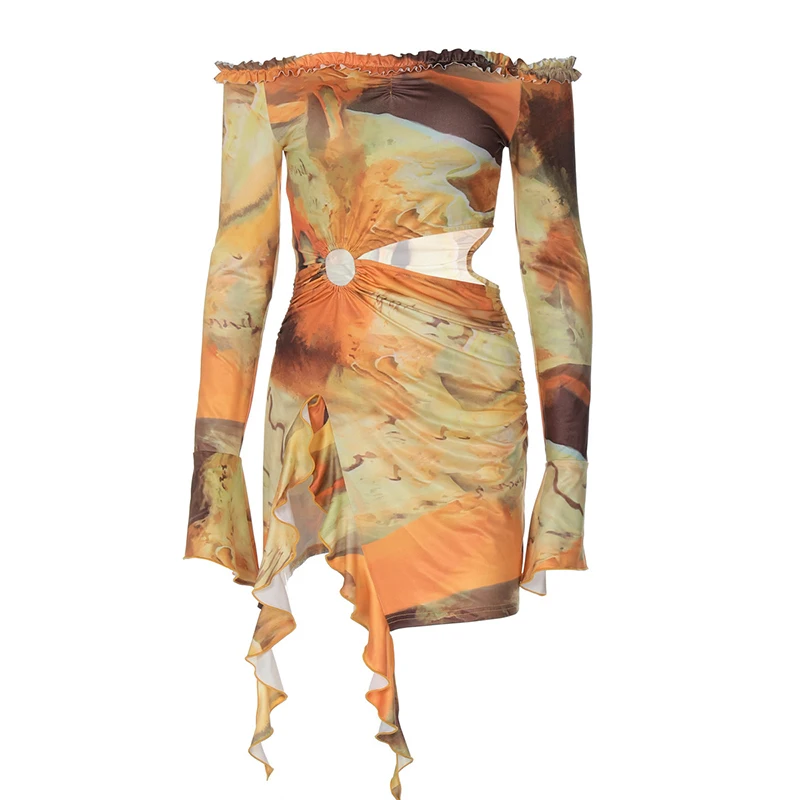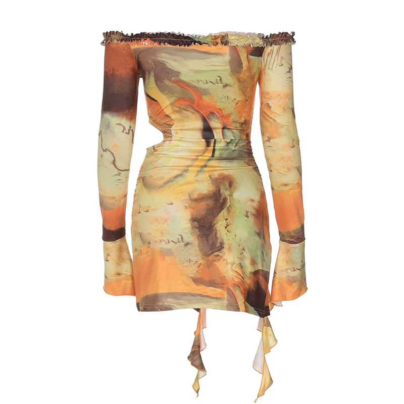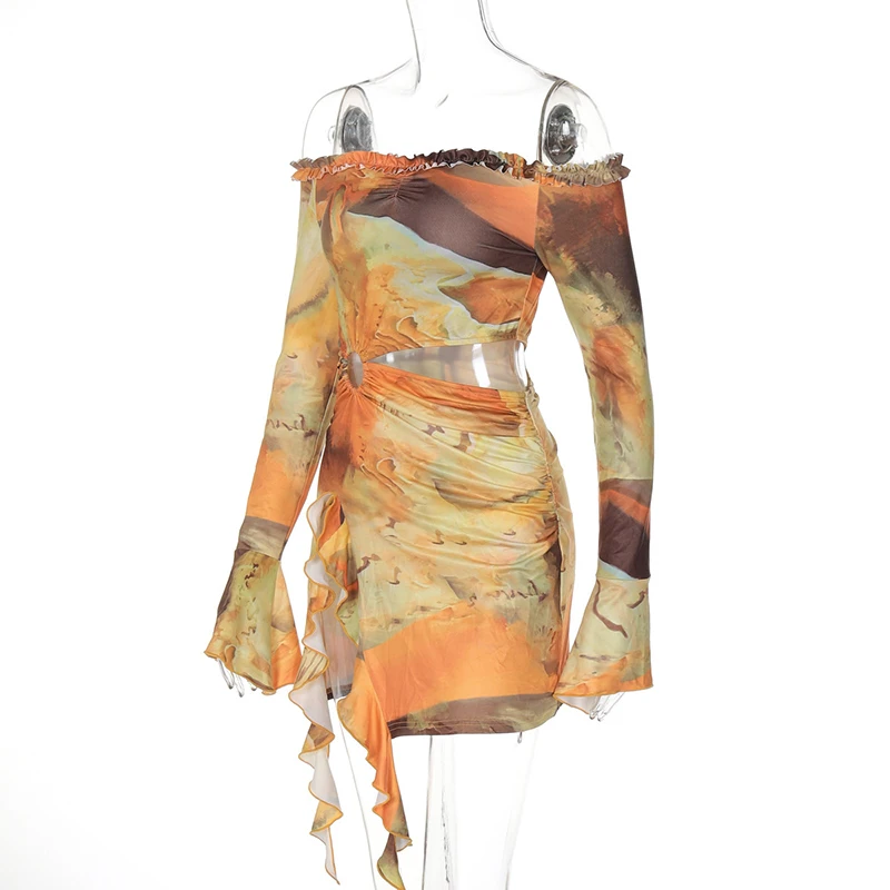 Hollow Out Print Sexy Mini Dress For Women Autumn New Off-shoulder Long Sleeve Bodycon Ruffled Slit Sexy Dress New