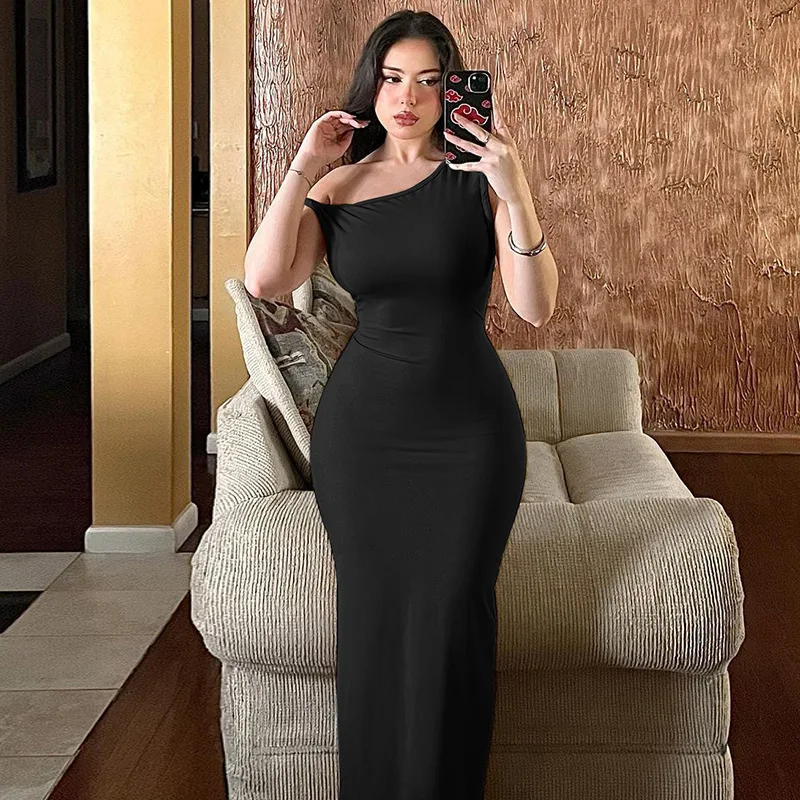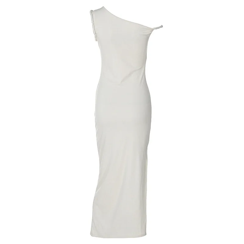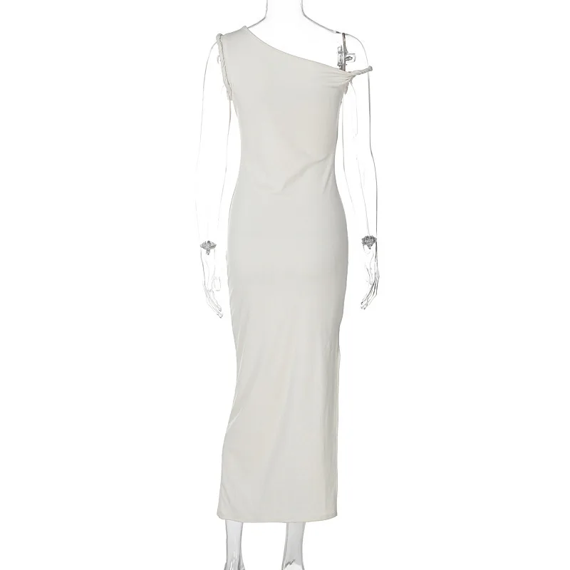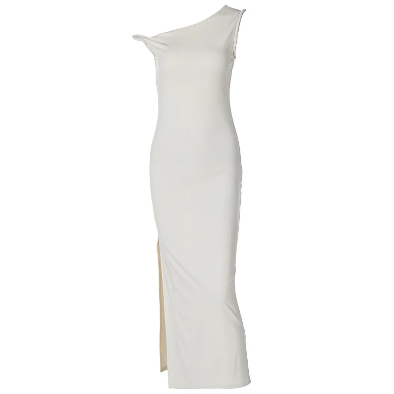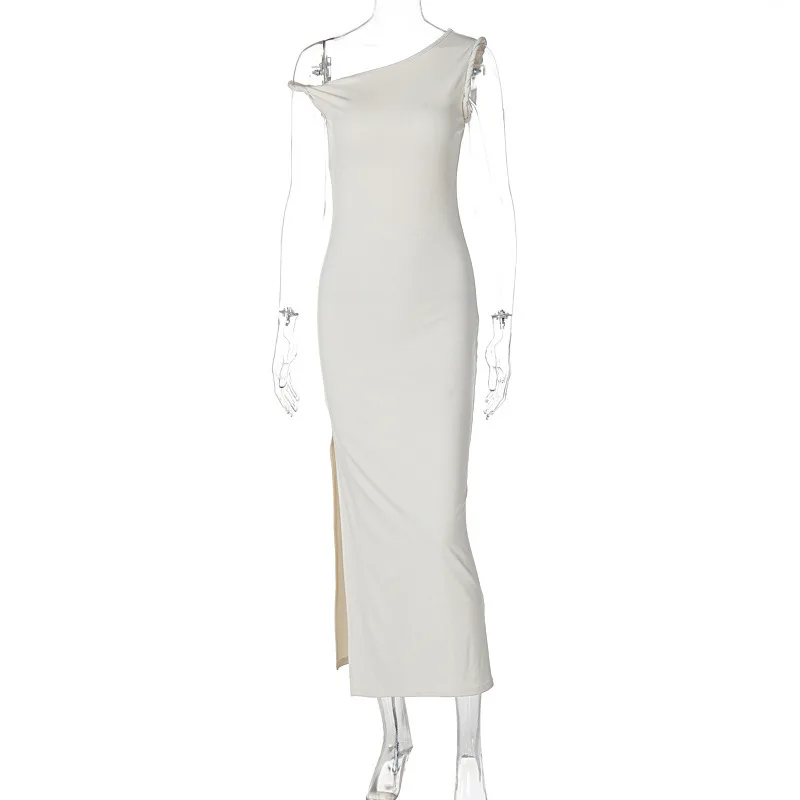Inclined Shoulder Backless Slit Maxi Dress For Women Fashion Diagonal Collar Sleeveless Bodycon Sexy Long Dress Elegant