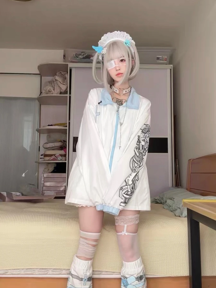 Japanese Kawaii Fashion Jacket Women Y2k Aesthetic Zipper Coat Loose Simple Coats Casual Harajuku Cartoon Skull Print Jackets