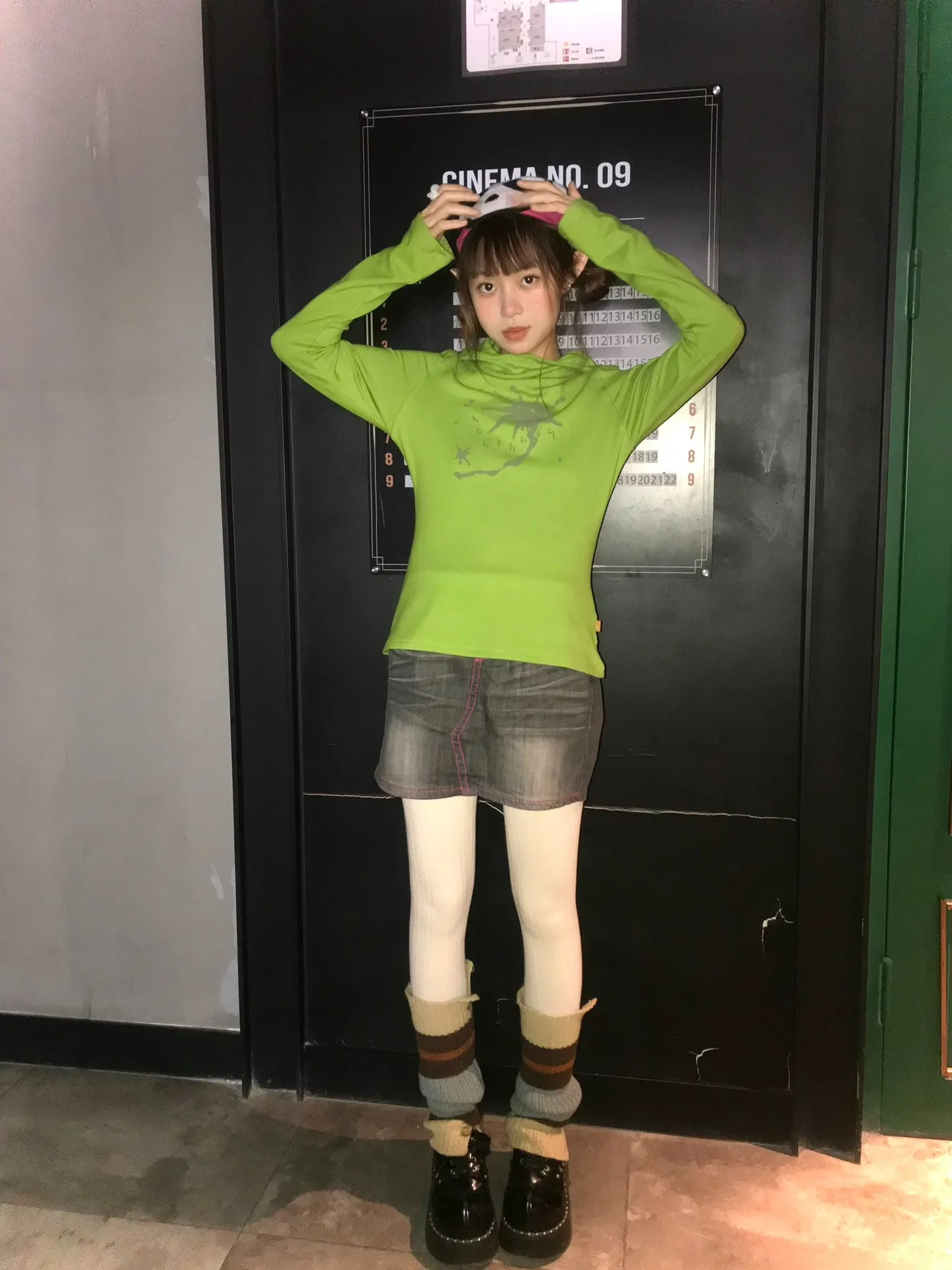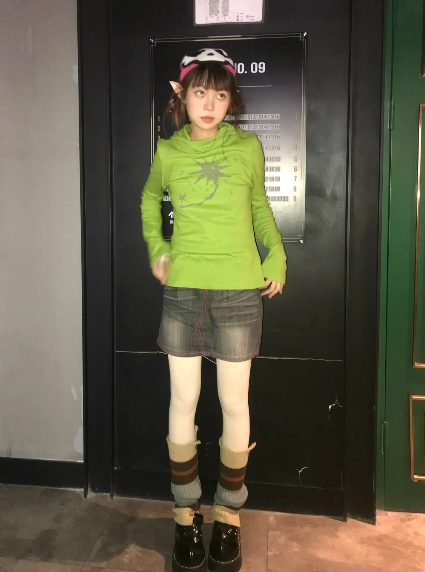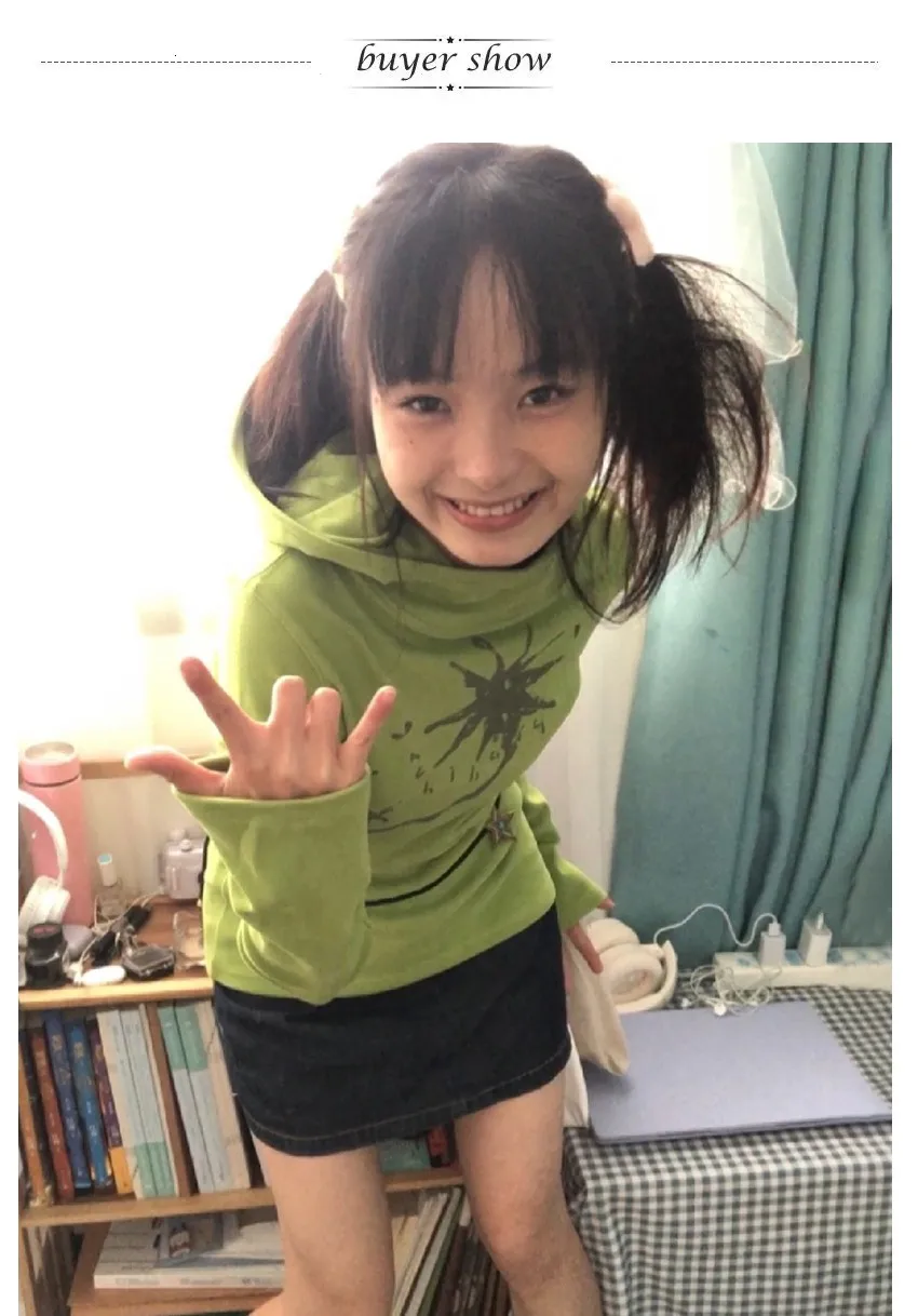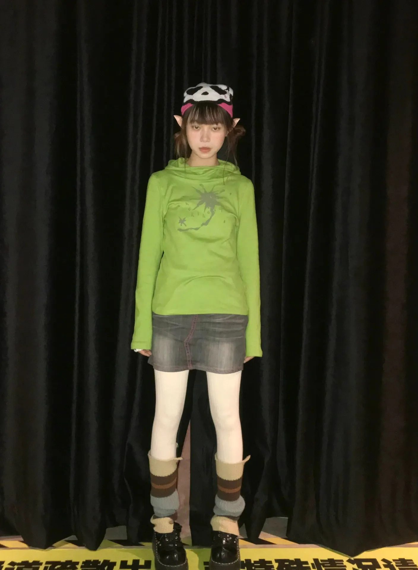 Japanese Y2k Hooded T-shirt Grunge Aesthetics Green Long Sleeve Tee Shirt Vintage Harajuku Hooded Tops 2000s Streetwear