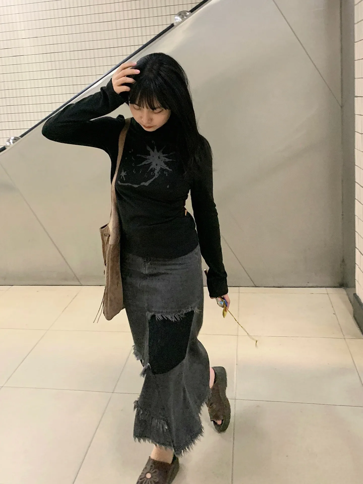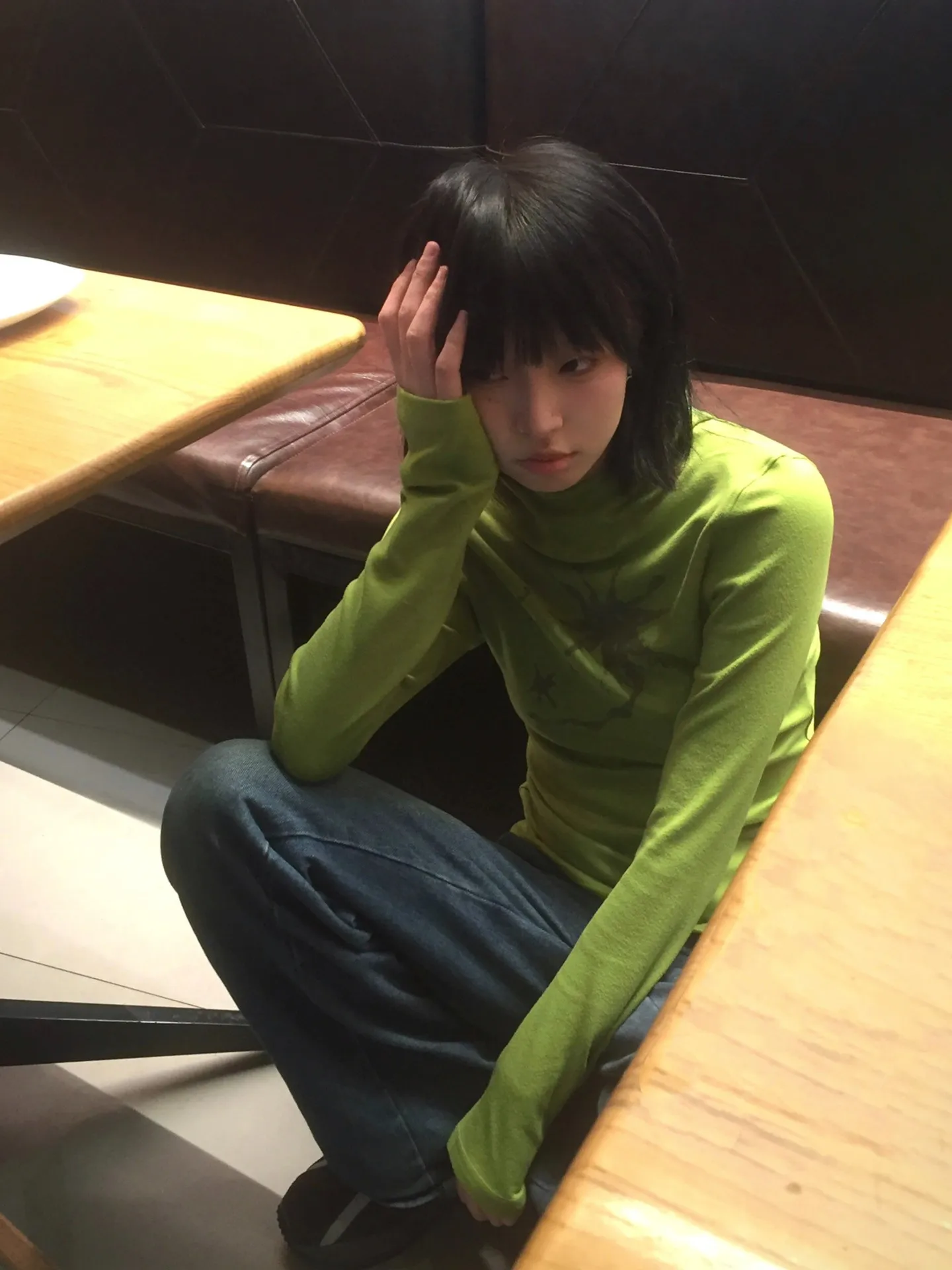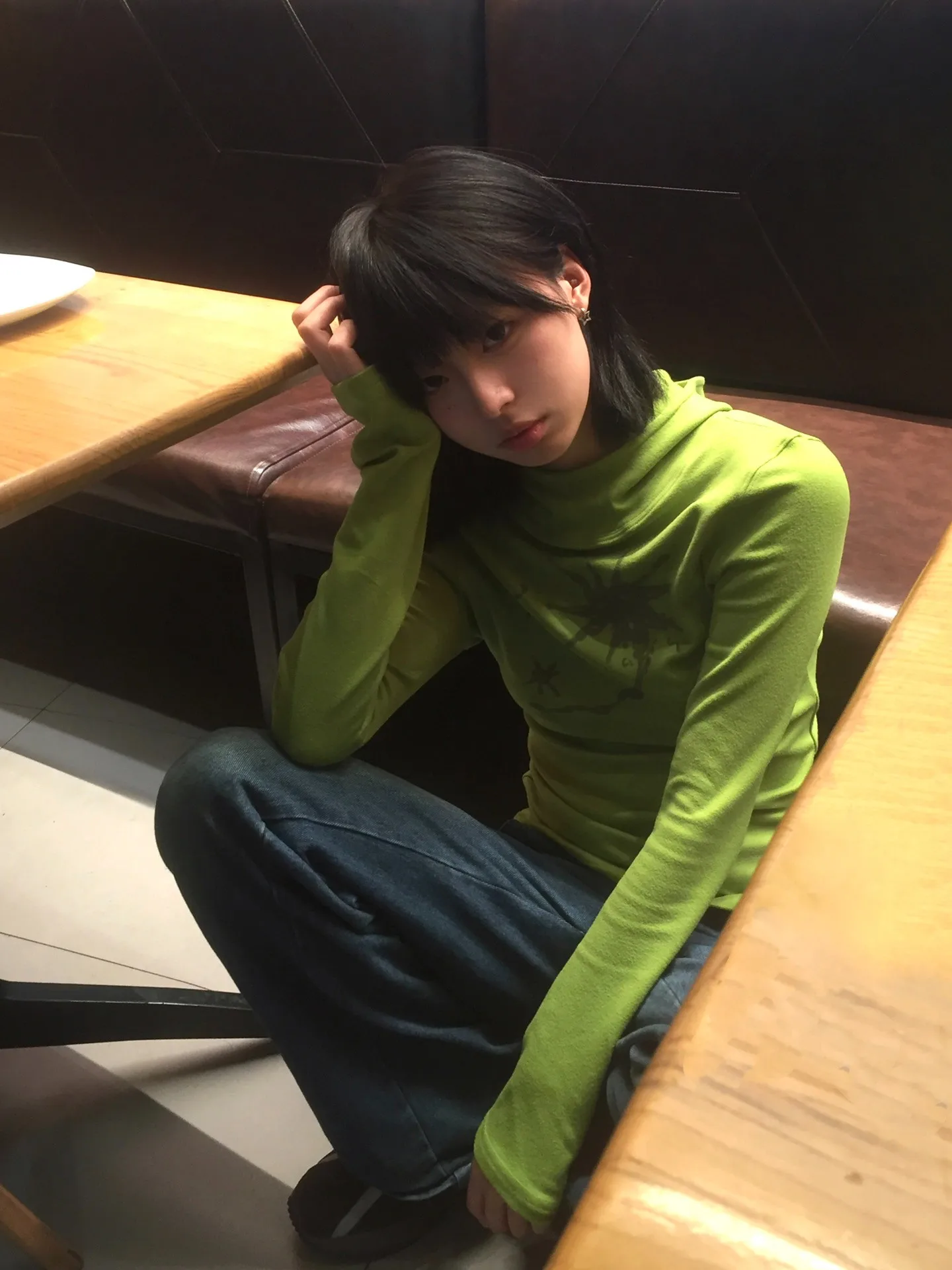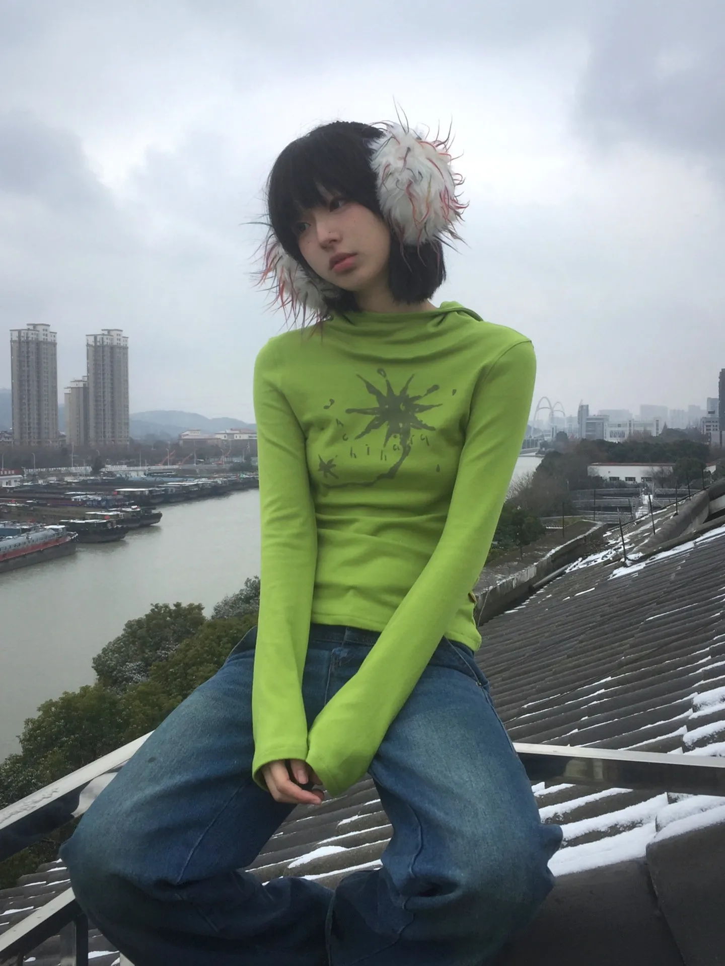 Japanese Y2k Hooded T-shirt Grunge Aesthetics Green Long Sleeve Tee Shirt Vintage Harajuku Hooded Tops 2000s Streetwear