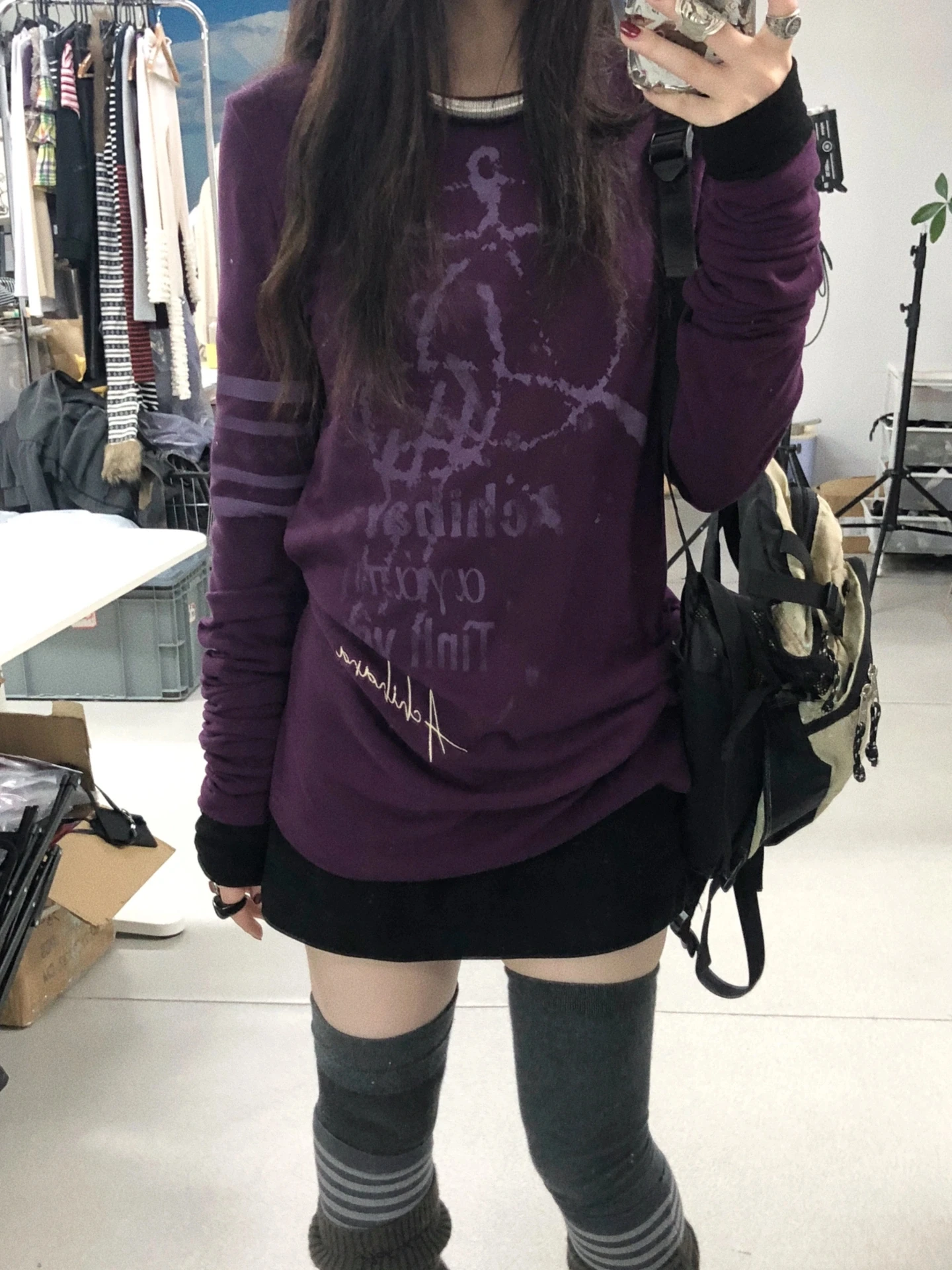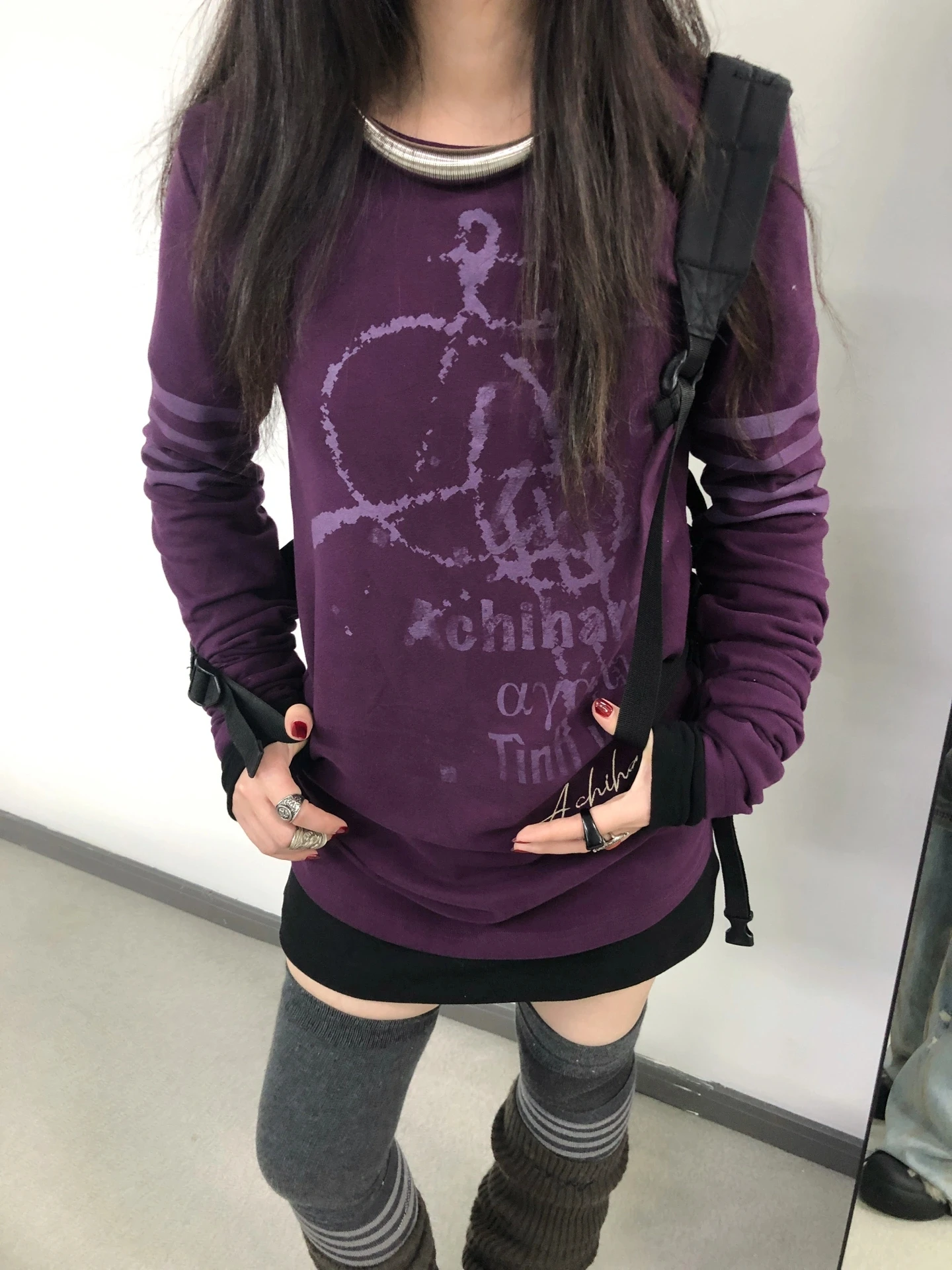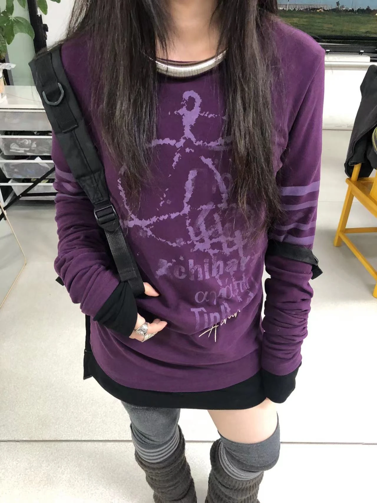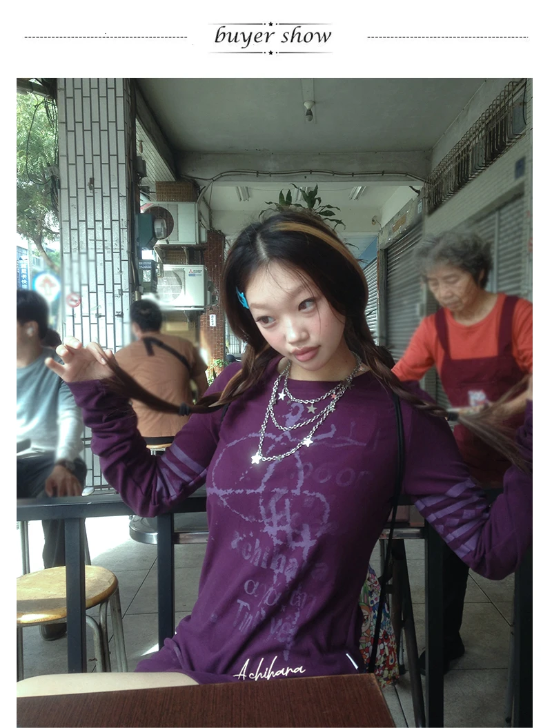 Japanese Y2k Letter Print T-shirt Grunge 2000s Style Long T Shirt Vintage Harajuku Long Sleeve Purple Top American Retro