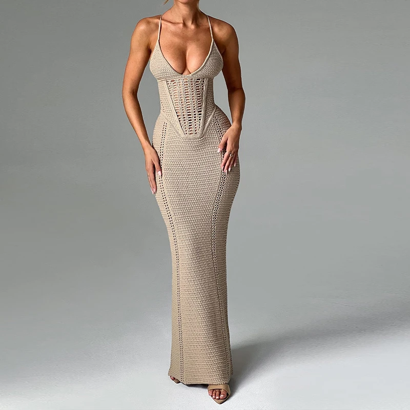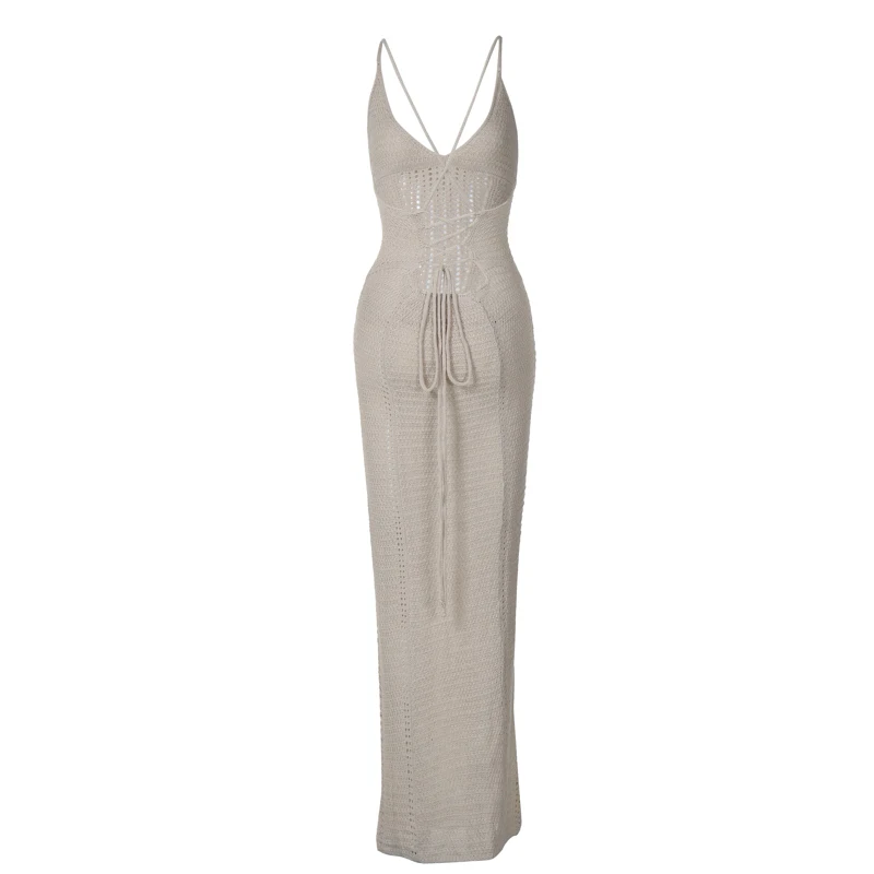 Knitted Solid V Neck Slips Backless Bandage Sexy Bodycon Maxi Dress Summer Women Fashion Outfits Beach Vacation